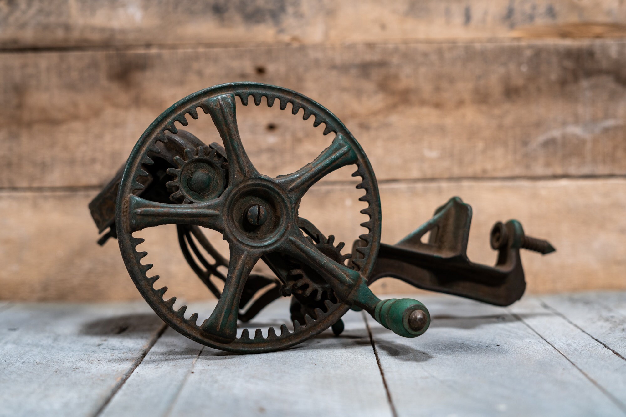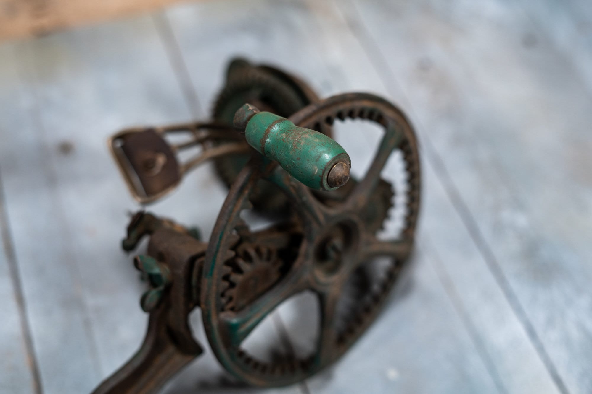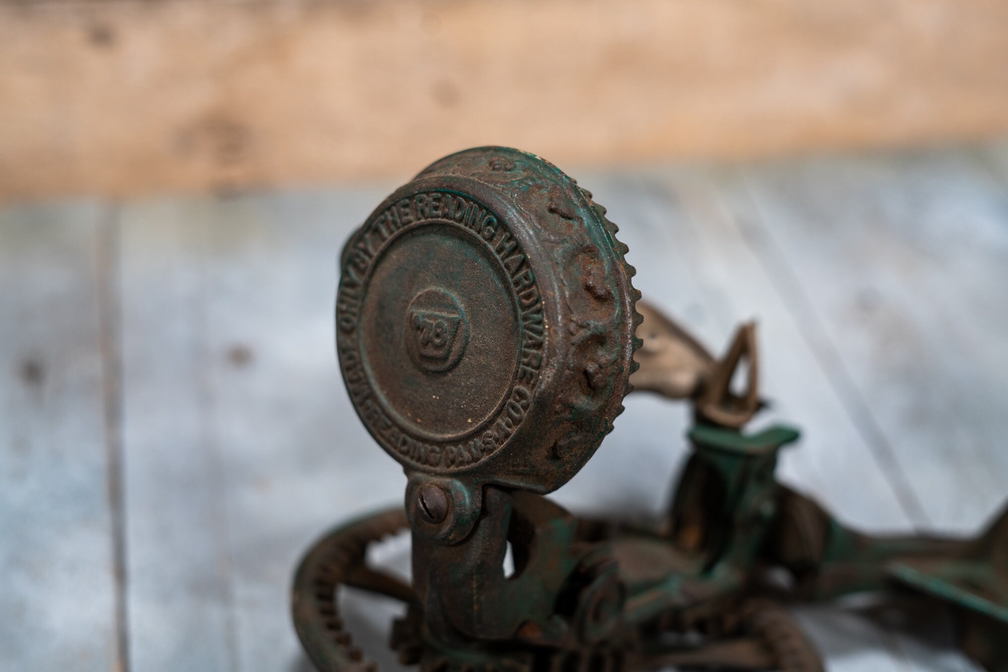 Check out this Cast Iron Apple Peeler made by The Reading Hardware Co. in Reading, PA. The handle still turns and everything seems to move how it should be. This is however not tested and could use a really good cleaning. There is wear but nothing major. It is approx. 11 x 8 x 6 1/2 inches. It has a clamp so that it could be attached to a table top and features a wooden handle. It would make a great display piece. Please check out the photos for a closer look and if you have any questions please let me know.