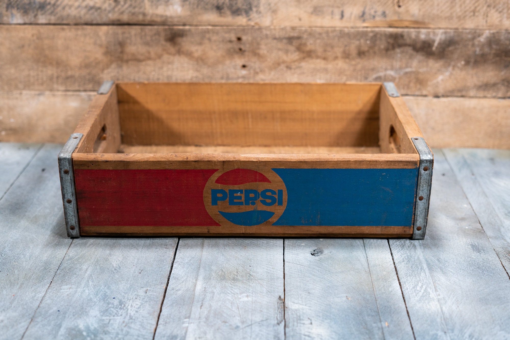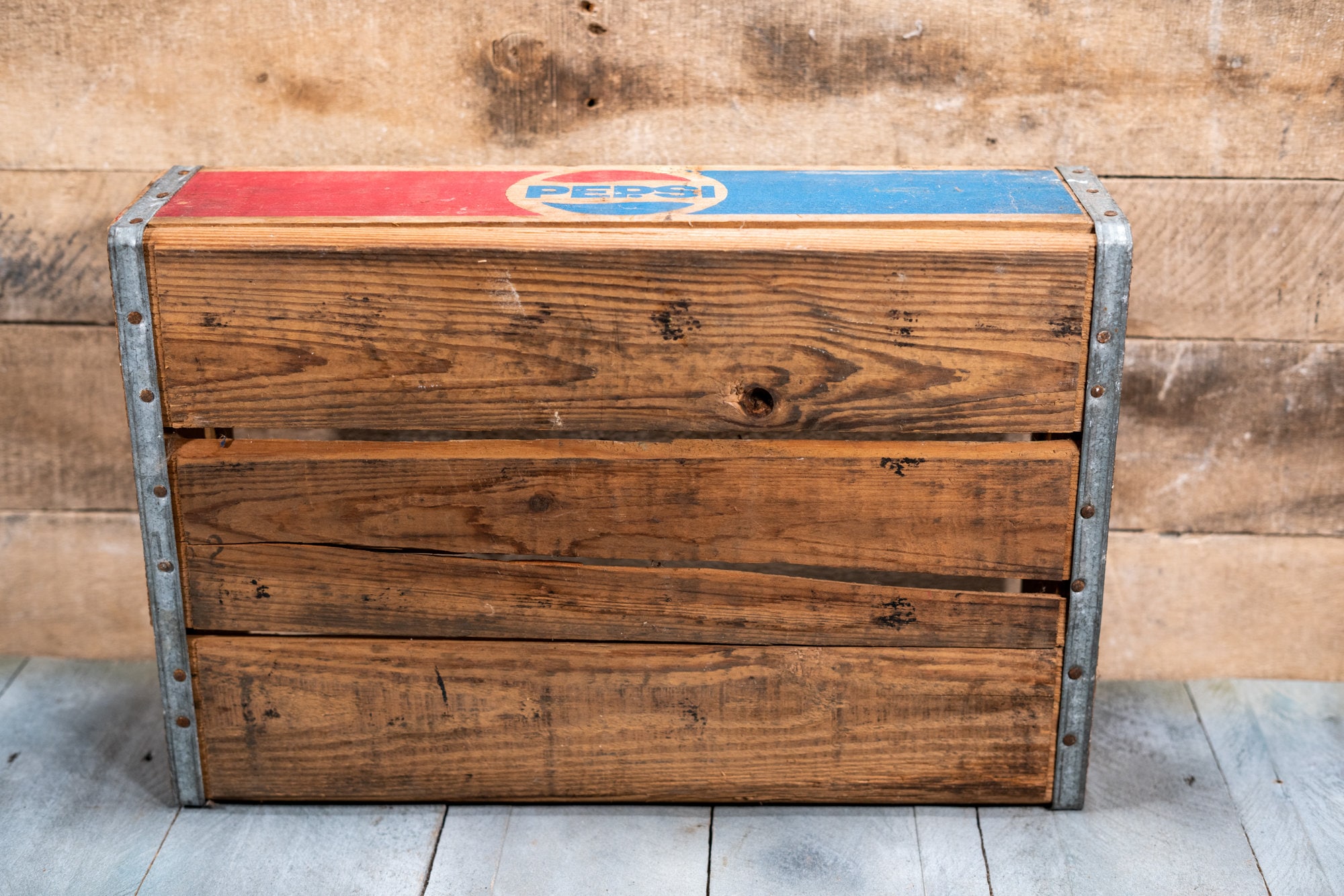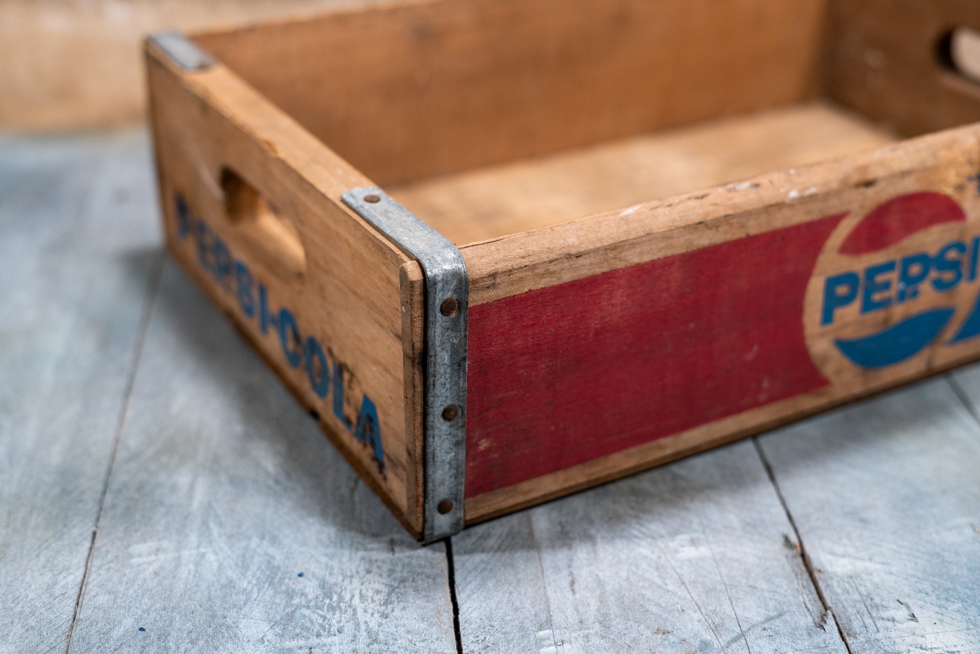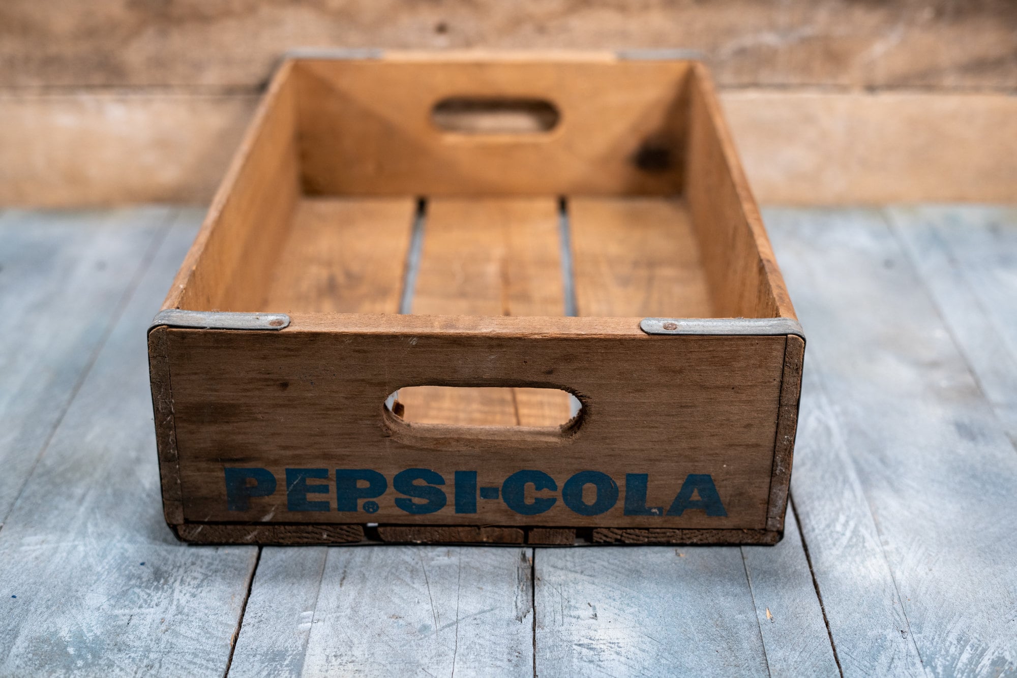 Anytime we see a crate we have to pick them up. This is a Pepsi Soda Pop Wooden Crate. It features the classic Pepsi red and blue color logo. It measures approx. 18 x 12 x 4 1/2 inches. It does have some wear, scratches and dings. The bottom of the crate has a cracked panel. This would make a great display piece. Please check out the photos for a closer look and if you have any questions please let me know. Thanks!