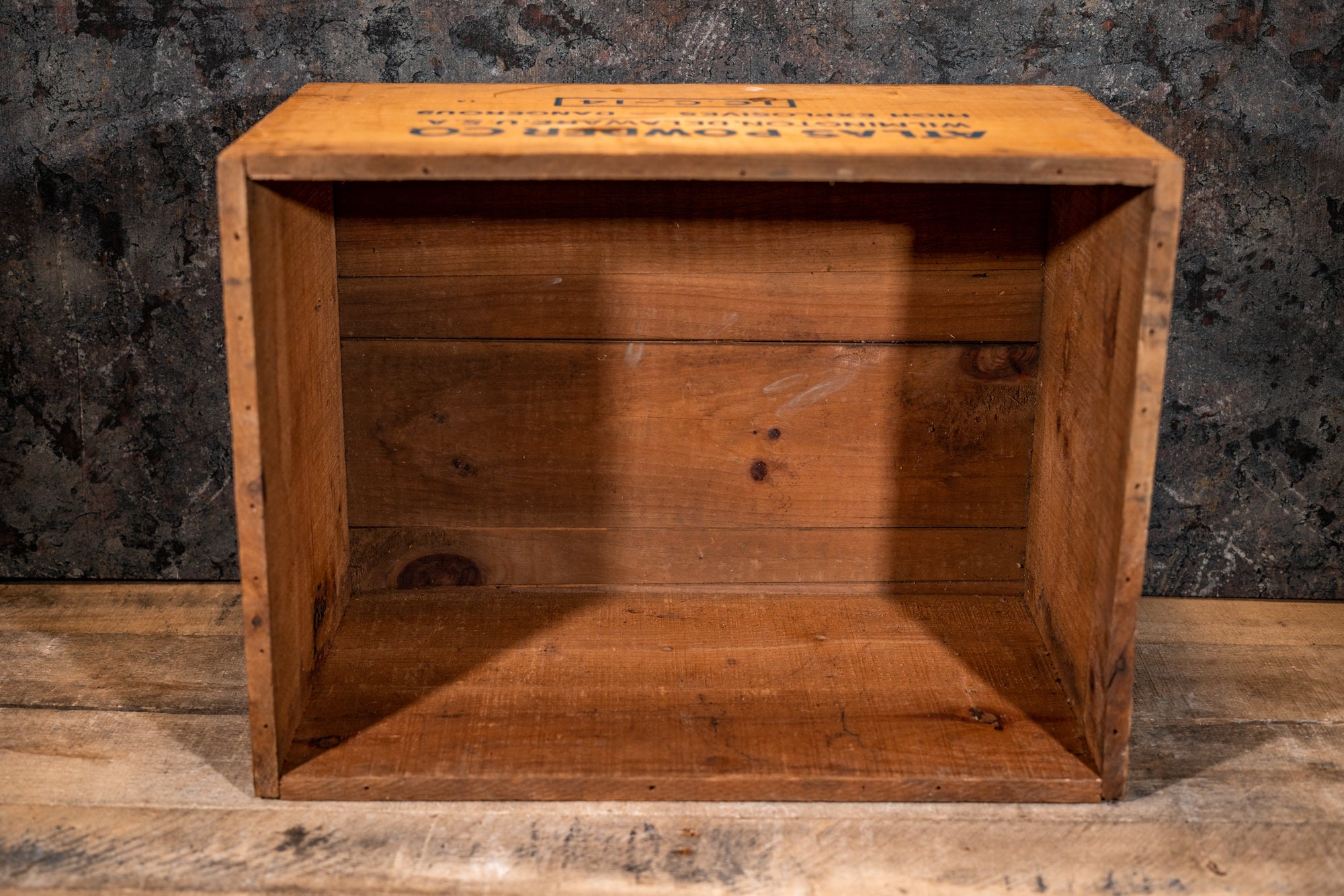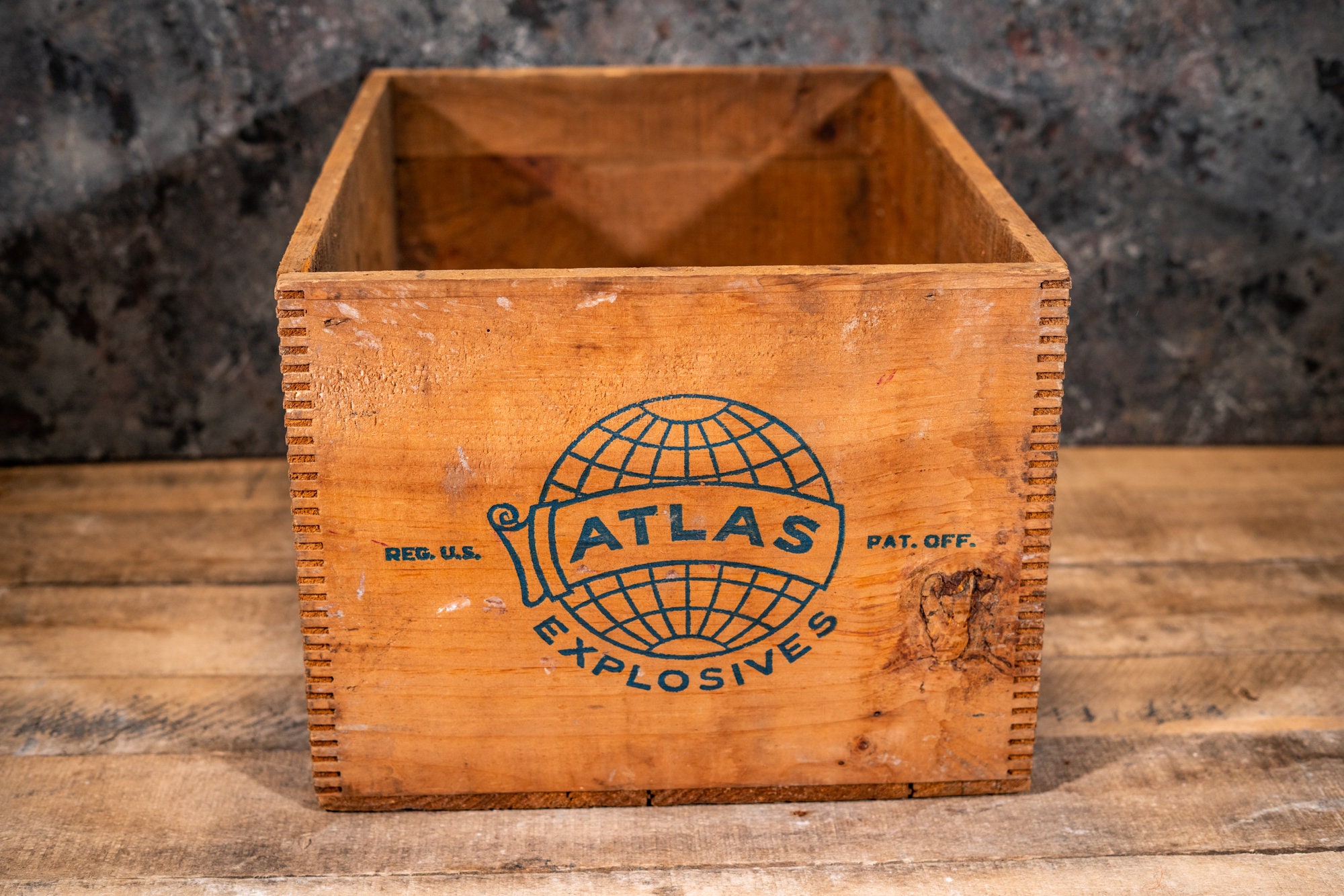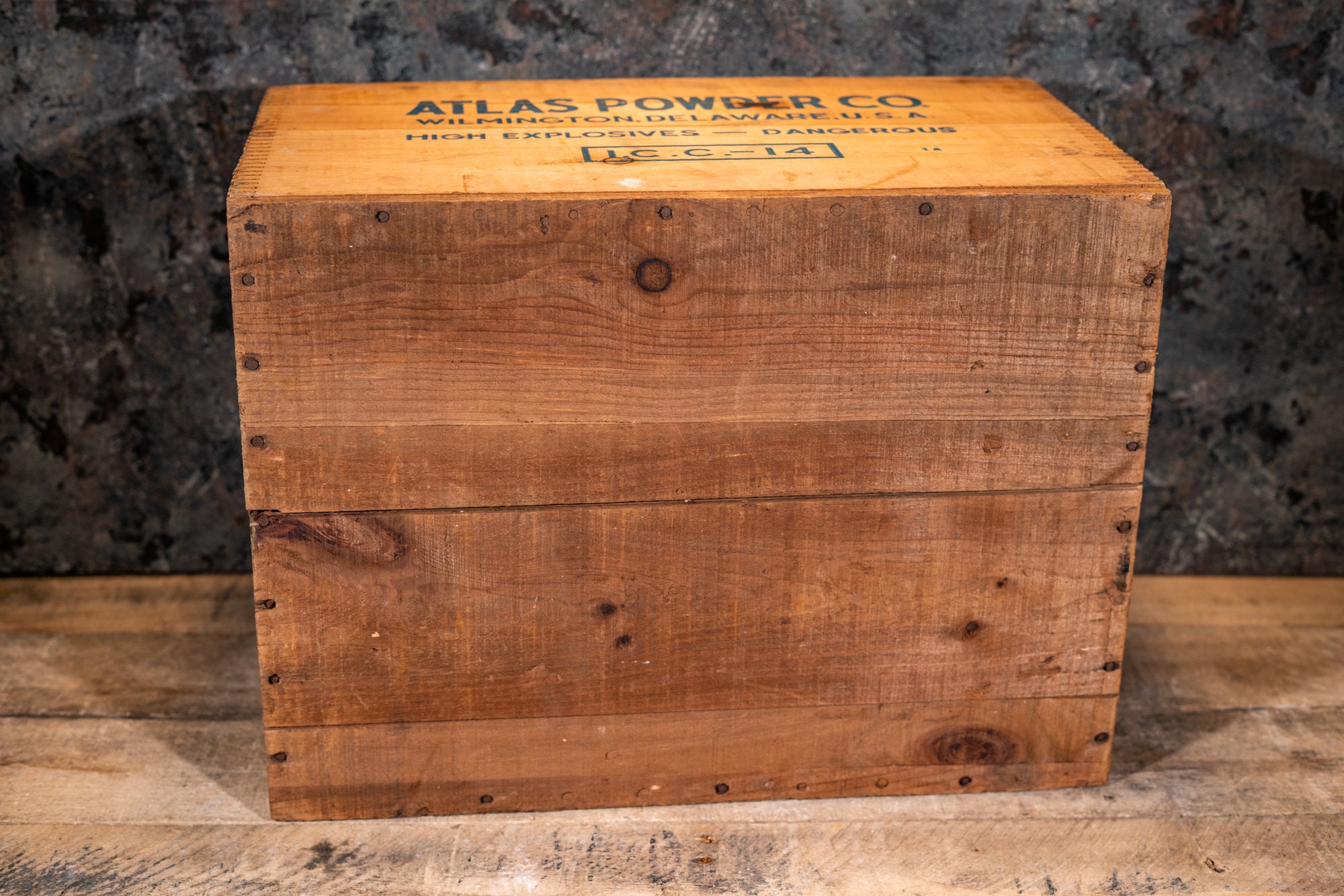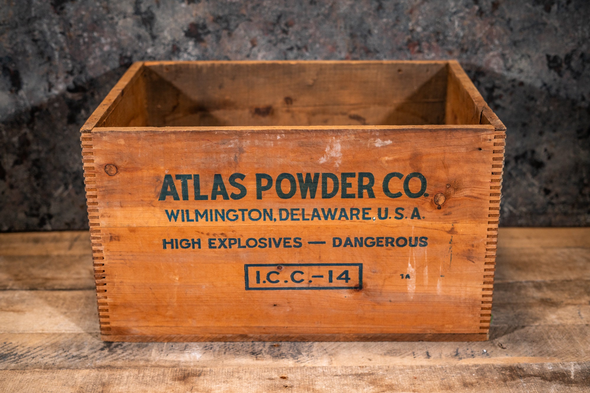 Take a look at this explosives crate. It is an Atlas Powder Company crate and its from Wilmington, Delaware. The crate is wooden and is dovetailed. As you can see it is in pretty nice shape. There is some wear, a few chips, and one side has some paint on it. It is approx. 17 1/2 x 13 x 10 inches. The side says "Coalite C" .These make great display pieces or just use them for storage in the garage or man cave. Please check out the photos for a closer look and if you have any questions please let me know. Thanks!