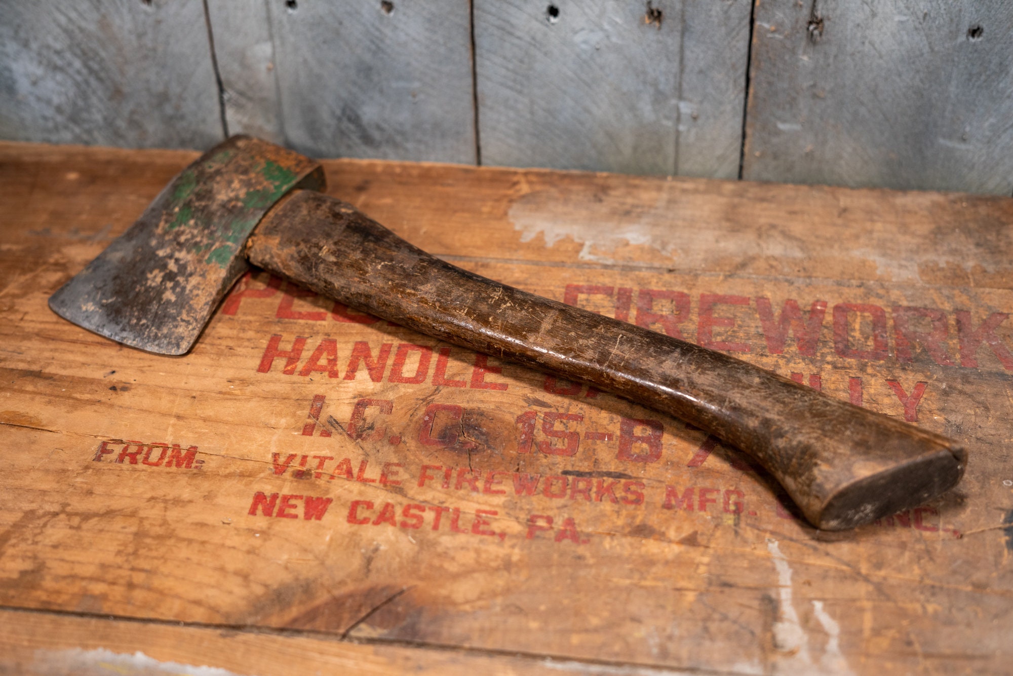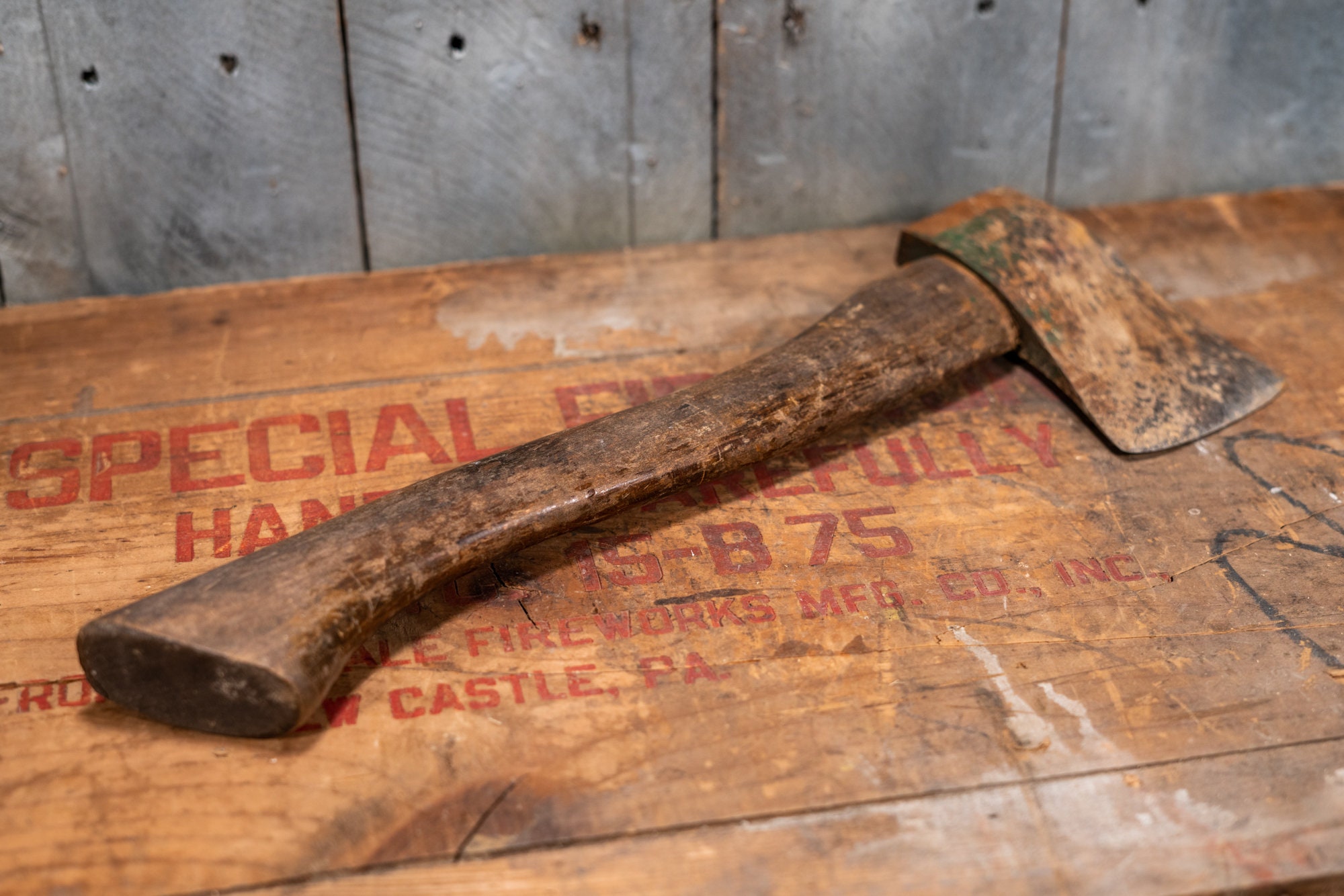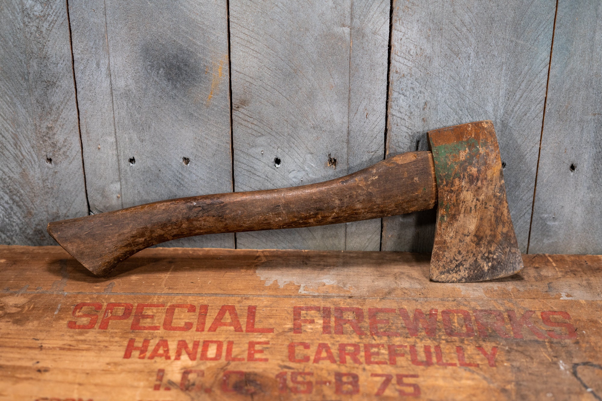 We have been getting requests to find some more axes/hatchets. This axe doesn't have any makers marks that we could see and its approx. 15 x 5 1/2 x 1 1/4 inches. The axe has been used and is pretty dull. It also has wear, dirt, scratches, rust and there's a crack at the base of the handle. These make great display pieces in a cabin or man cave. Please check out the photos for a closer look and if you have any questions please let me know. Thanks!