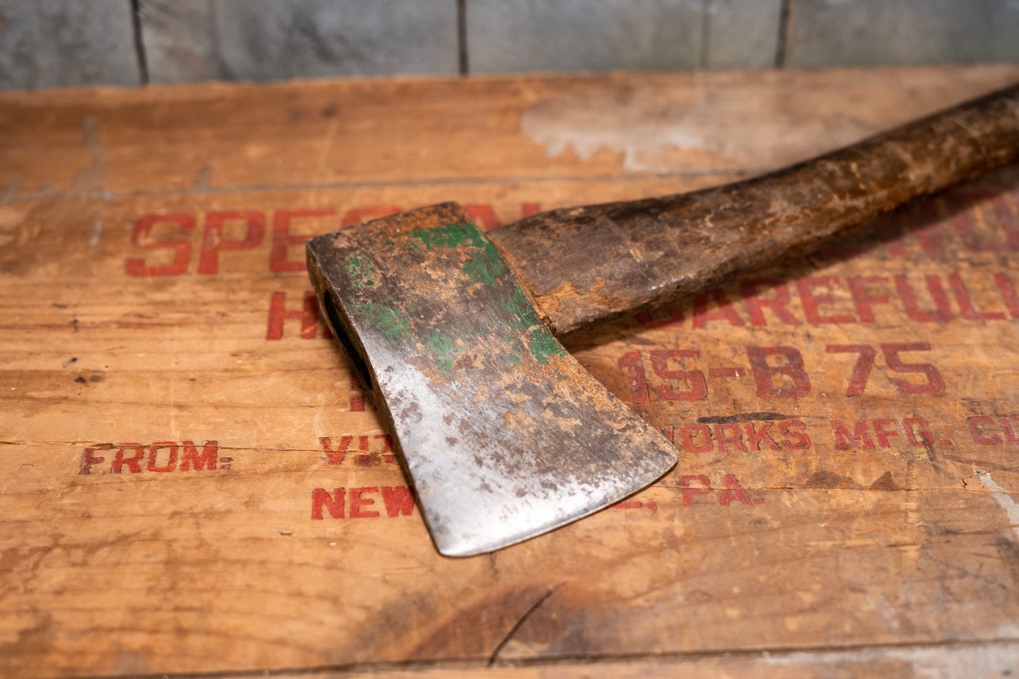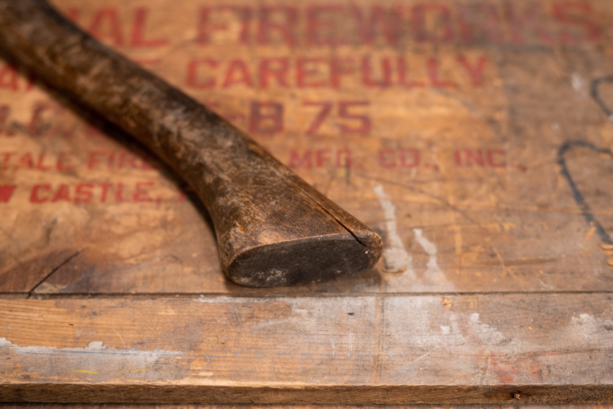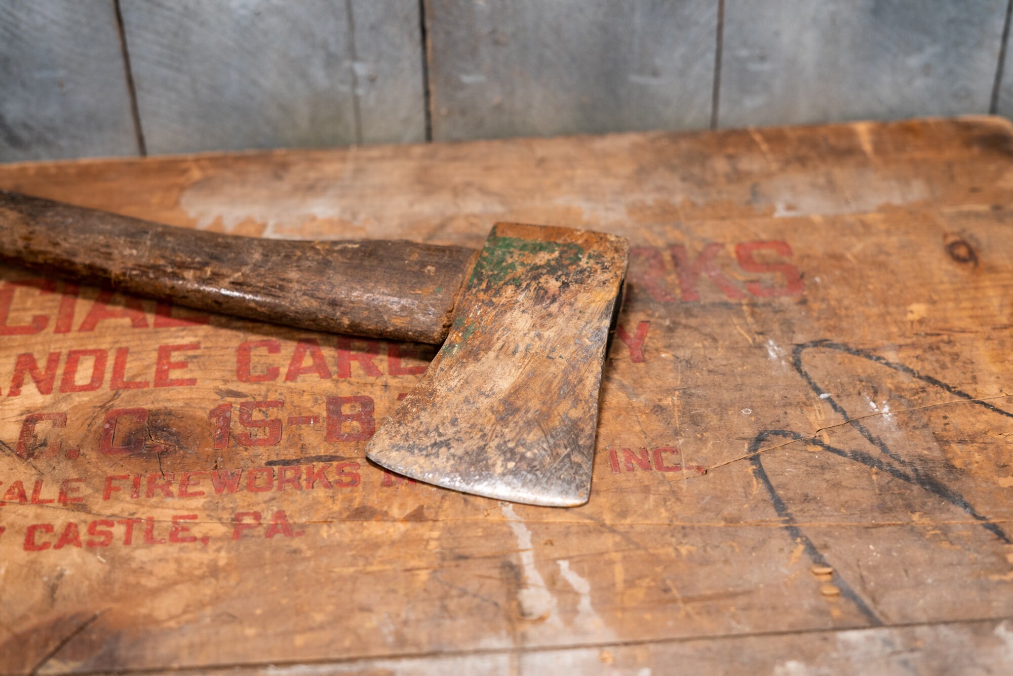 We have been getting requests to find some more axes/hatchets. This axe doesn't have any makers marks that we could see and its approx. 15 x 5 1/2 x 1 1/4 inches. The axe has been used and is pretty dull. It also has wear, dirt, scratches, rust and there's a crack at the base of the handle. These make great display pieces in a cabin or man cave. Please check out the photos for a closer look and if you have any questions please let me know. Thanks!