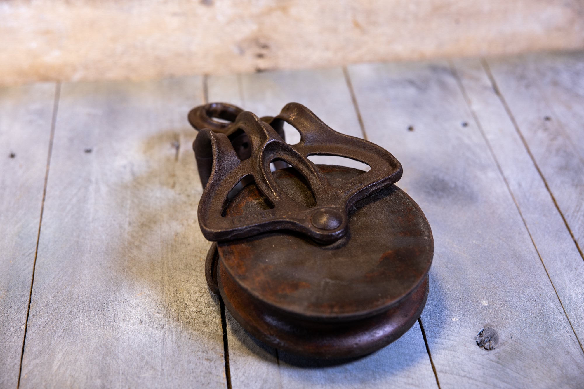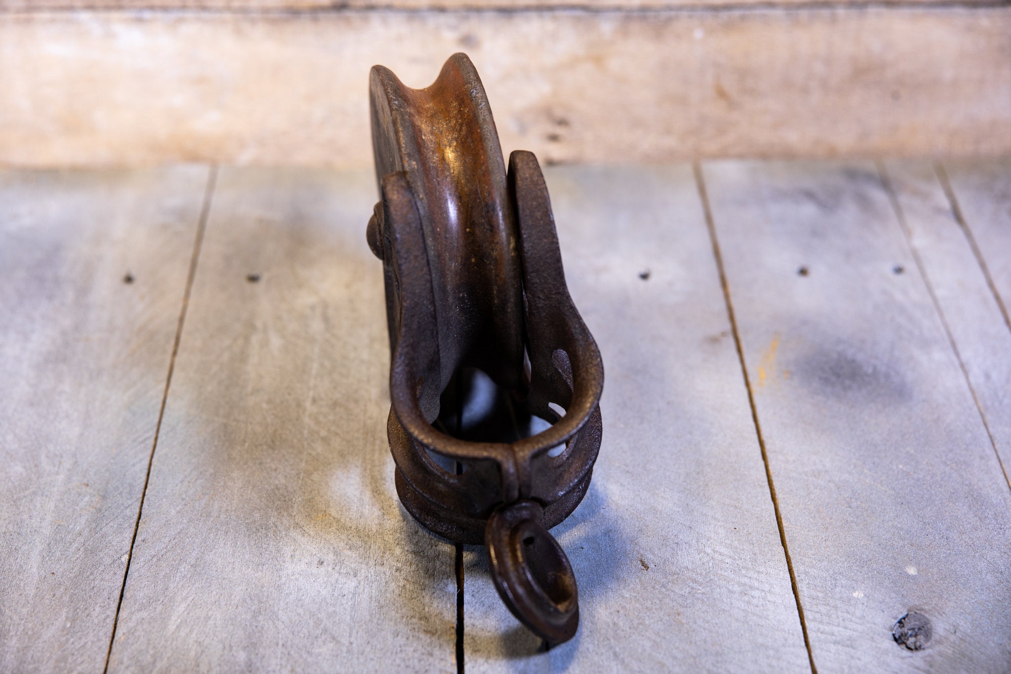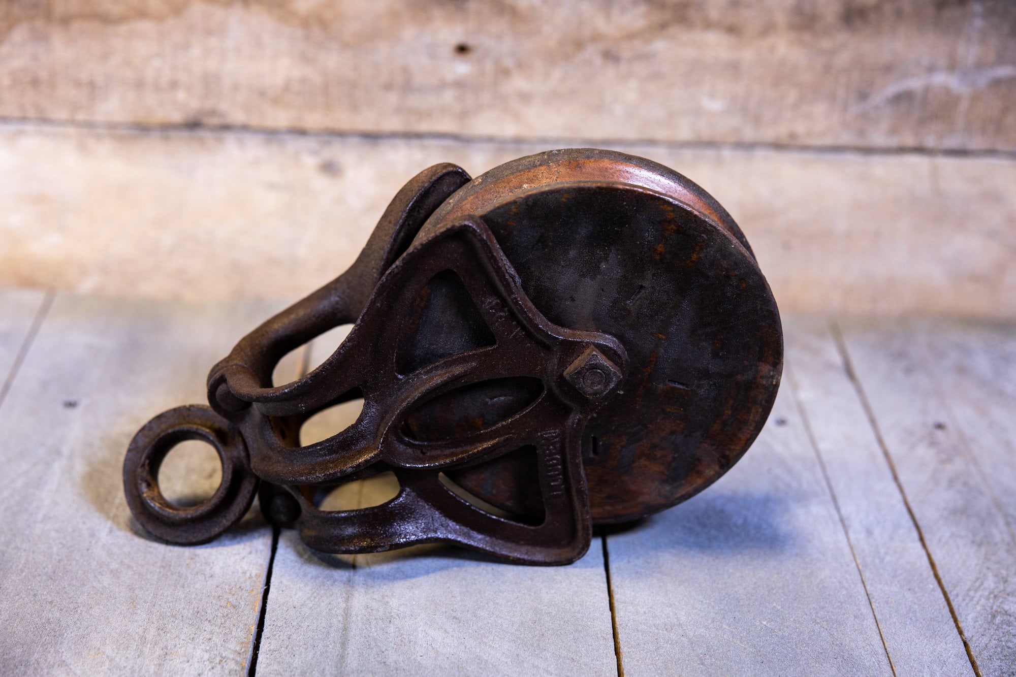 What a great-looking vintage pulley! We love finding old pulleys because they make fantastic display pieces and can even be incorporated into lighting projects. This is a Louden A-23 pulley, combining wood and cast iron for a classic rustic look. It shows normal wear consistent with its age, including some rust, but the wheel still spins freely. Perfect for farmhouse, industrial, or nautical-inspired decor, or as a unique collector’s piece. It is approx. 11" x 6" x 3.5".