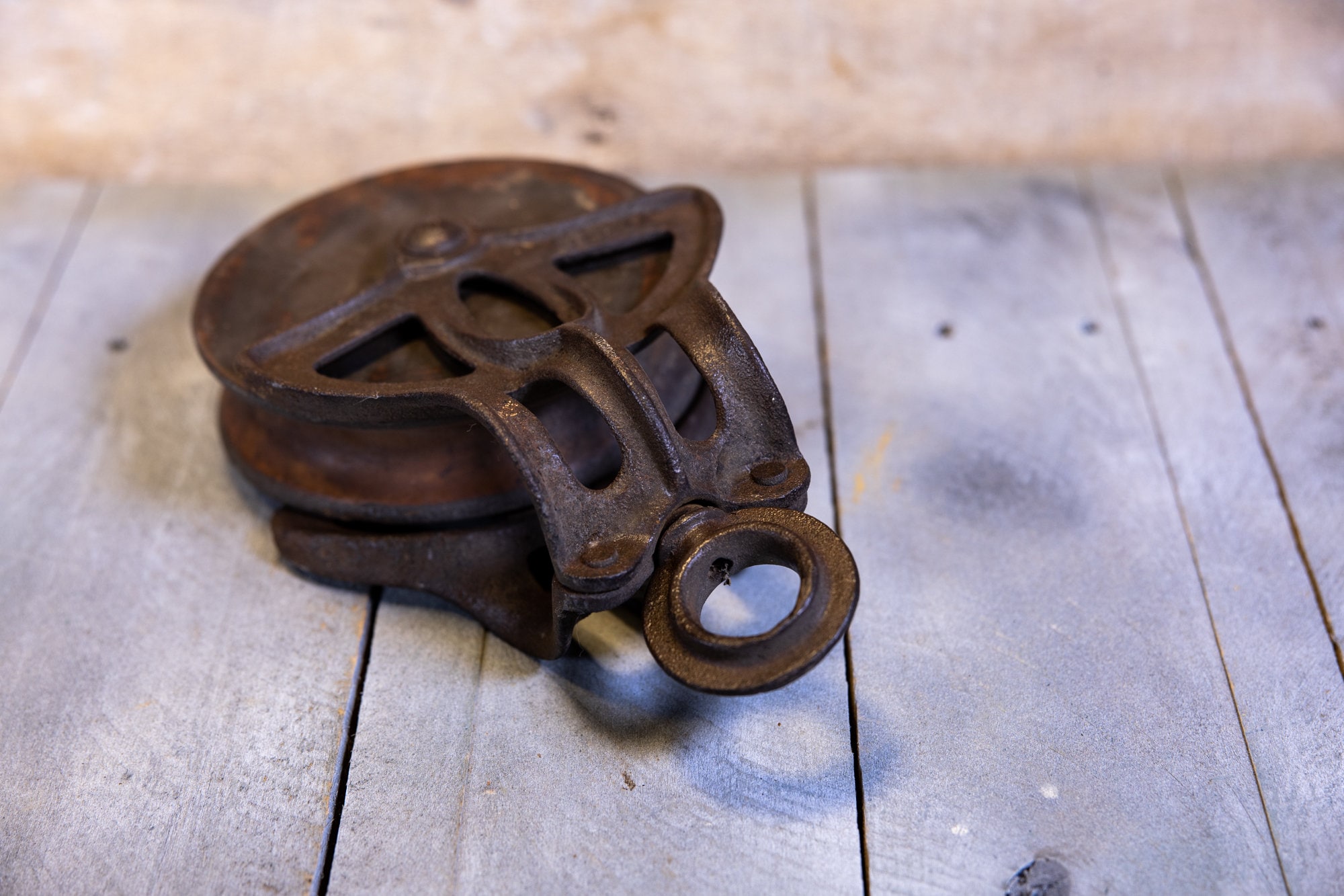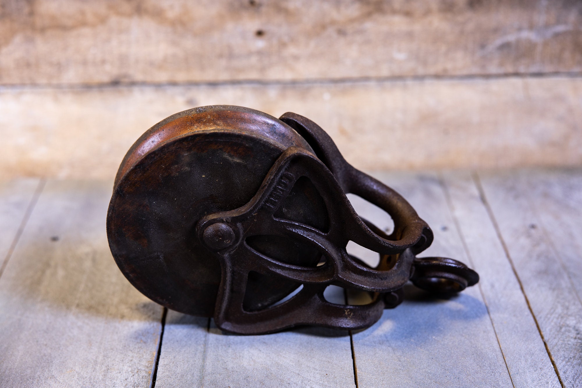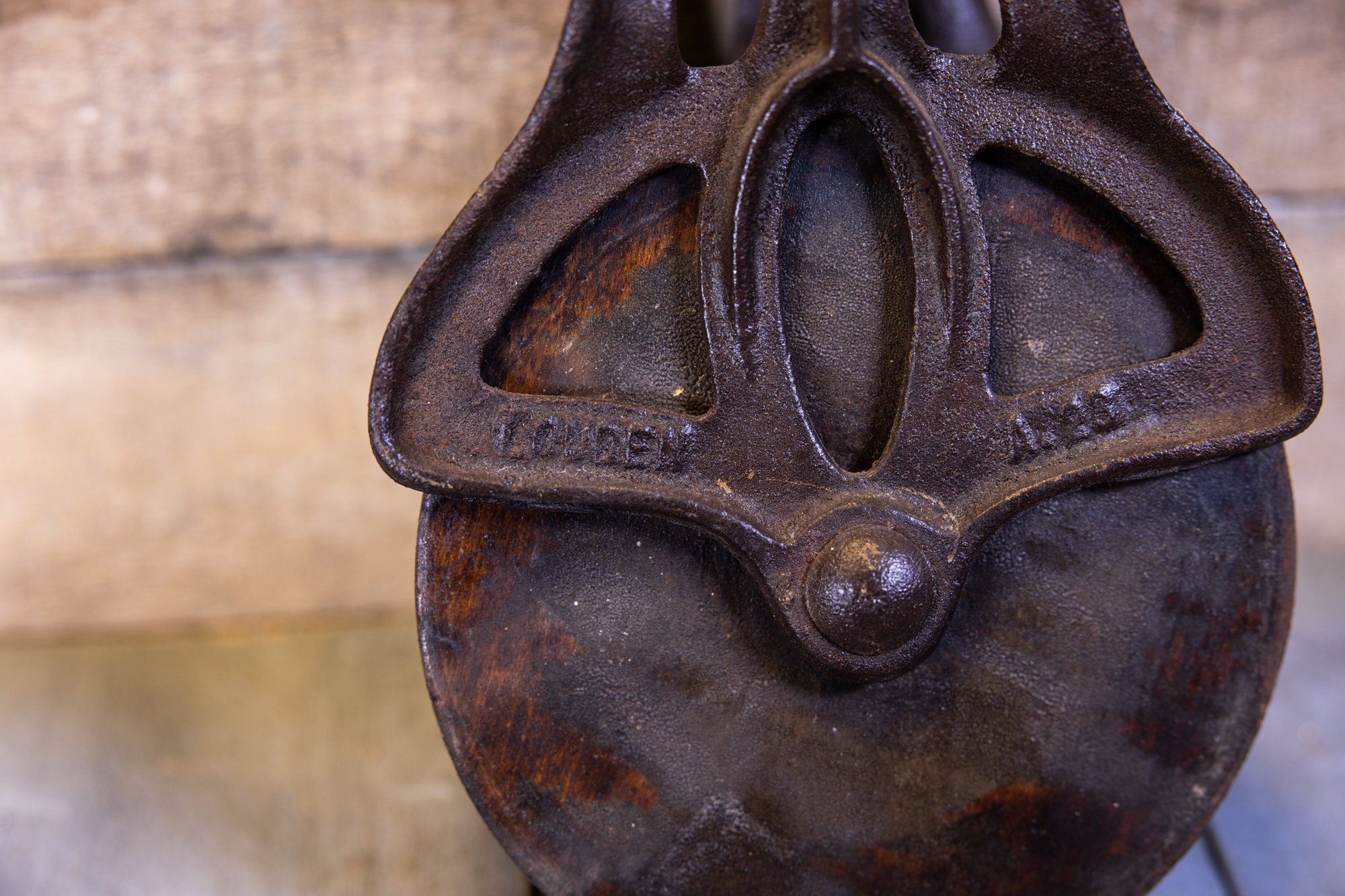 What a great-looking vintage pulley! We love finding old pulleys because they make fantastic display pieces and can even be incorporated into lighting projects. This is a Louden A-23 pulley, combining wood and cast iron for a classic rustic look. It shows normal wear consistent with its age, including some rust, but the wheel still spins freely. Perfect for farmhouse, industrial, or nautical-inspired decor, or as a unique collector’s piece. It is approx. 11" x 6" x 3.5".