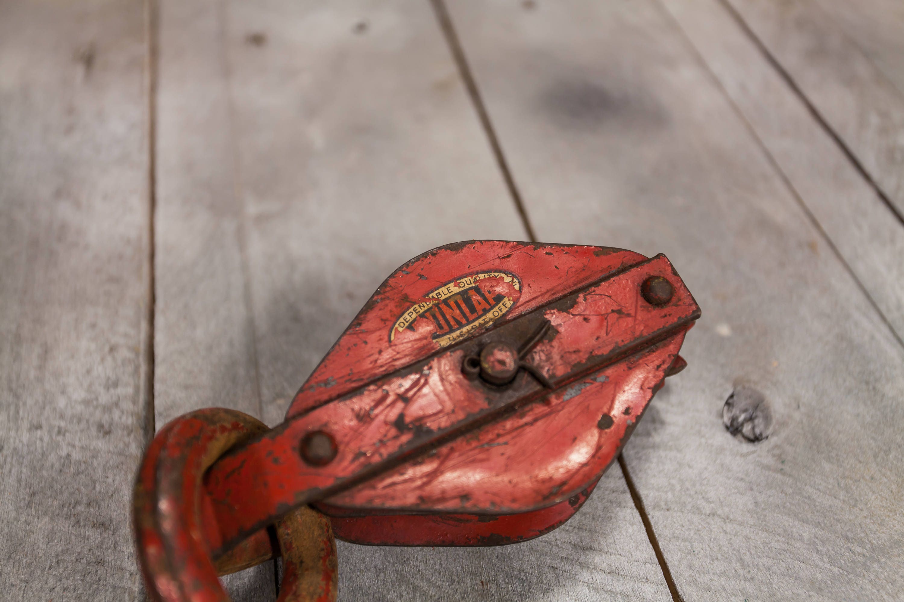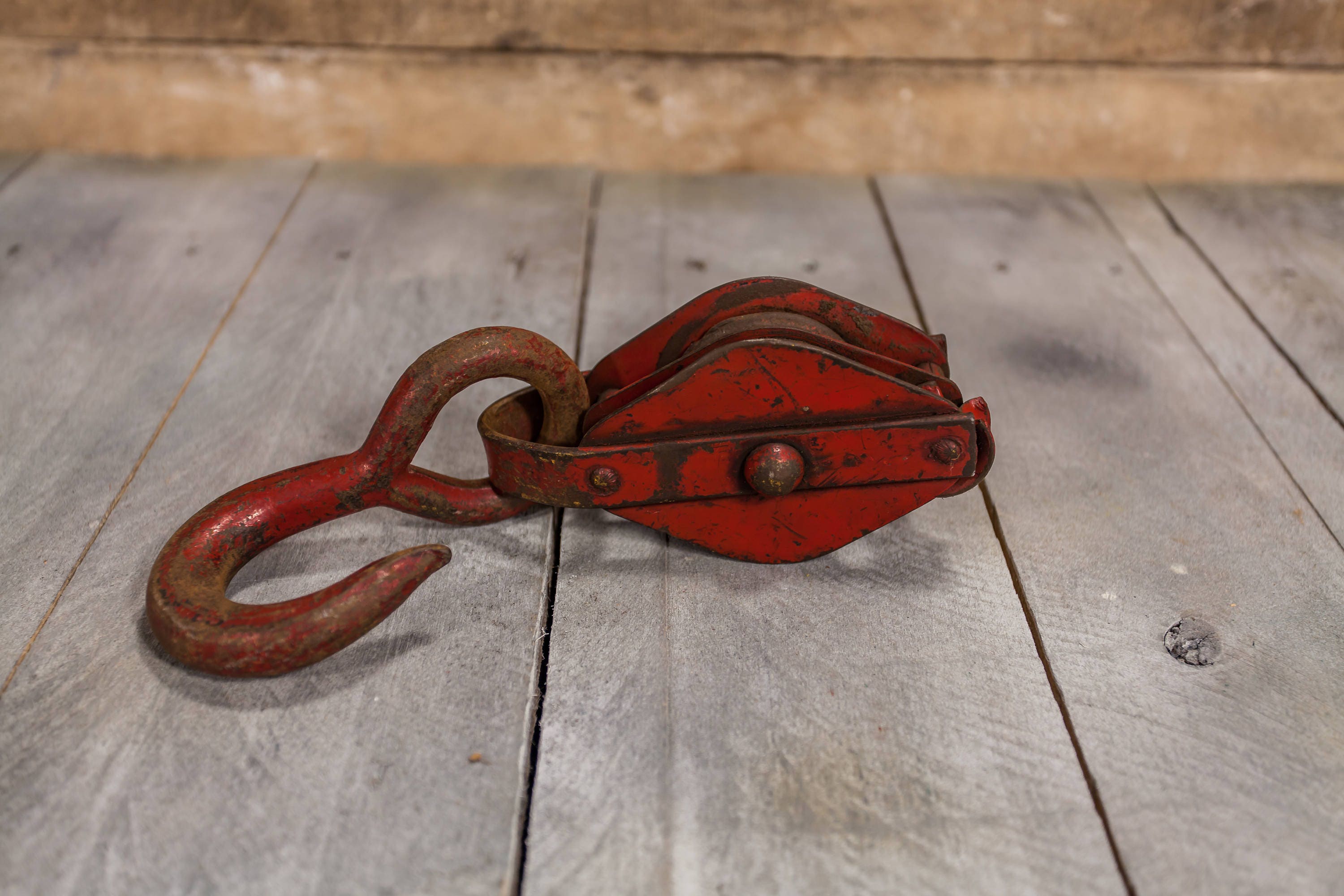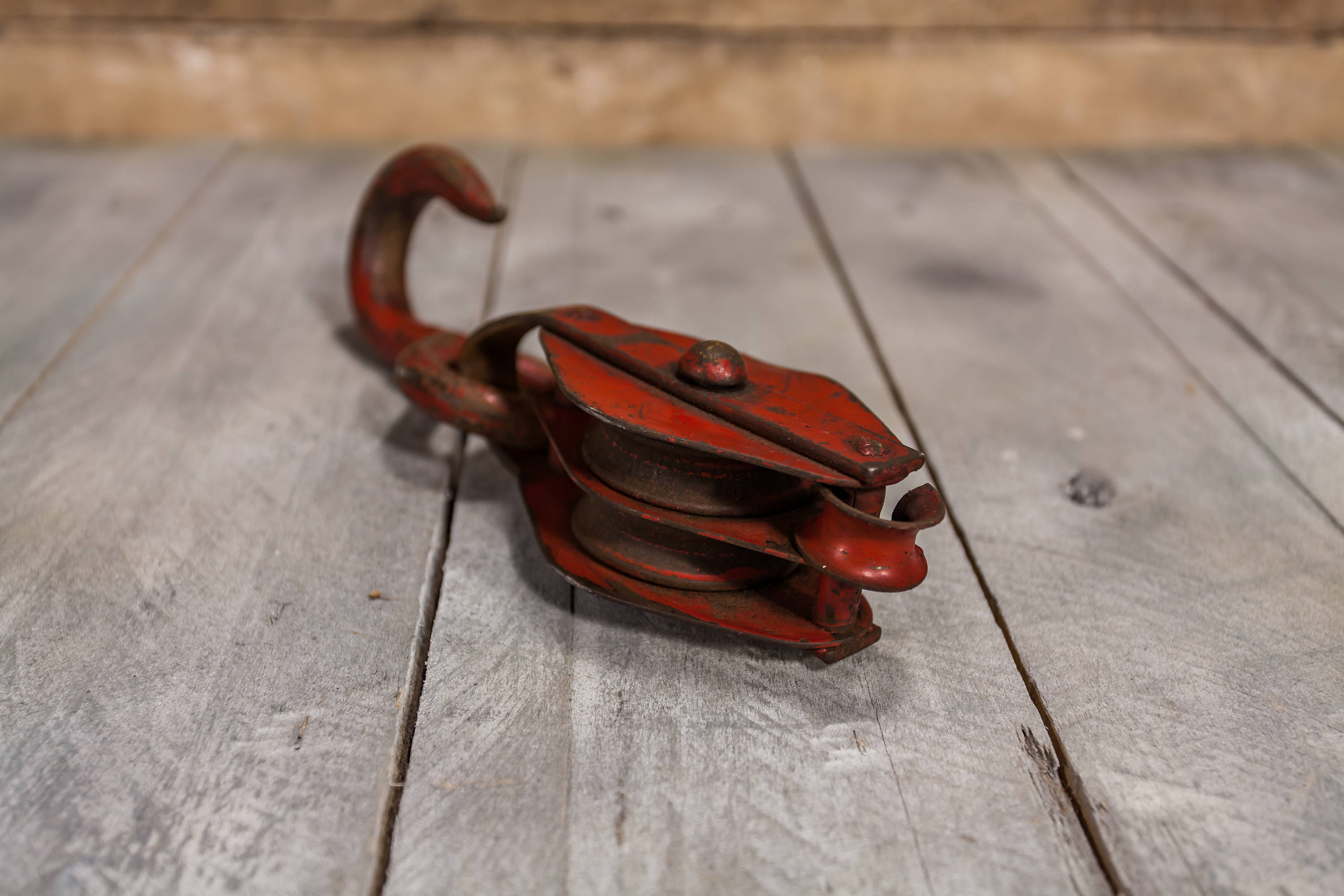 What an absolutely great looking pulley. The patina on this is so awesome. It would make a great display piece. The pulley is red and does have some wear to it. It could use a good cleaning and its made by Dulap. It is approx. 10 x 3 x 2 inches. This features a double pulley system and still works great. Please check out the photos for a closer look and if you have any questions please let me know. Thanks!