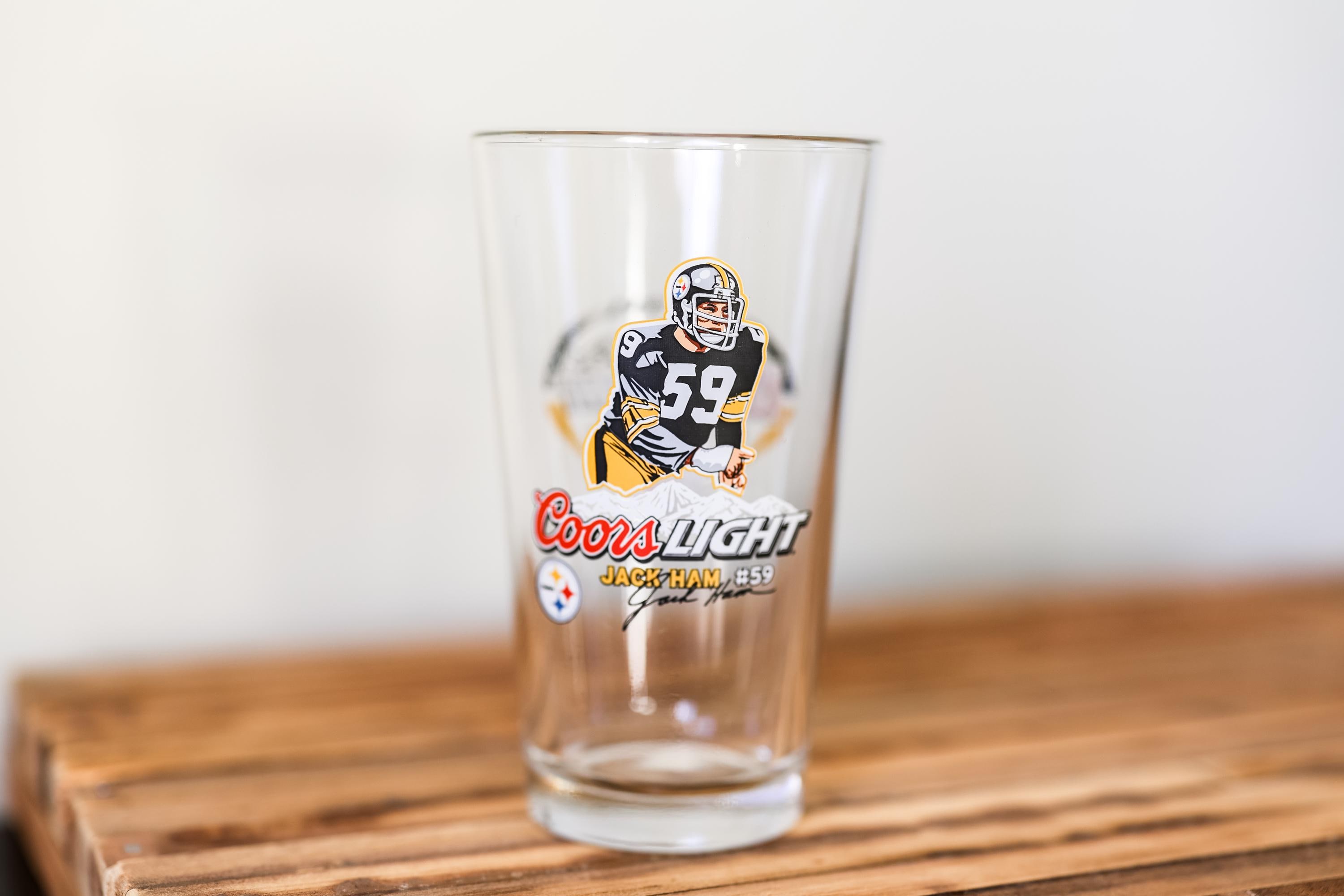 Add a piece of Steelers history to your collection with this vintage Coors Light NFL glass featuring legendary Pittsburgh Steelers linebacker Jack Ham (#59). Perfect for game-day beverages, bar displays, or as a gift for any die-hard Steelers fan! The glass does have some wear and could use a good cleaning. Its approx. 5 3/4 x 3 1/2 inches.