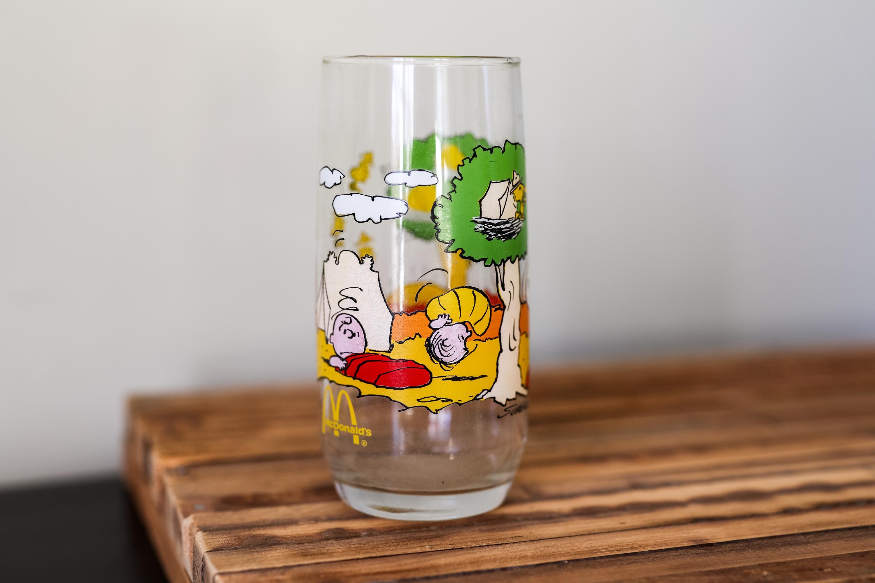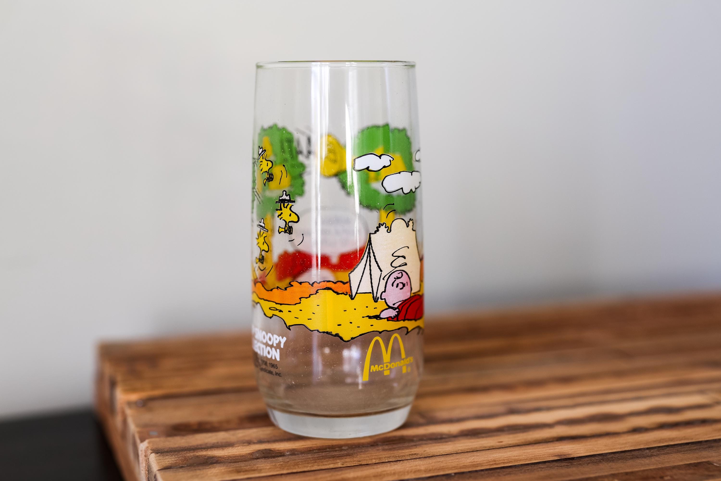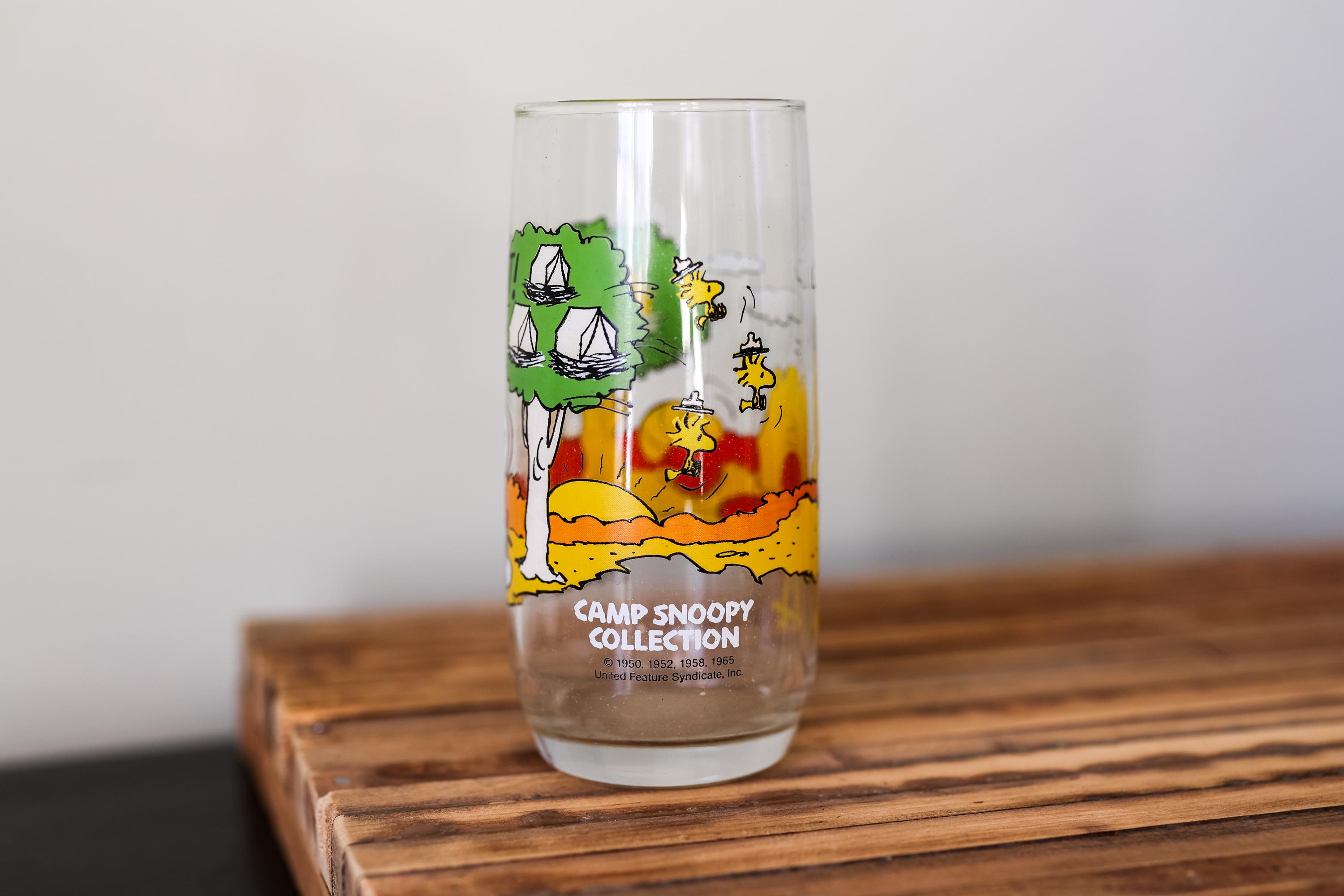 This is a Charlie Brown Camp Snoopy collectible glass from McDonalds. It features the characters from Charlie Brown. The glass has some wear and needs a good cleaning. This would make a great gift for any Charlie Brown fan.