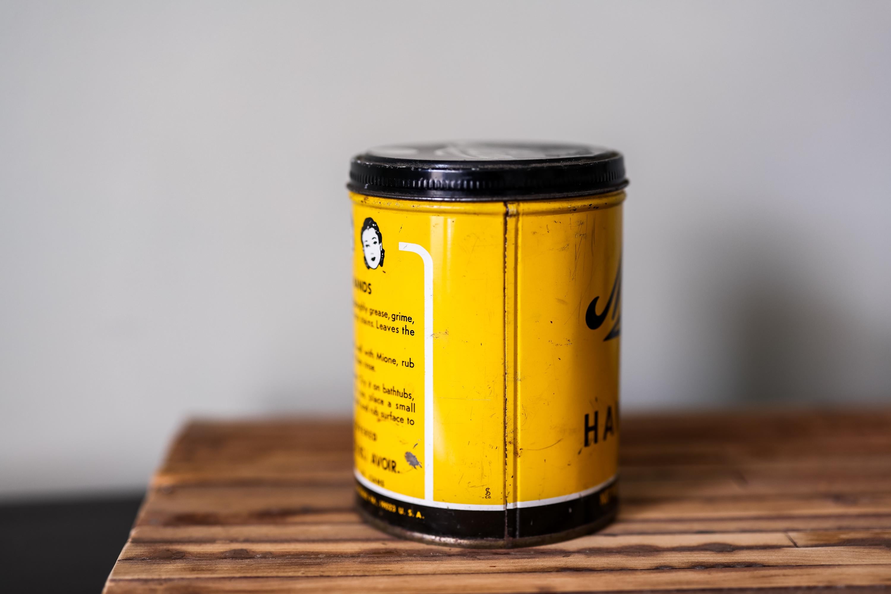We love finding old tins. They make such awesome display pieces and they always have great advertising on them. This is a Mione Hand Soap Tin and it is approx. 5 1/2 x 4 1/4 inches. The tin does have some wear, scratches, and dents. There is rust inside the tin as well.
