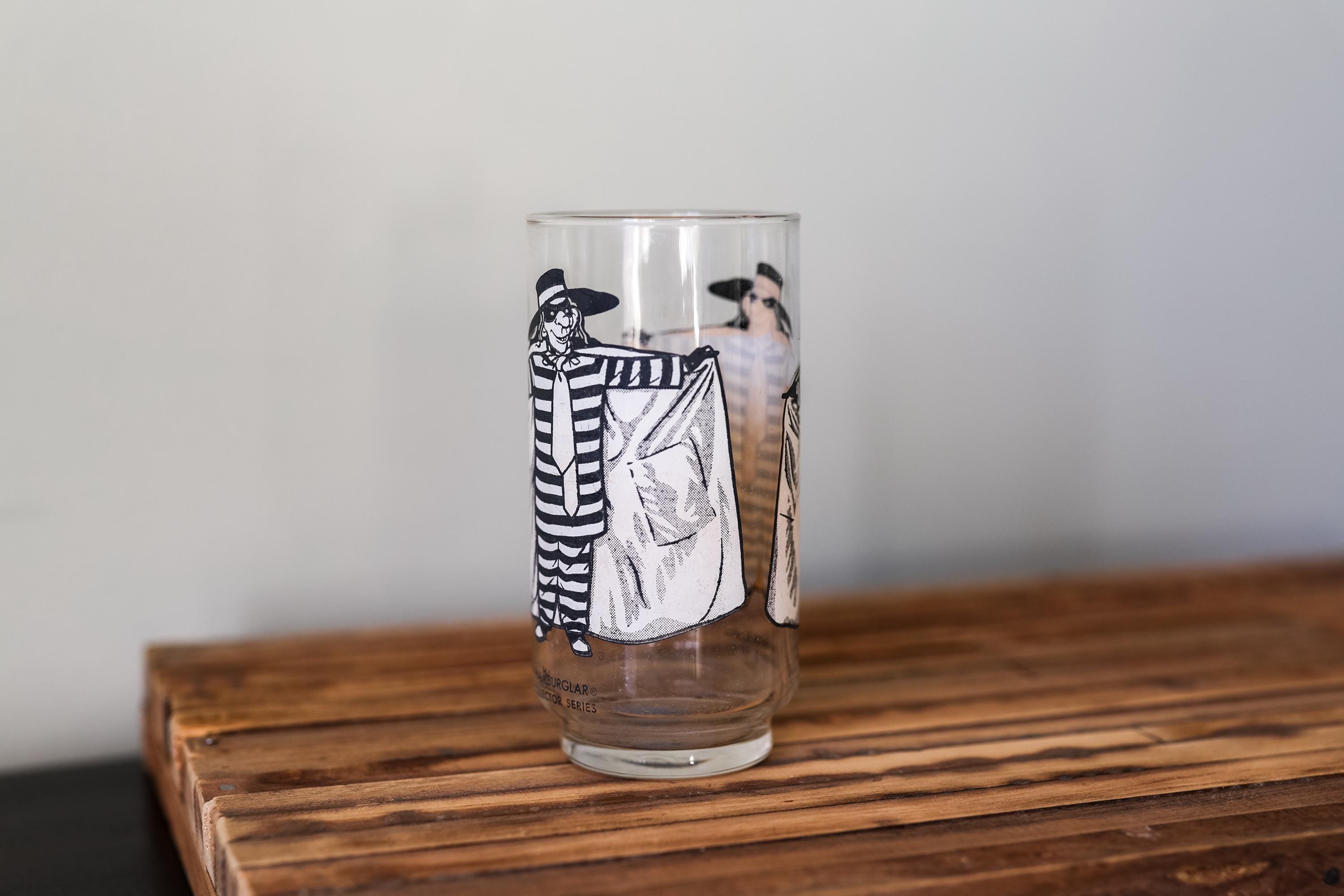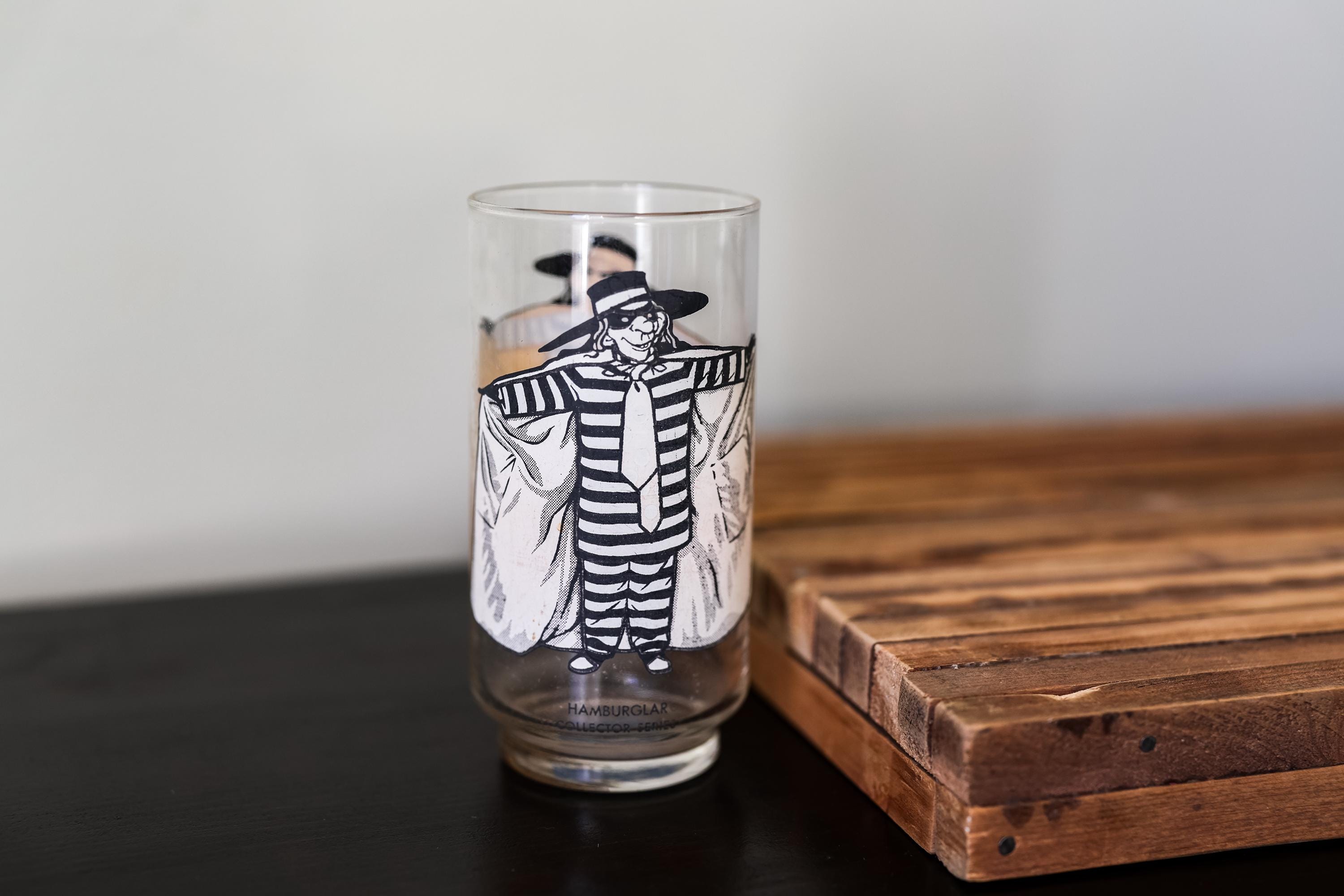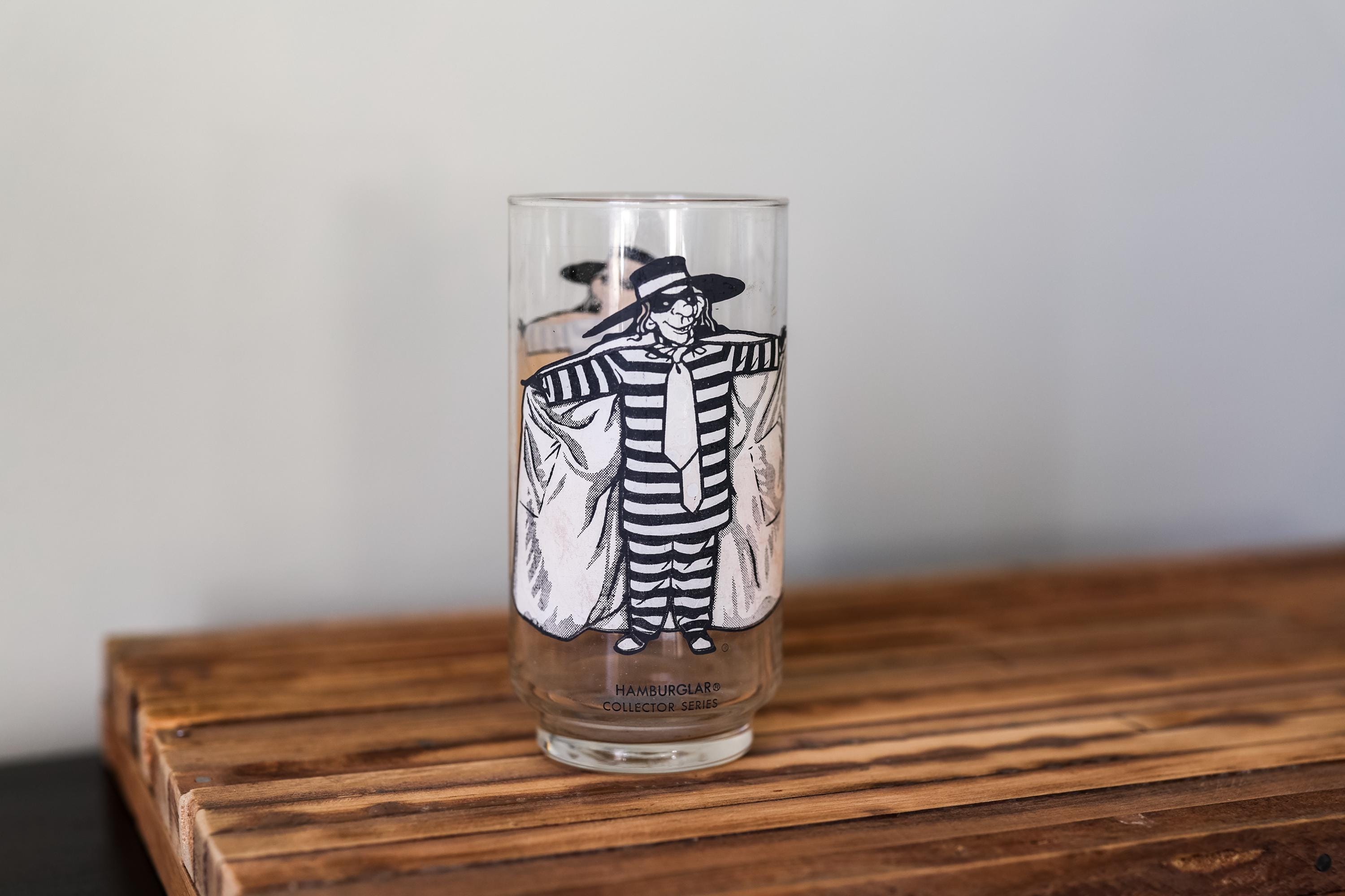 We love finding these vintage McDonalds collectible glasses. This one features Hamburglar. This came out in the 1970s and is from the Collector Series. It does have wear, could use a good cleaning, and the color is completely faded. It is approx. 5 1/2 x 2 3/4 inches. These make a great gift.