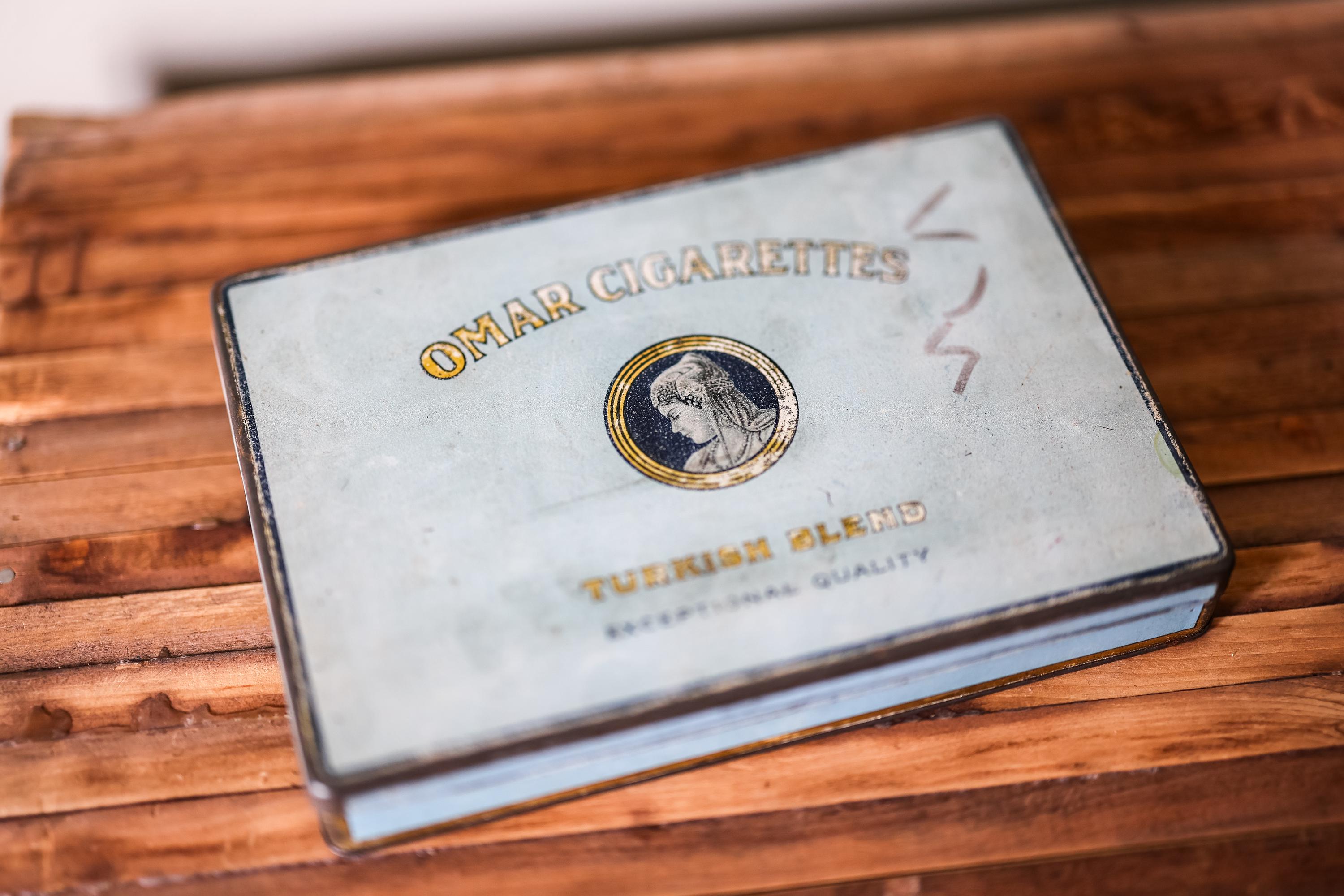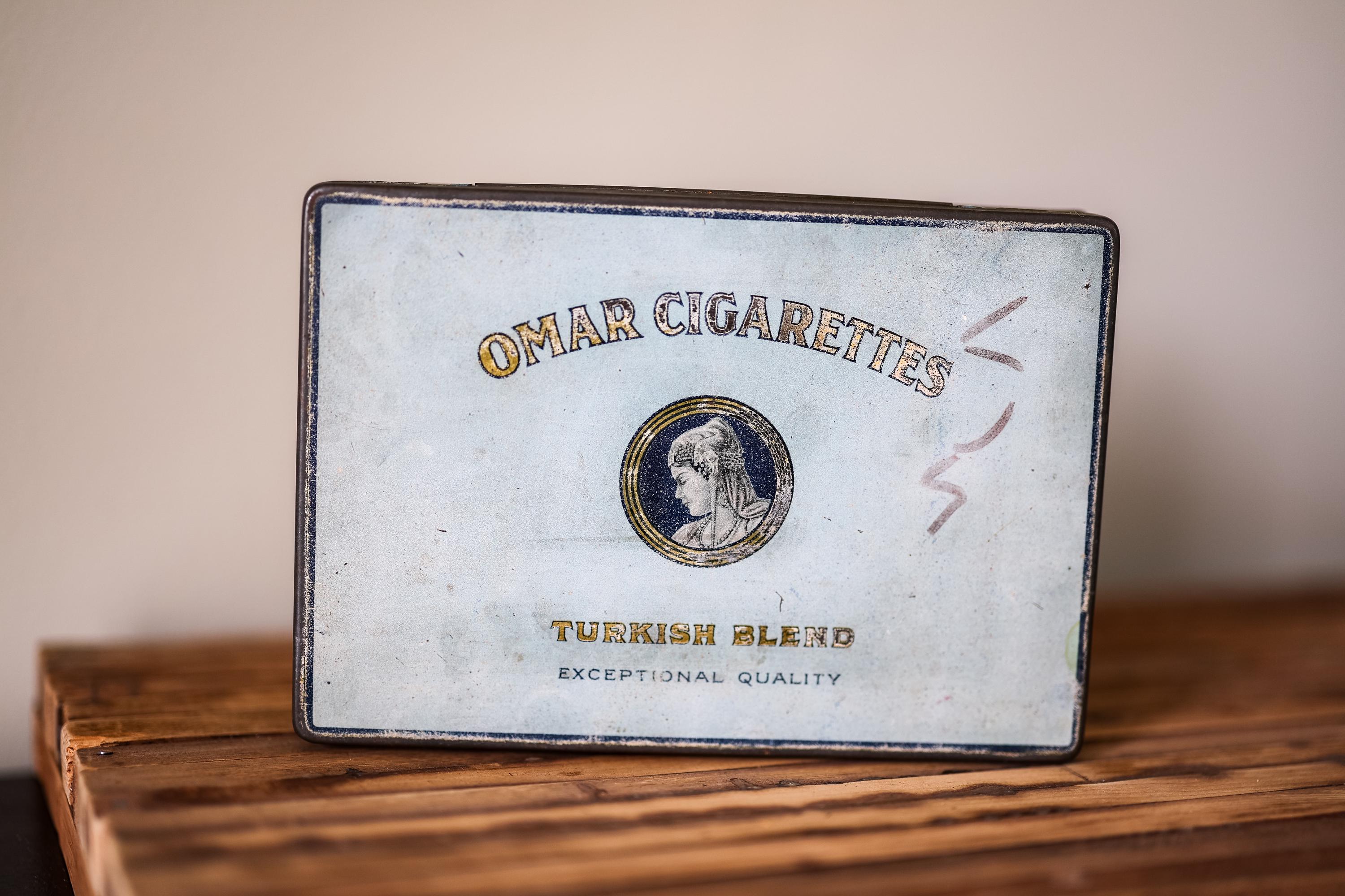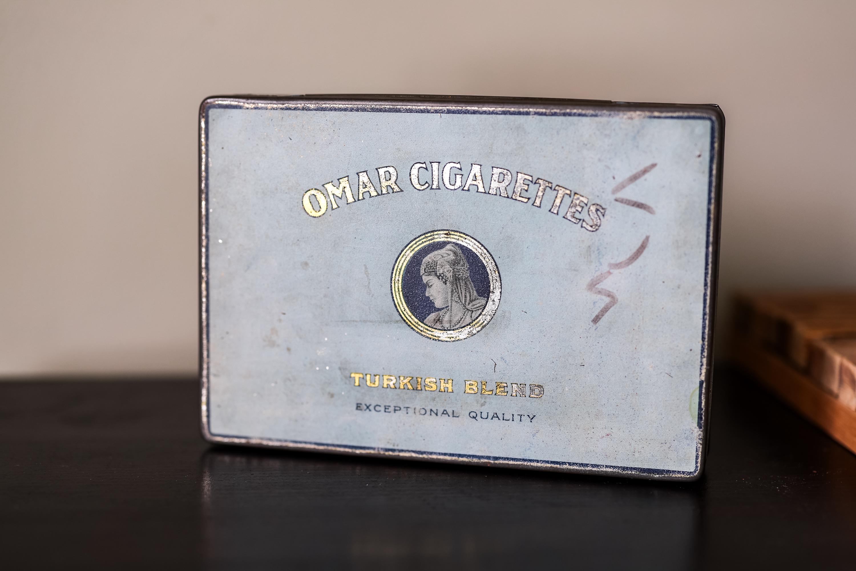 This is a Vintage Omar Cigarettes Turkish Blend tin. It is from the 1920s and is in fairly good shape. There is a sharpie mark on the front and it does have some wear. The tin is approx. 8 1/2 x 6 x 1 1/4 inches.