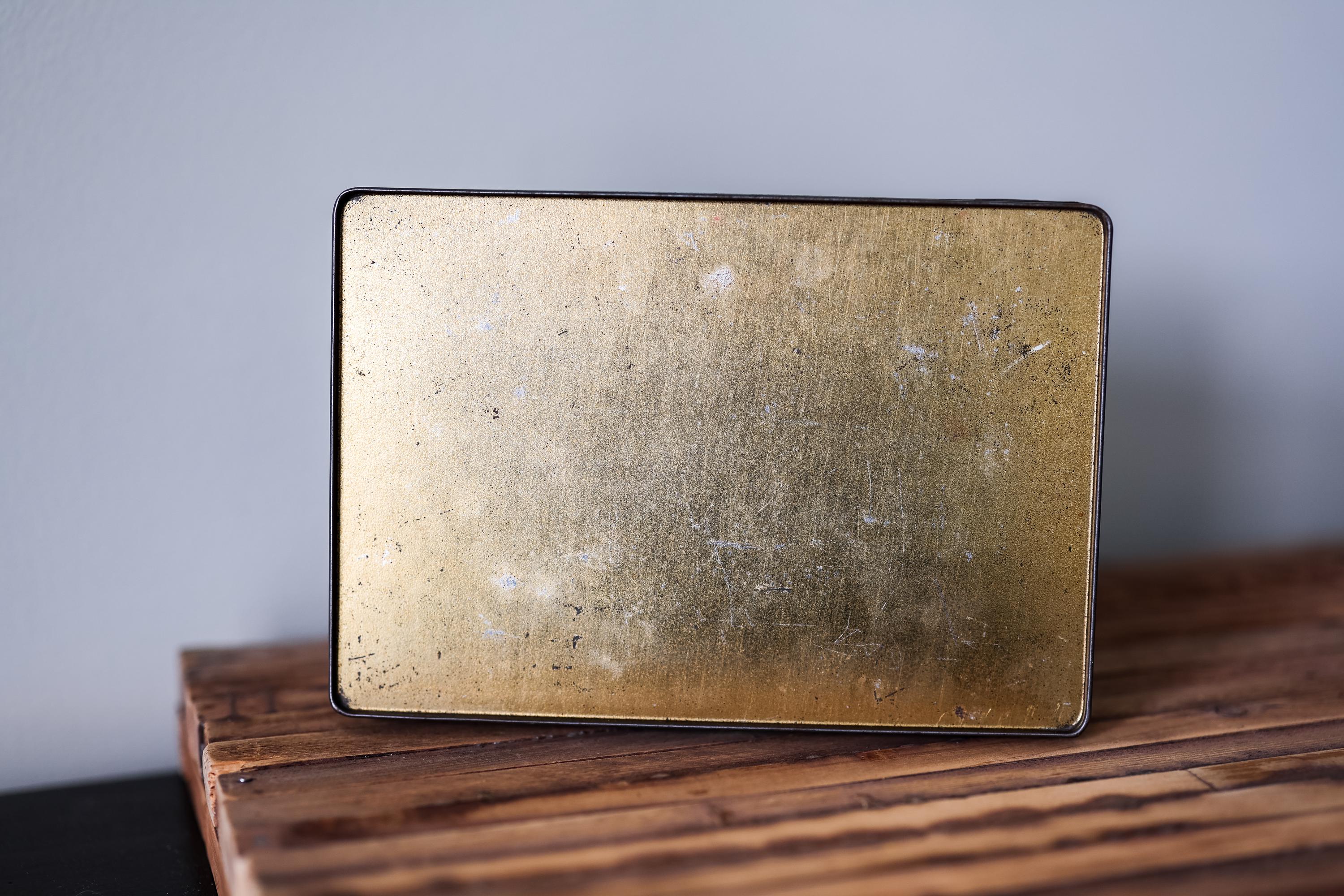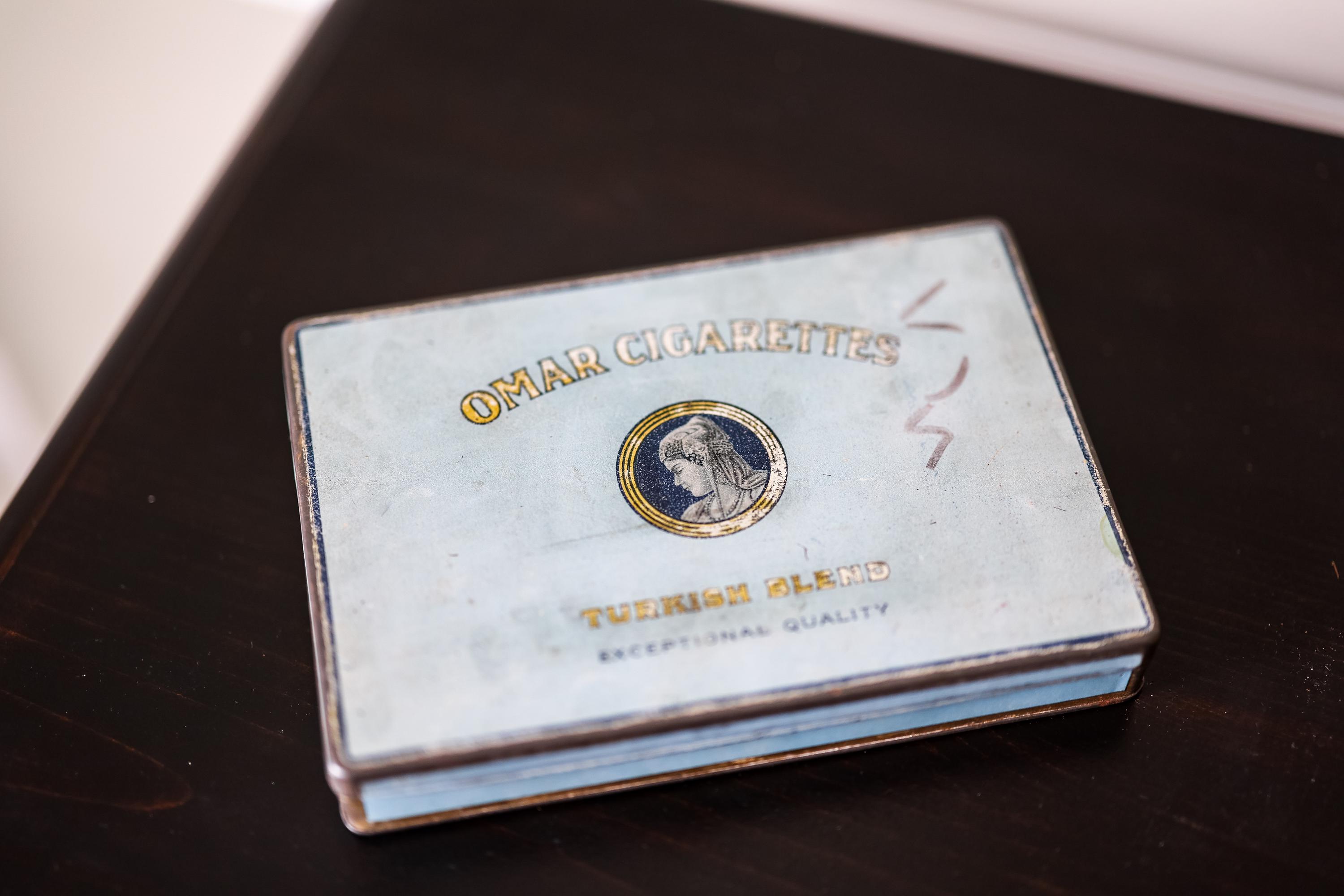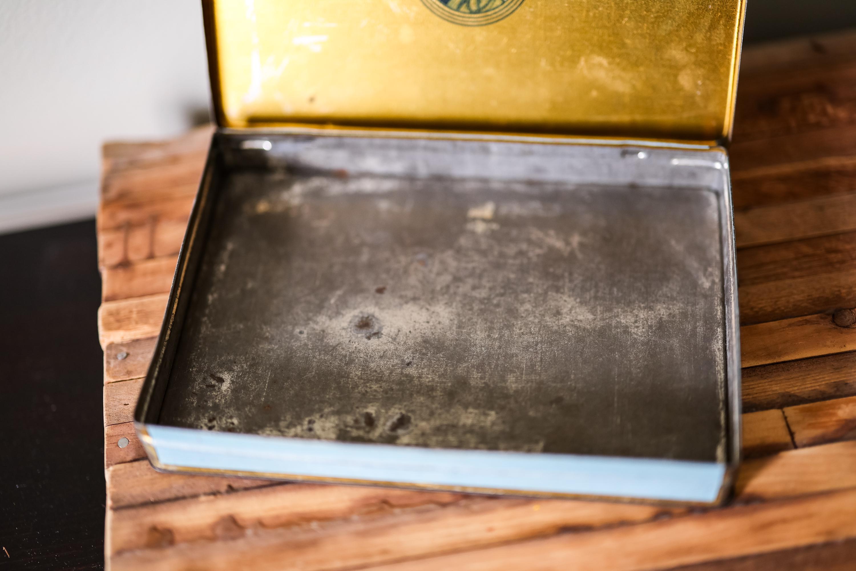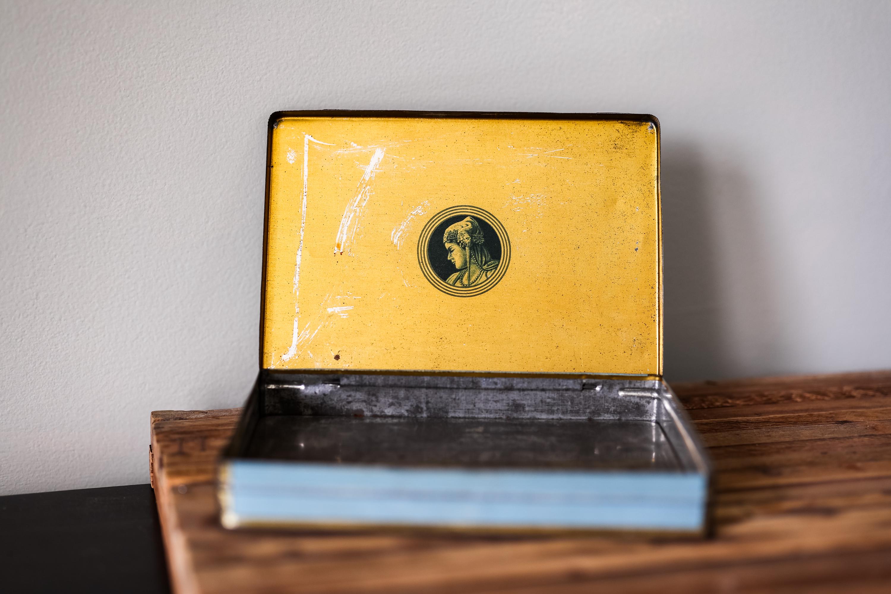 This is a Vintage Omar Cigarettes Turkish Blend tin. It is from the 1920s and is in fairly good shape. There is a sharpie mark on the front and it does have some wear. The tin is approx. 8 1/2 x 6 x 1 1/4 inches.
