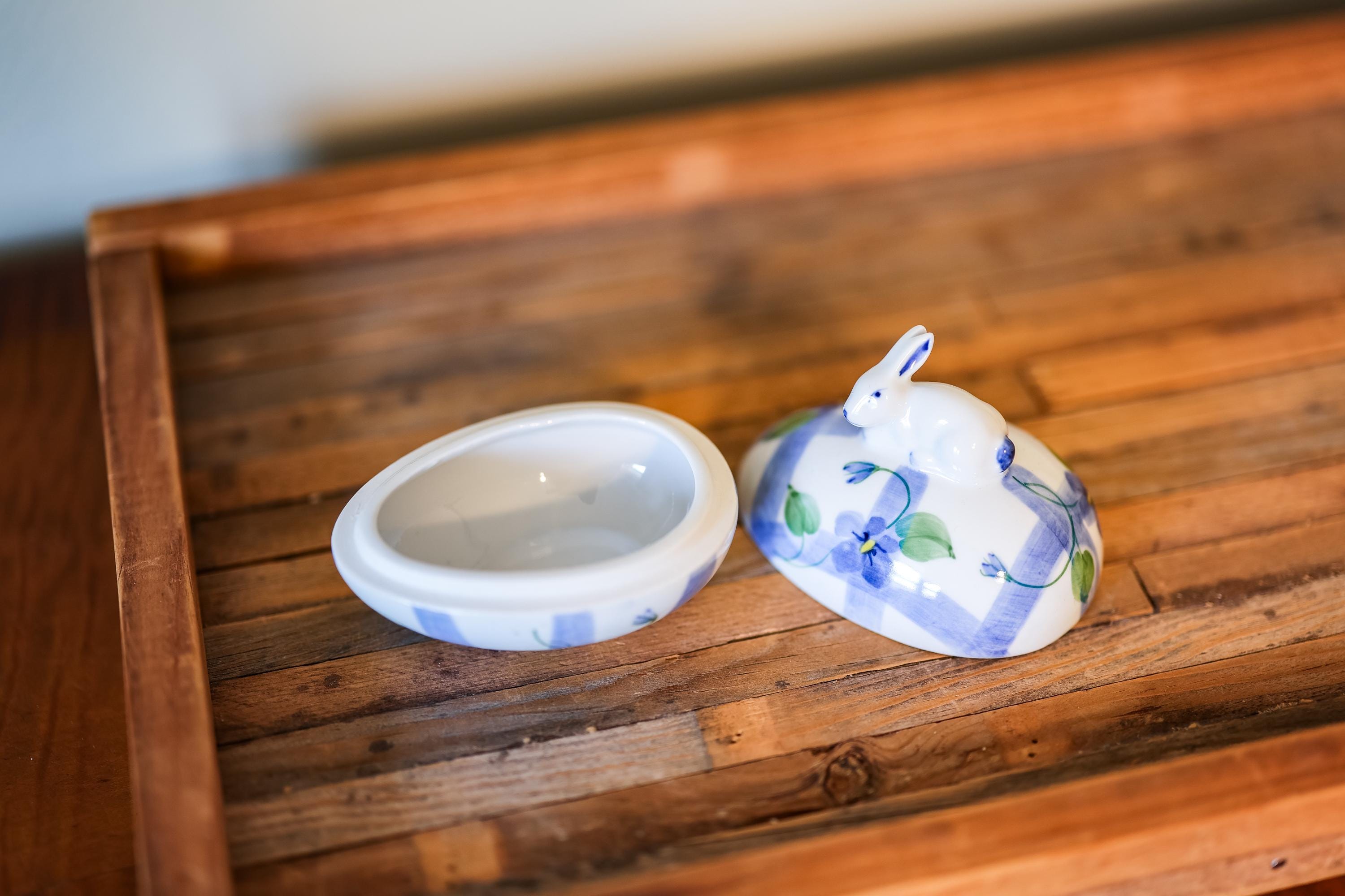 How charming is this Easter Egg trinket. After much research it looks to be an Andrea by Sadek Hand-Painted Porcelain Egg. It is approx. 4 x 3 1/2 x 3 inches and doesnt have any chips or cracks. This piece would make a lovely display on a shelf, in your kitchen, or as part of a vintage collection.
