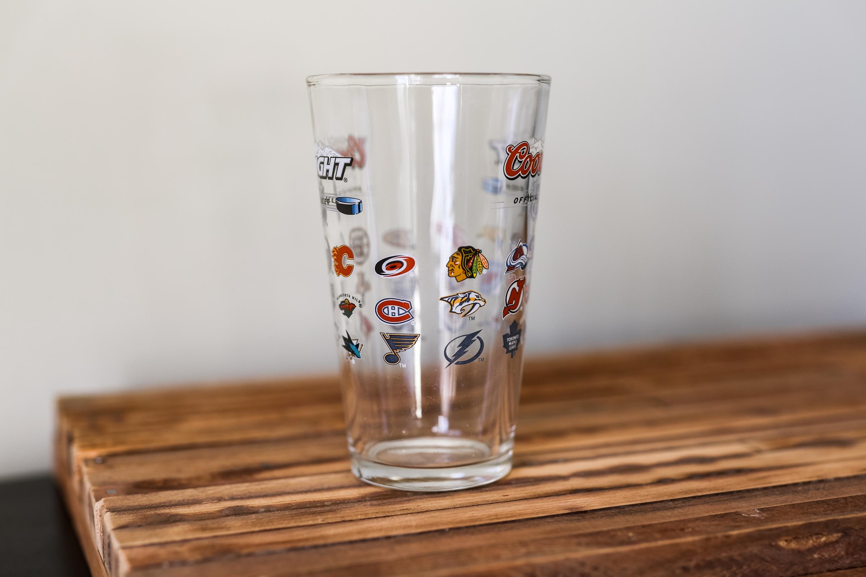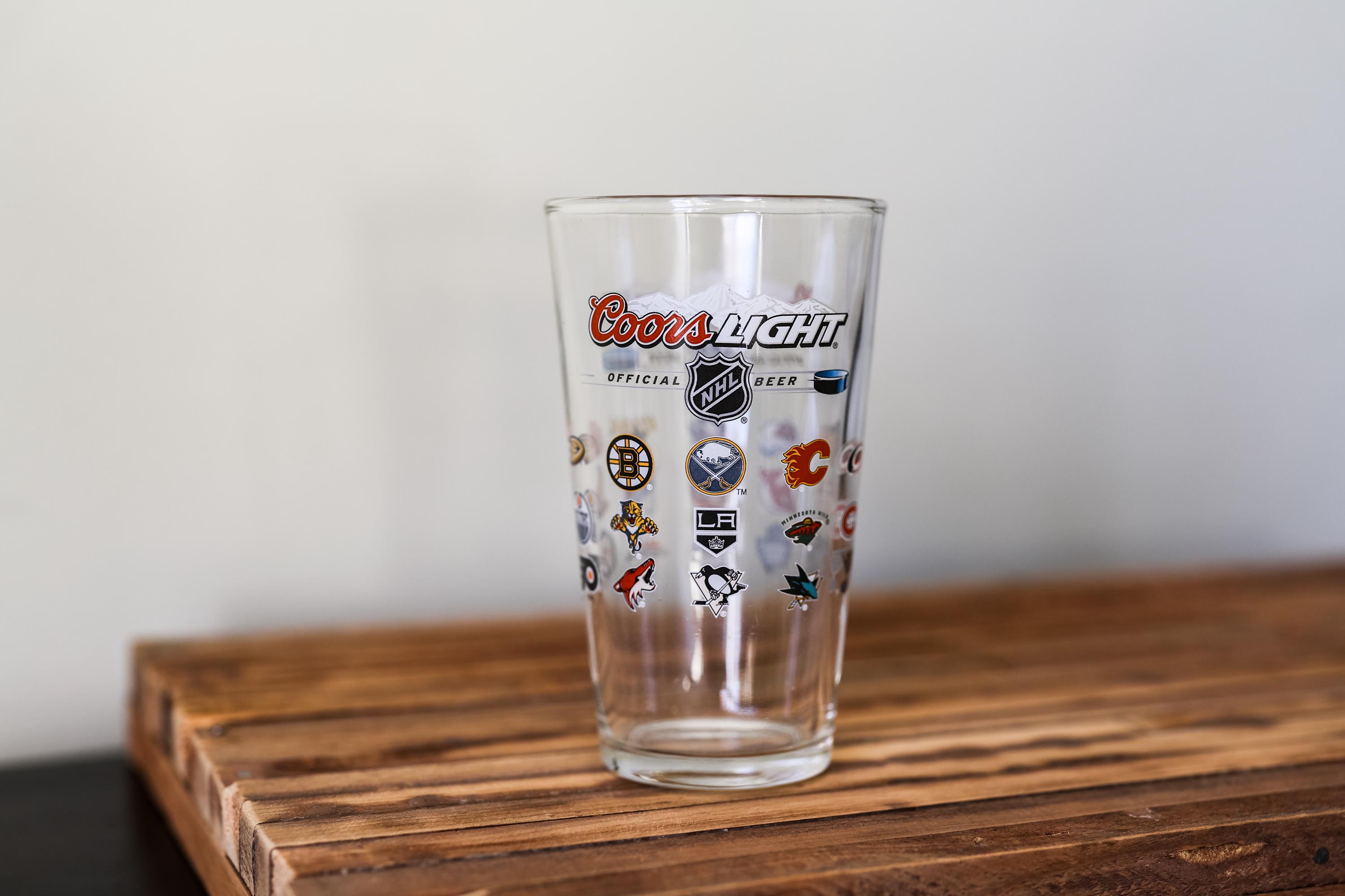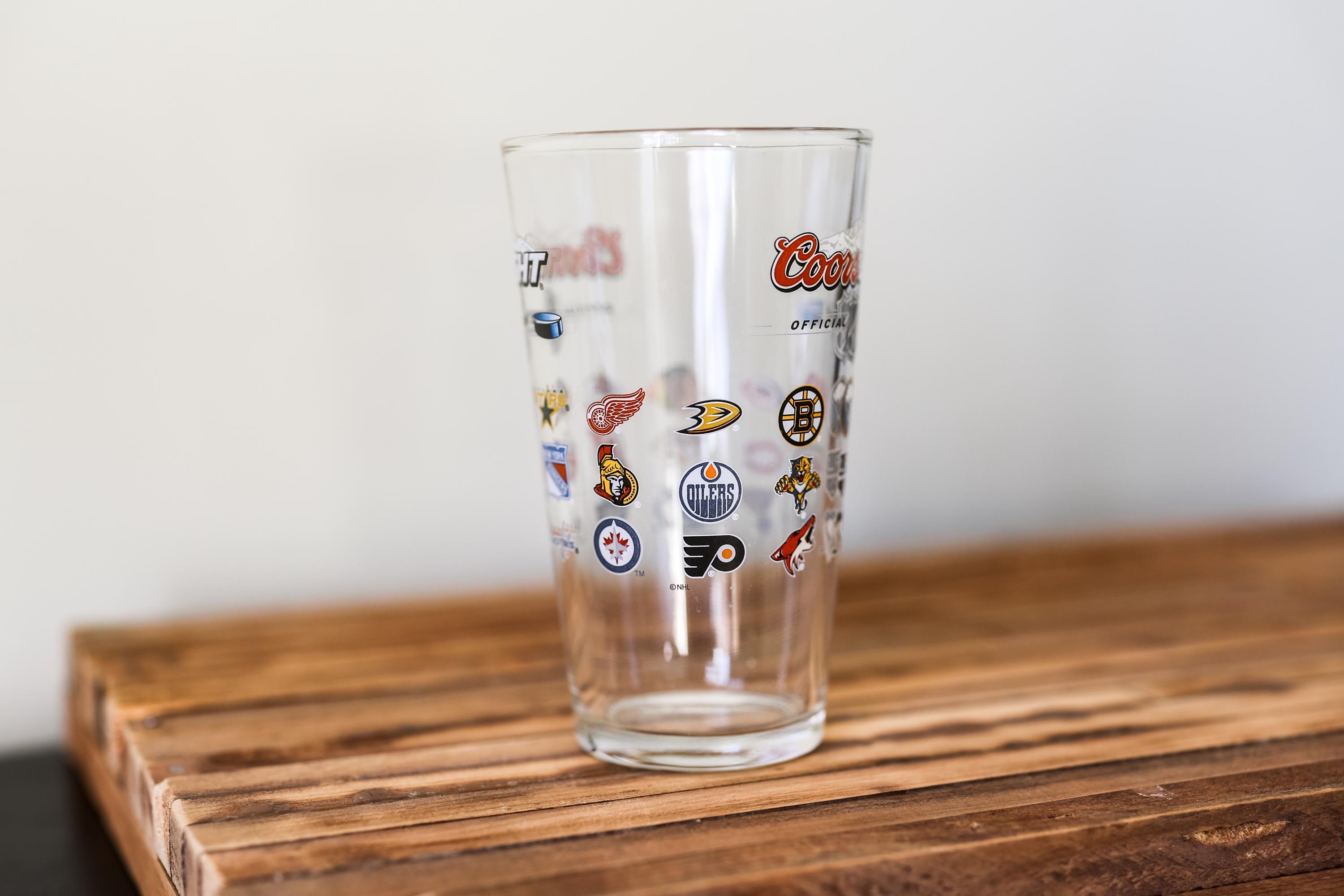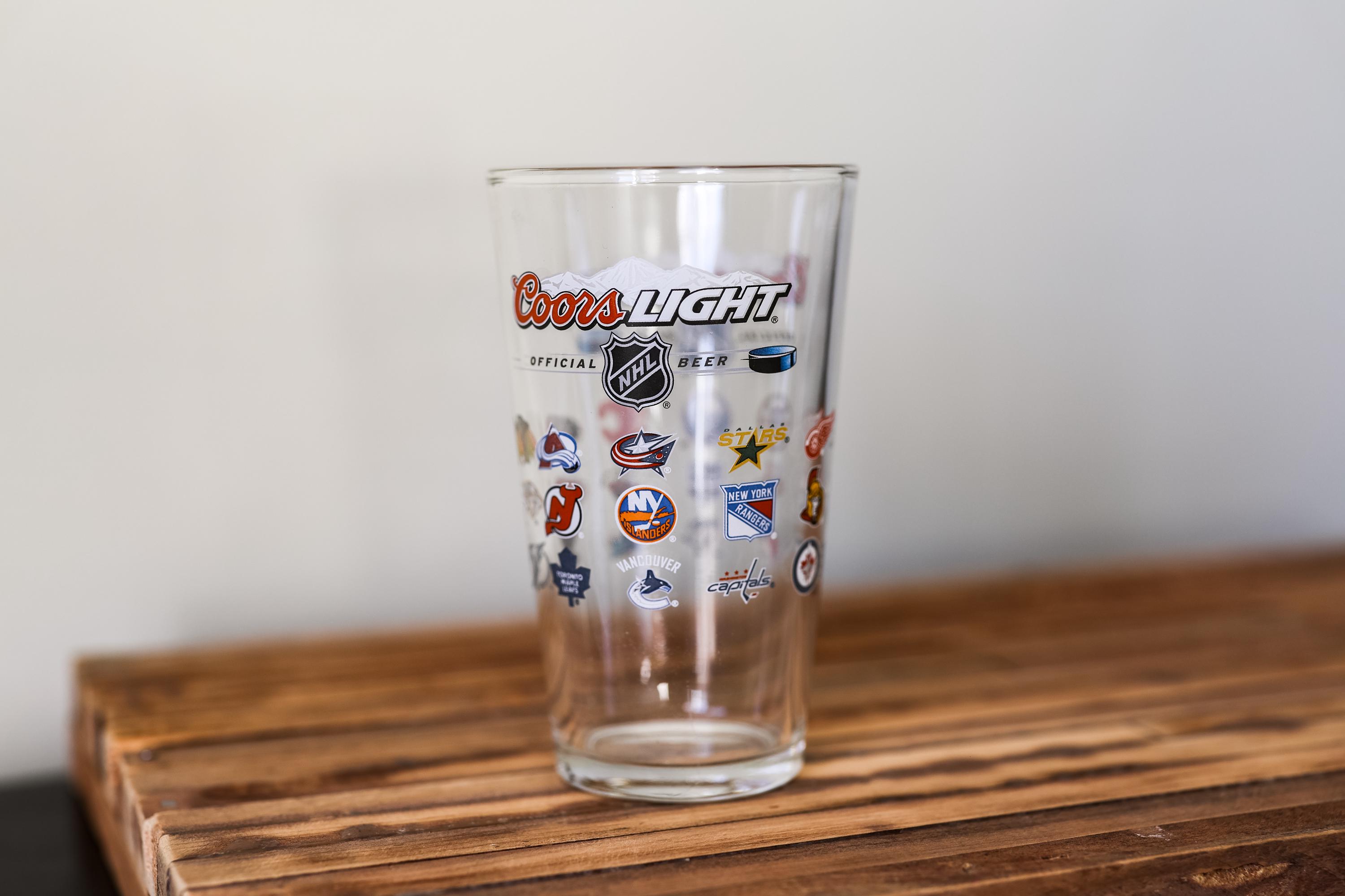 This is a must have glass for that NHL fan in the house. This is a vintage Coors Light NHL glass featuring all the NHL team logos. Perfect for game-day beverages, bar displays, or as a gift! The glass does have some wear and could use a good cleaning. There is a scratch that goes through the one side of the logo but there is no chips or cracks its just on the decal. Its approx. 6 x 3 1/2 inches.