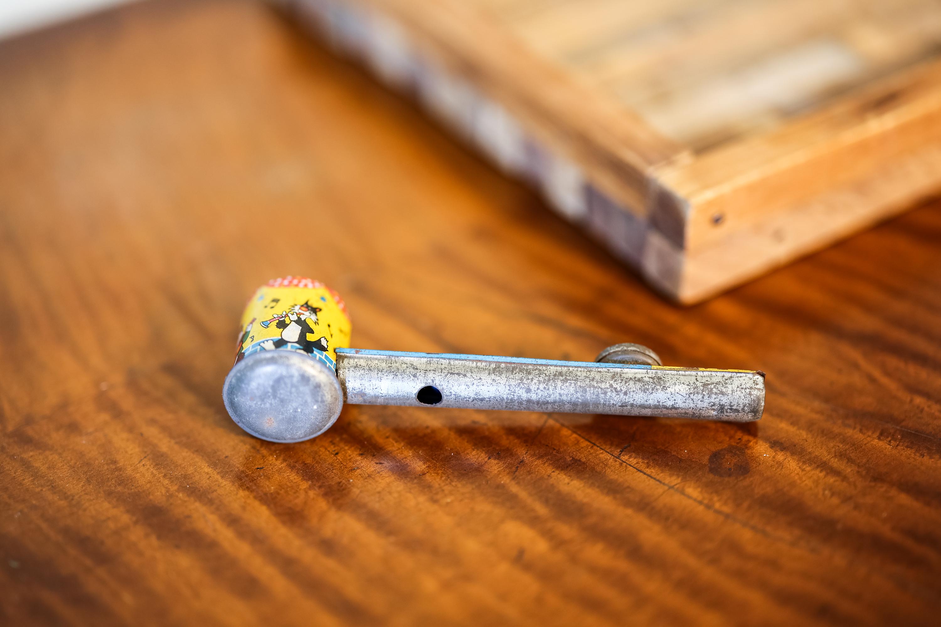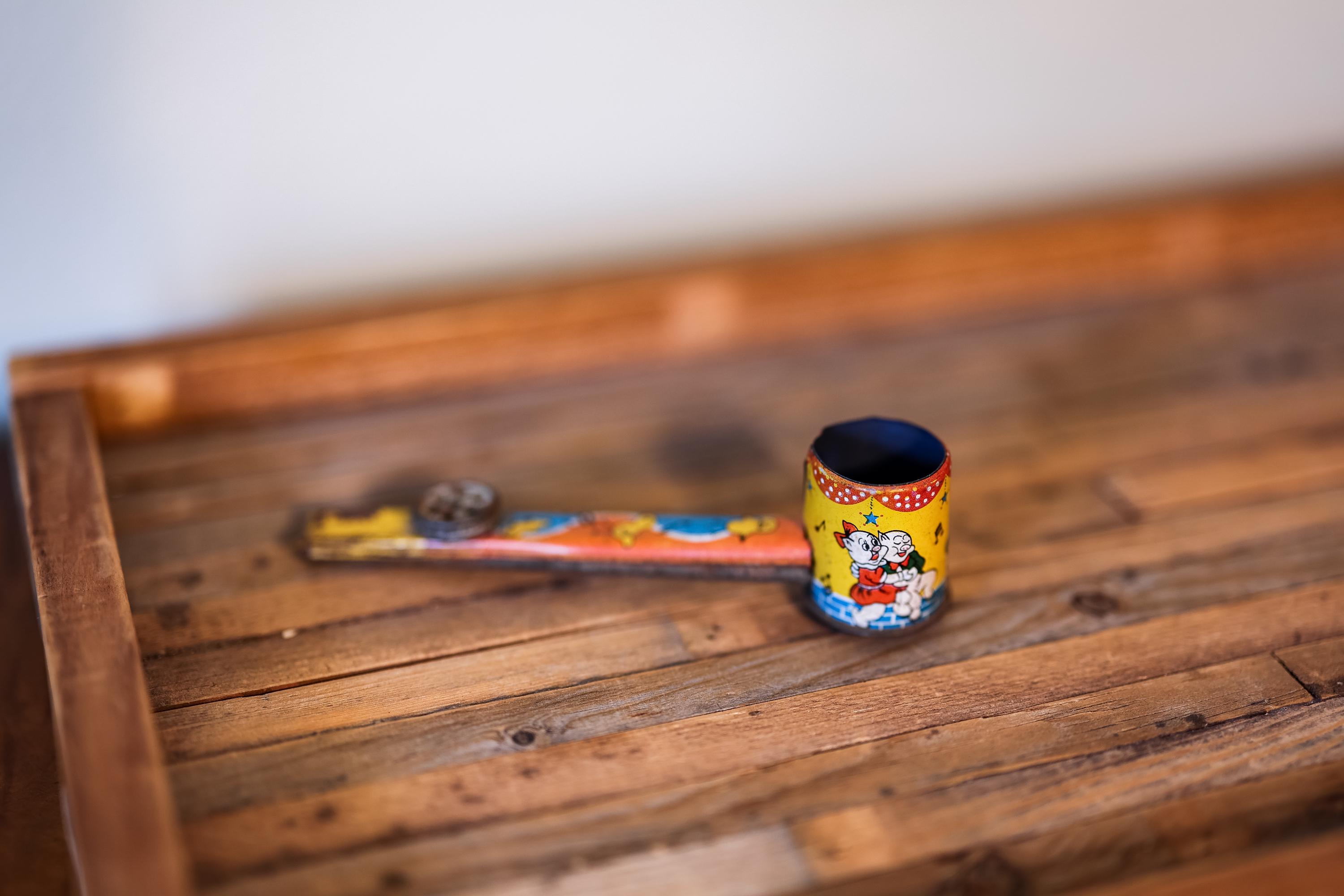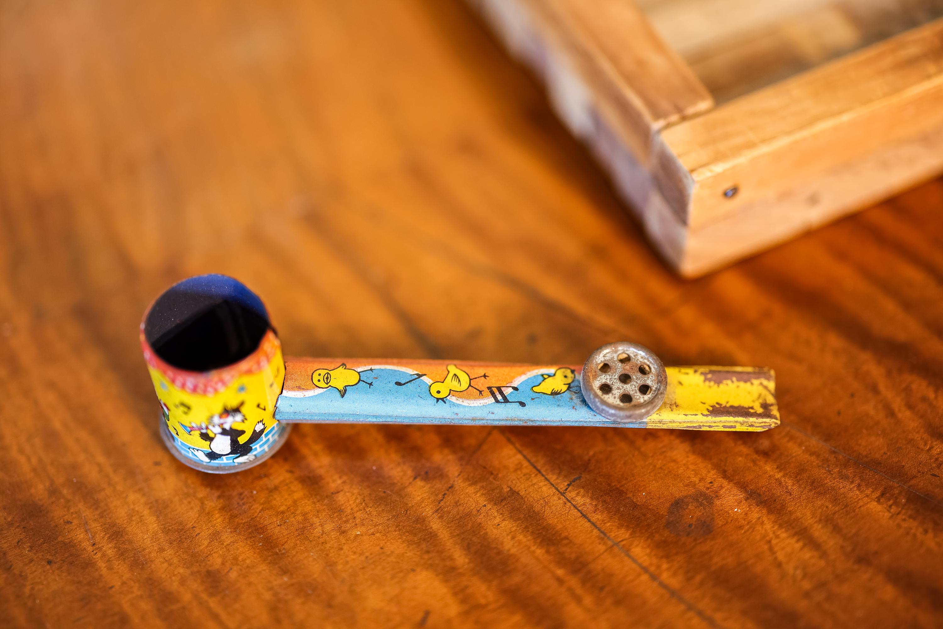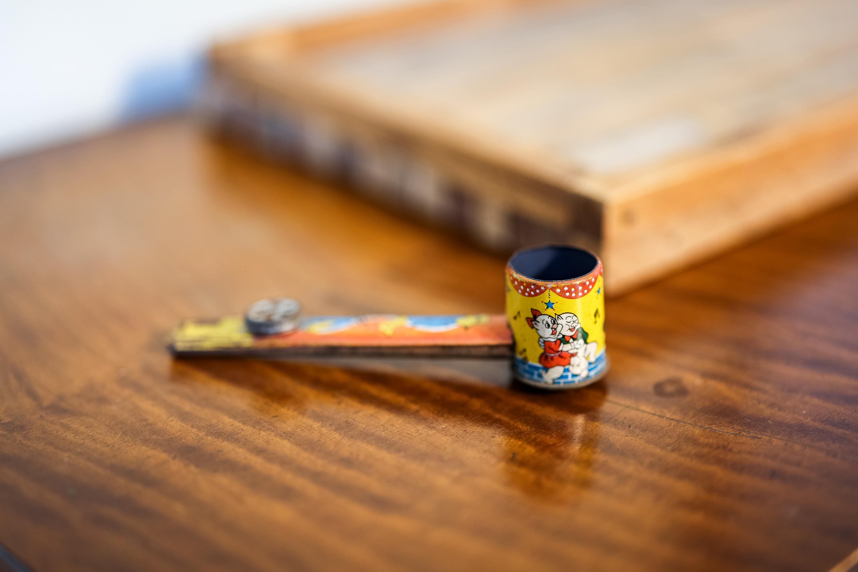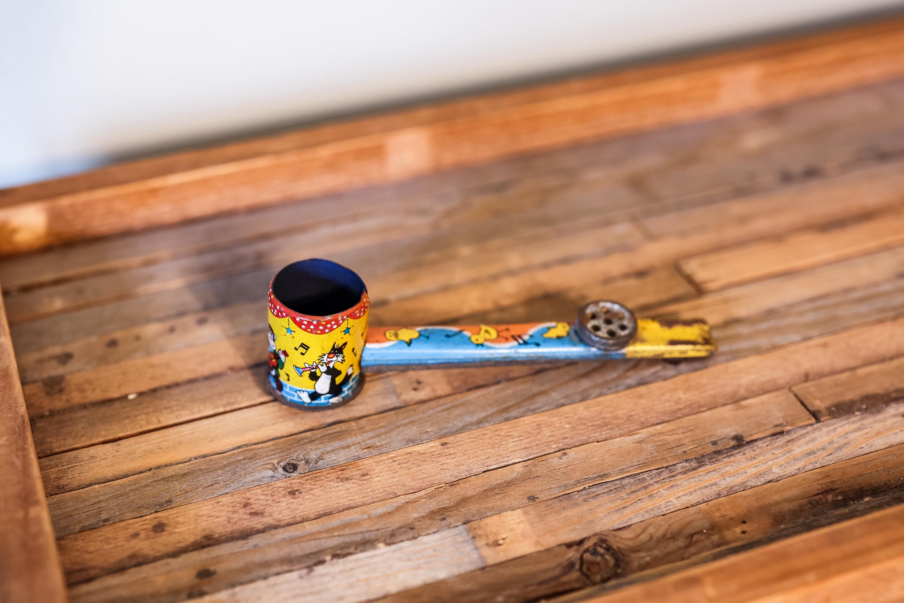 How awesome is this vintage noise maker! It is a Kazoo Pipe Tin Toy. It has an awesome vintage look. The colors still look really nice and we believe it is from the 1940s. There is some dings, wear and doesnt seem to work. We couldnt pass picking this up, we think it would look awesome on a shelf. It is approx. 6 x 1 1/2 x 1 1/4 inches. Please check out the photos for a closer look and if you have any questions please let me know. Thanks!