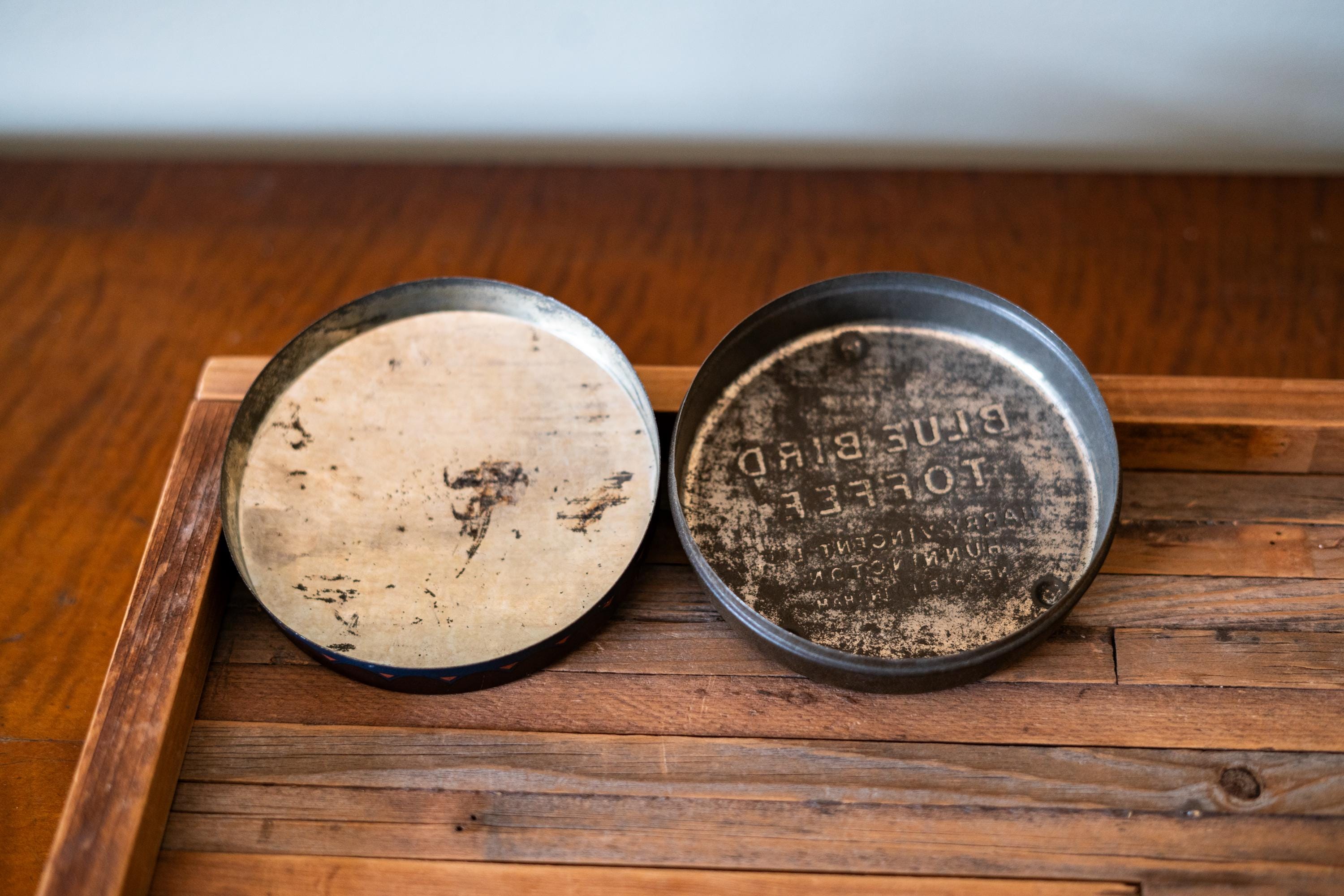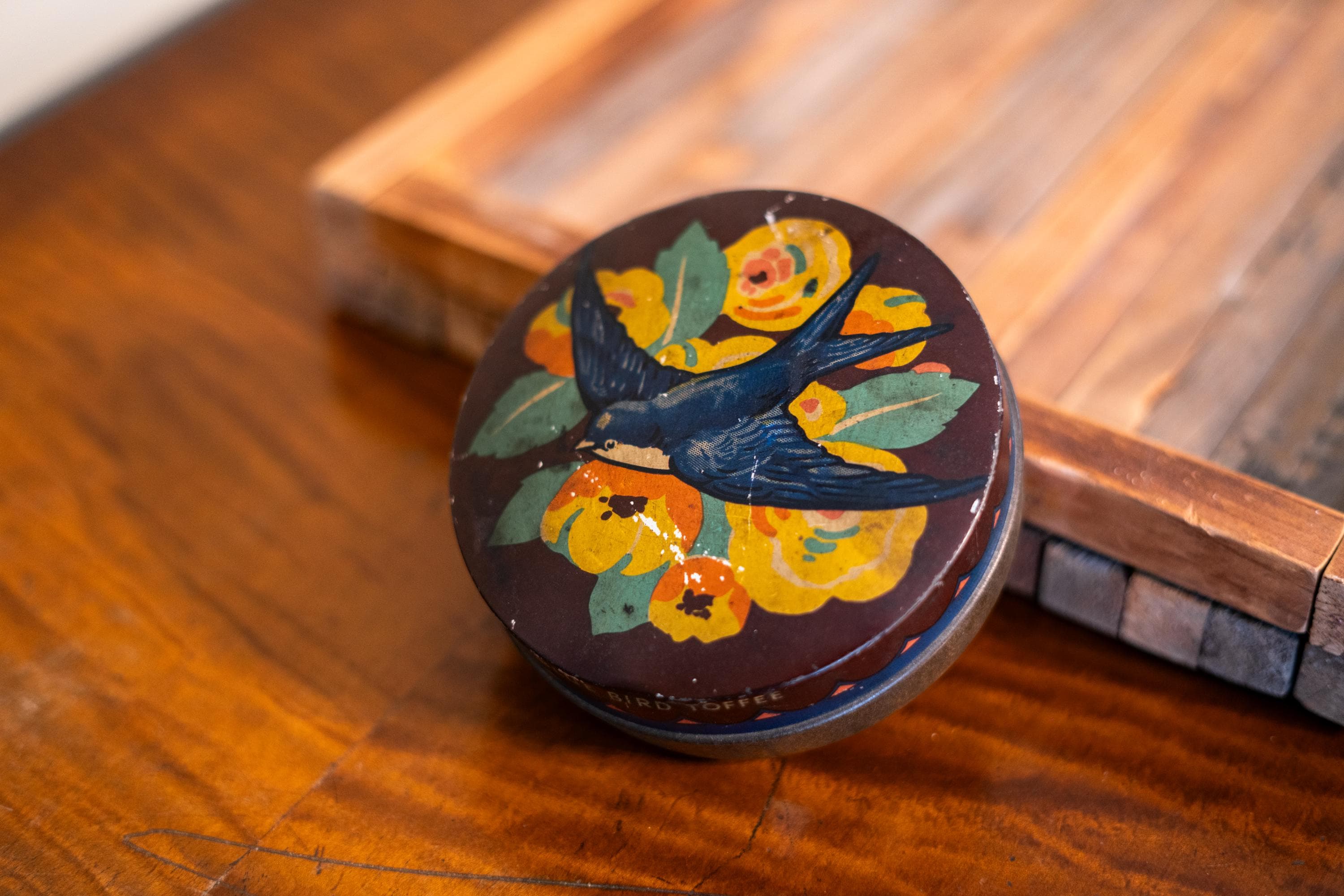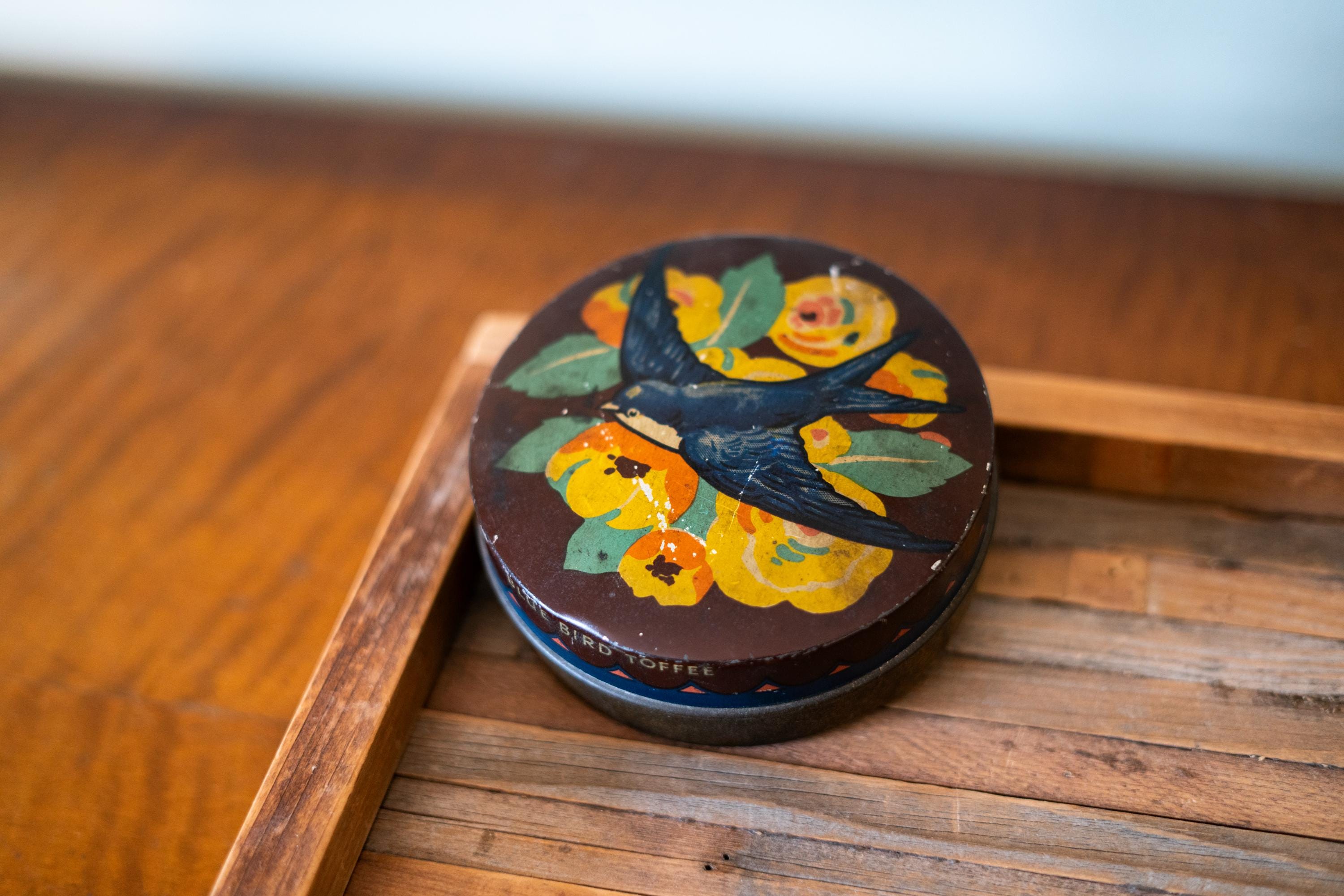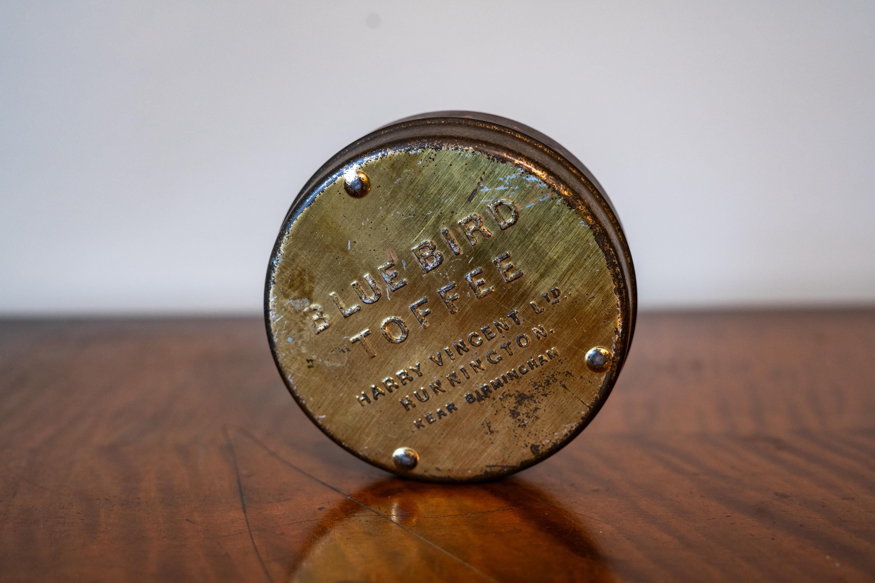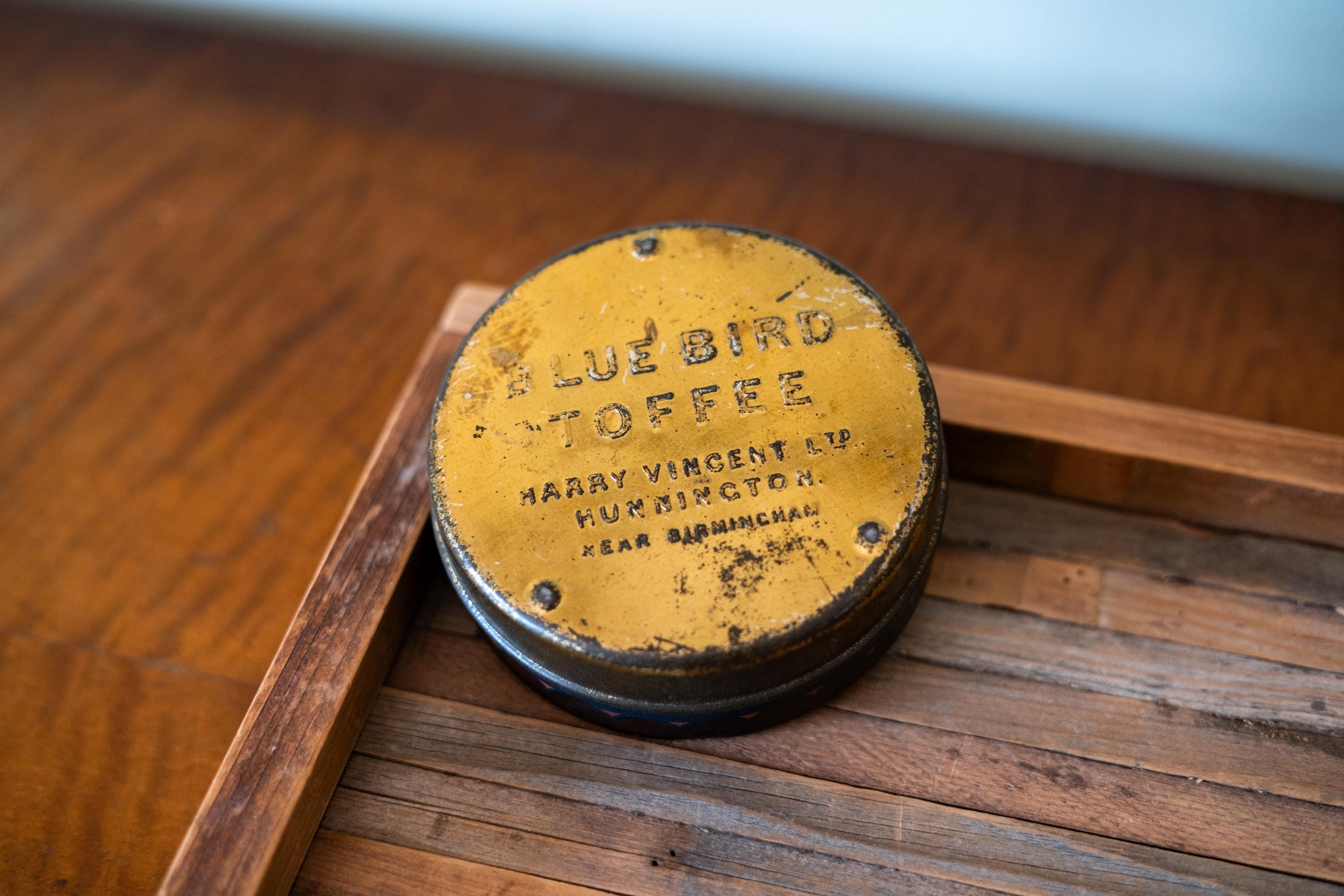 Check out this cool vintage tin! This is a Blue Bird Toffee Tin made by Harry Vincent LTD. It says on the back in embossed letters "Hunnington near Burmingham". The tin is approx. 4 1/2 x 1 3/4 inches. It does have wear, dings and scratches but it has such an awesome vintage look. Please check out the photos for a closer look and if you have any questions please let me know. Thanks!
