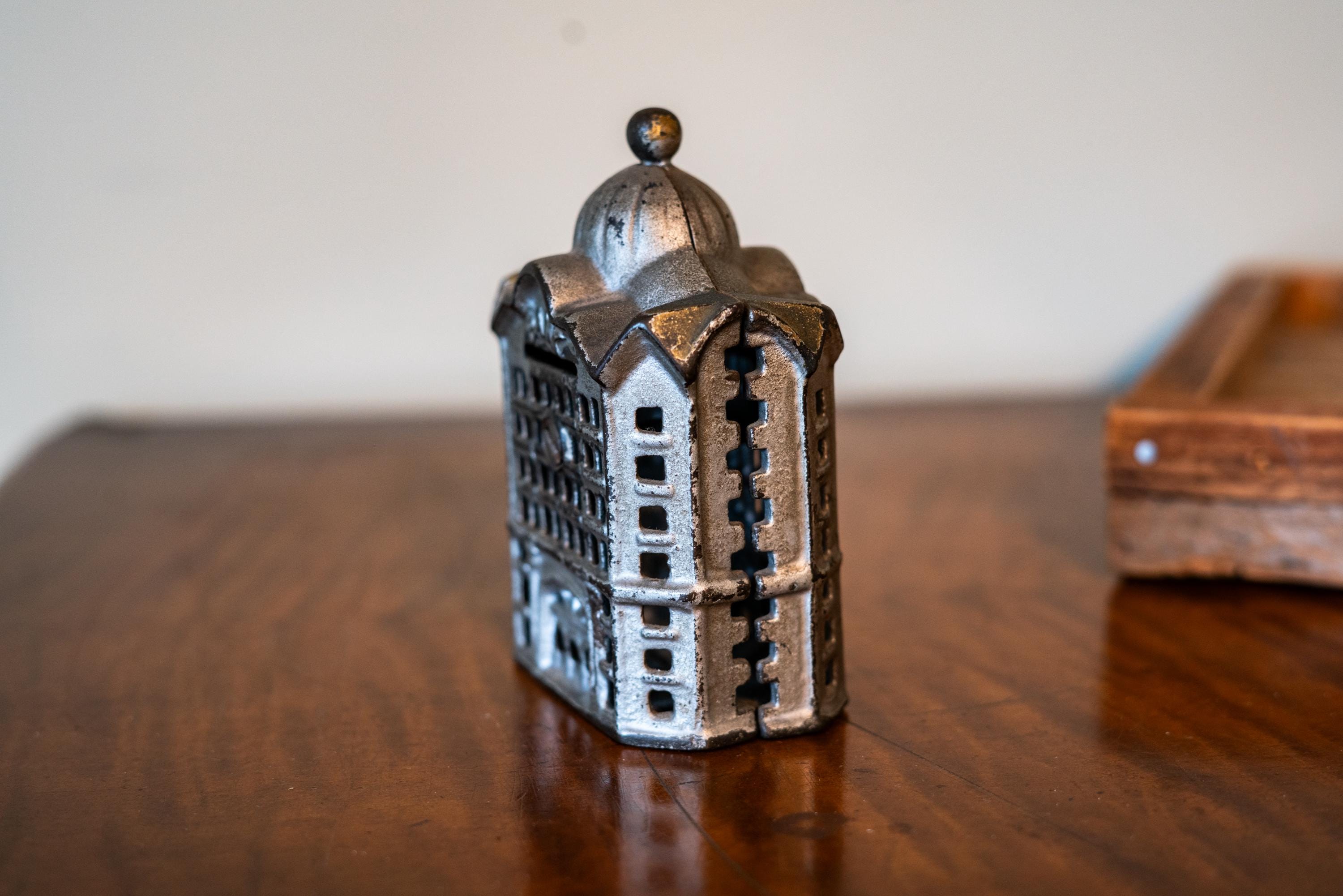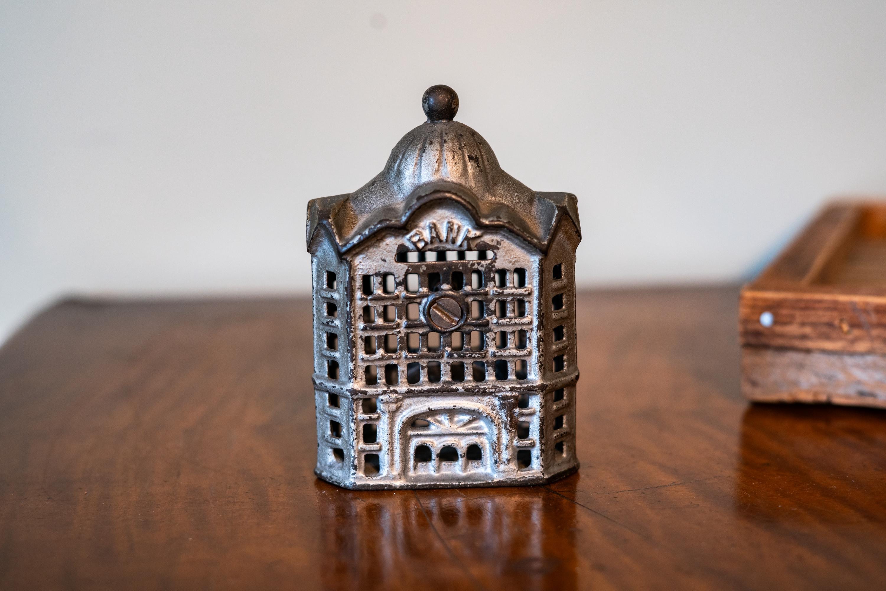 How awesome is this cast iron bank. It is a Bank Building and its approx. 4 1/2 x 3 1/4 x 2 inches. The bank does have some wear to it but all in all a cool conversation piece and display piece. We just picked a few really awesome cast iron banks so make sure you check out the other ones as well. Please look at the photos for a closer look and if you have any questions please let me know. Thanks!