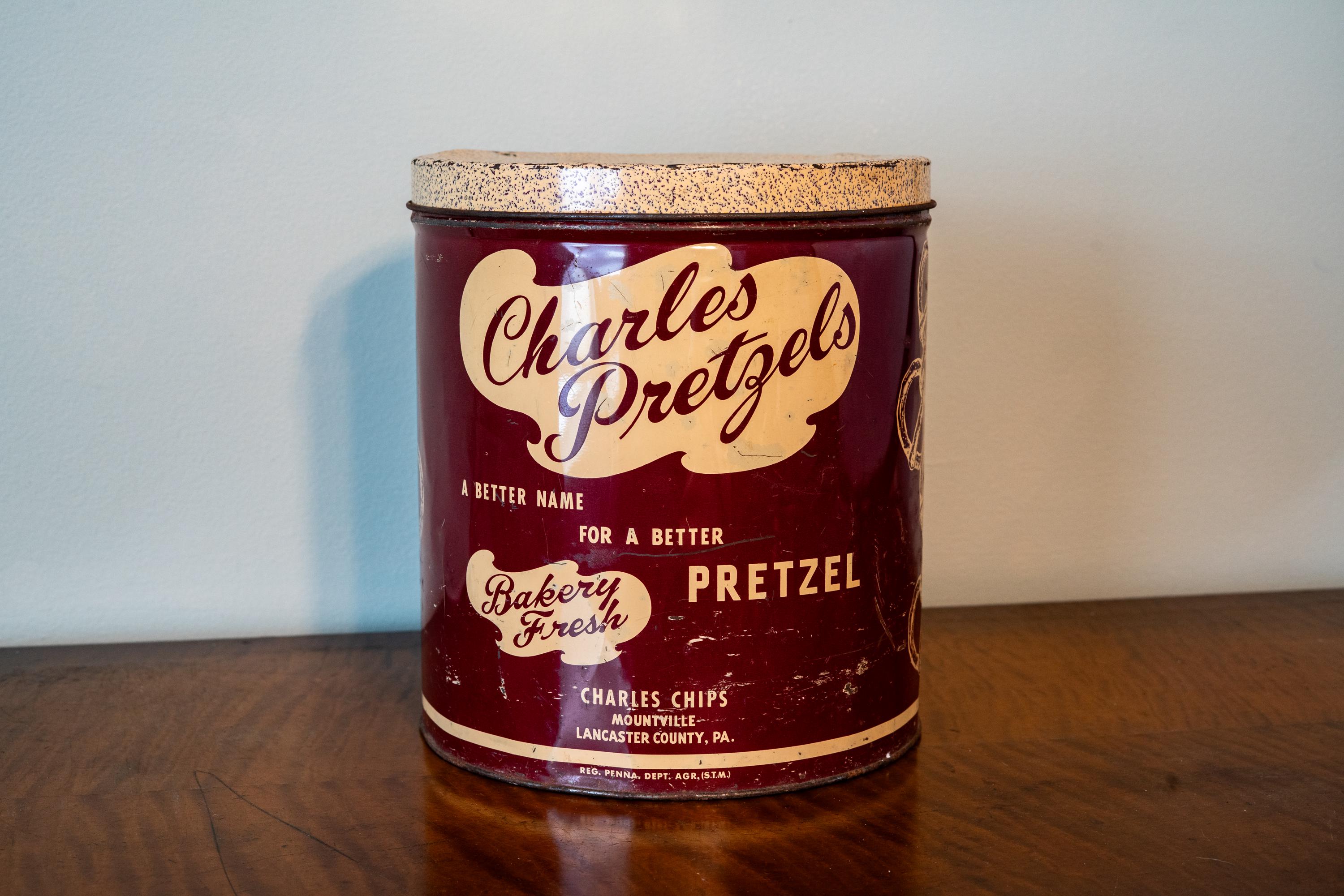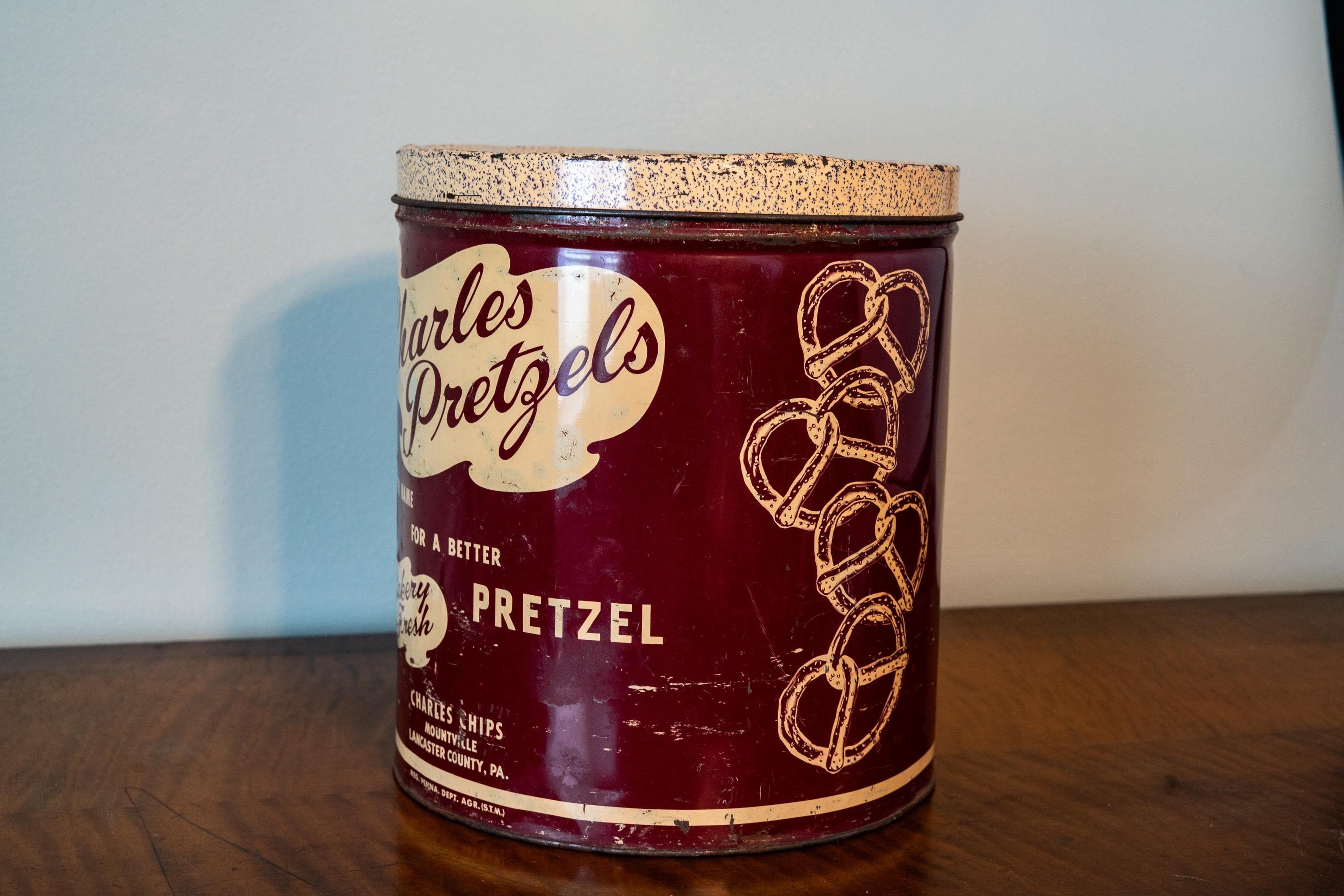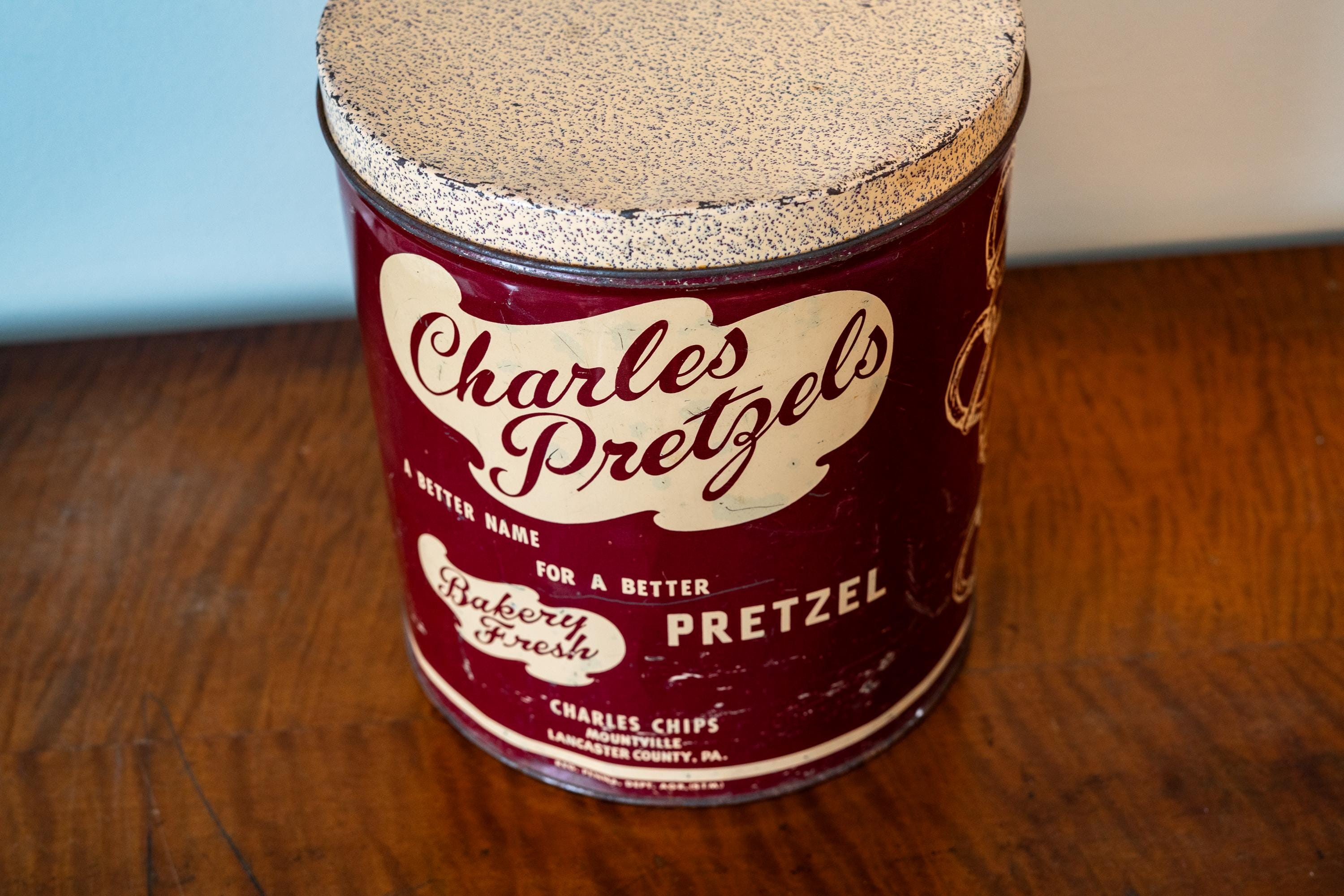 This is a great looking advertising tin. This is a Charles Pretzel Tin. It does have a lot of wear, scratches, rust and dents. Its a brown and cream color tin and would make a great display piece. It is approx. 9 1/2 x 8 1/4 x 8 1/4 inches. The inside is fairly clean and the lid still opens and closes but the rim is pretty bent up. The front says "Musser's Potato Chips Inc, General Offices Mountville, PA 17554”. Please check out the photos for a closer look and if you have any questions please let me know. Thanks!
