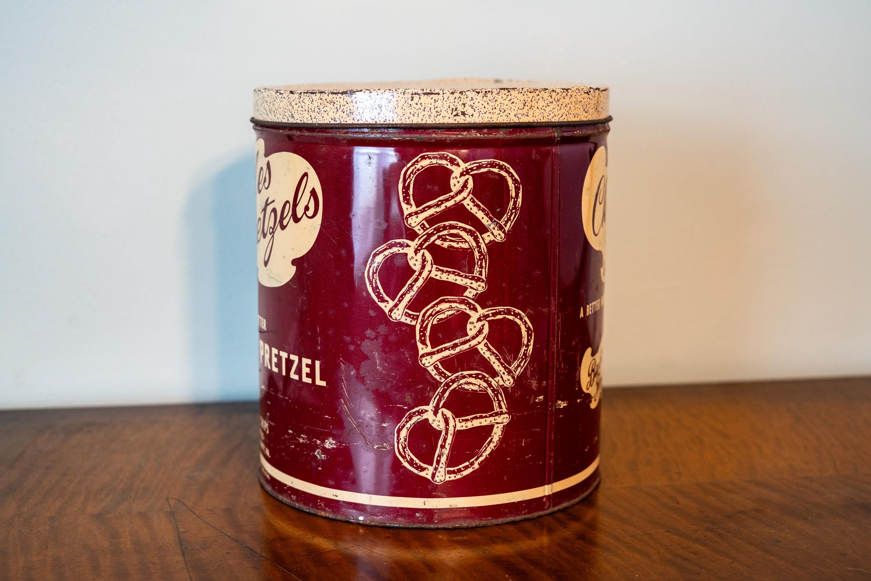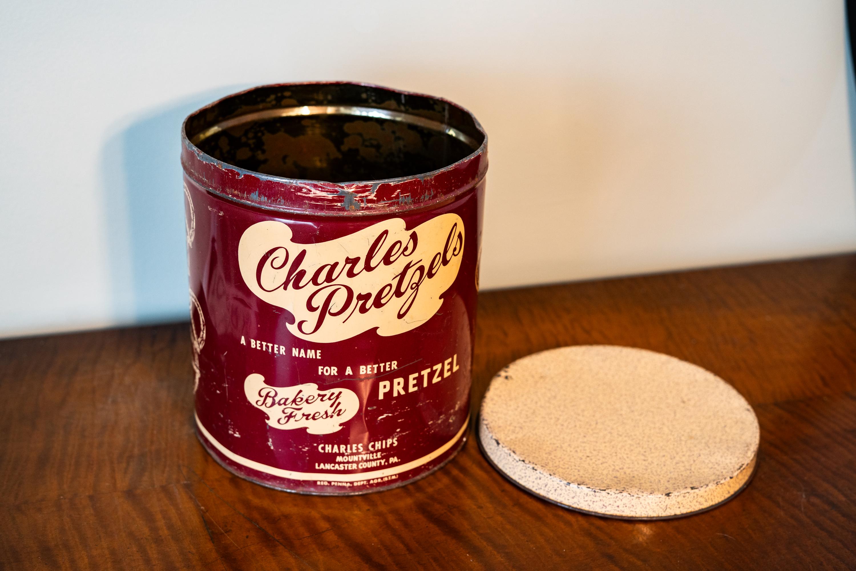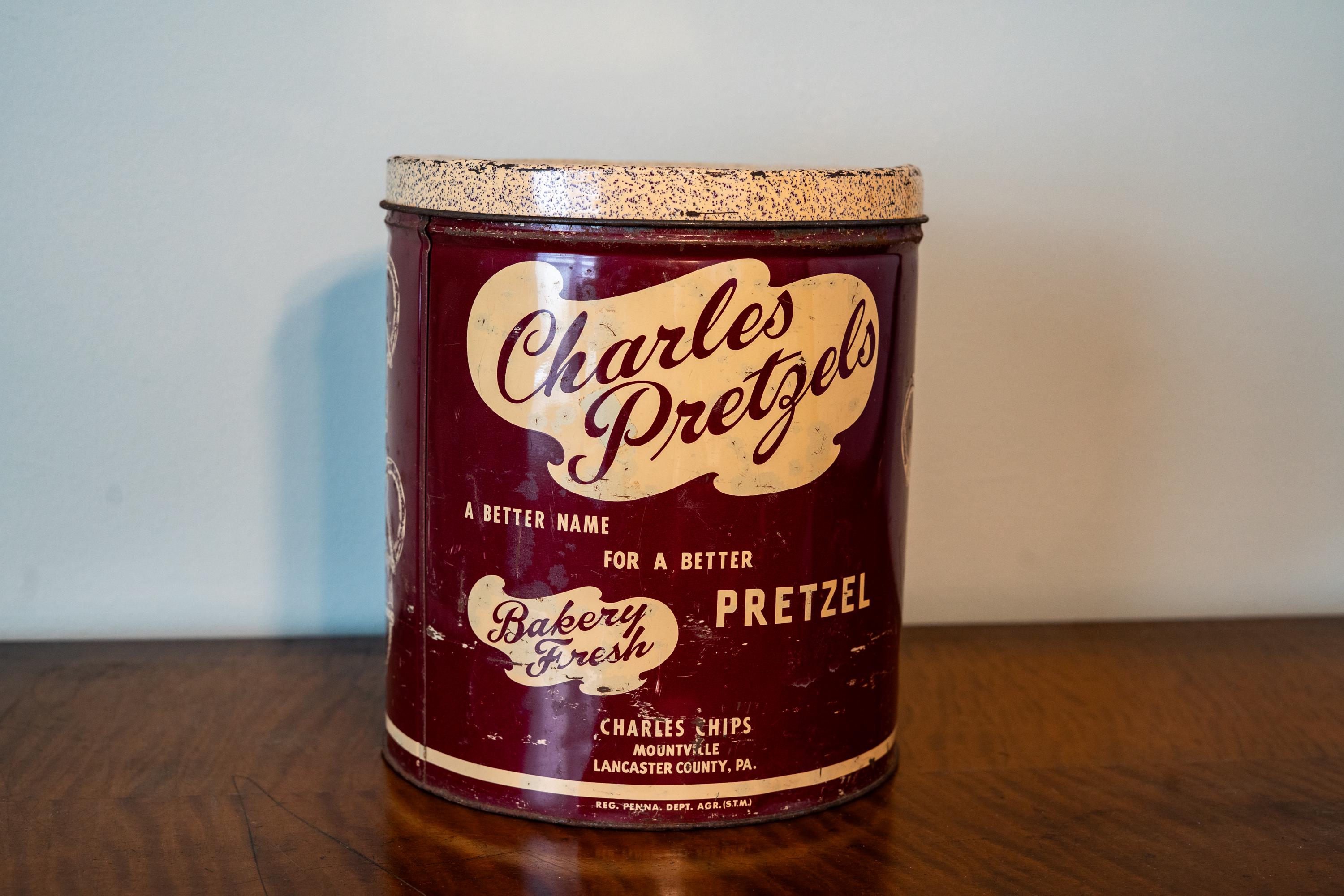 This is a great looking advertising tin. This is a Charles Pretzel Tin. It does have a lot of wear, scratches, rust and dents. Its a brown and cream color tin and would make a great display piece. It is approx. 9 1/2 x 8 1/4 x 8 1/4 inches. The inside is fairly clean and the lid still opens and closes but the rim is pretty bent up. The front says "Musser's Potato Chips Inc, General Offices Mountville, PA 17554”. Please check out the photos for a closer look and if you have any questions please let me know. Thanks!