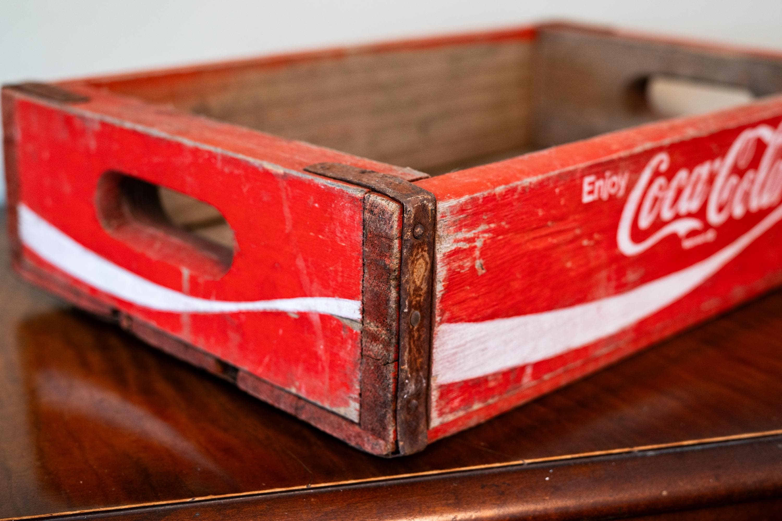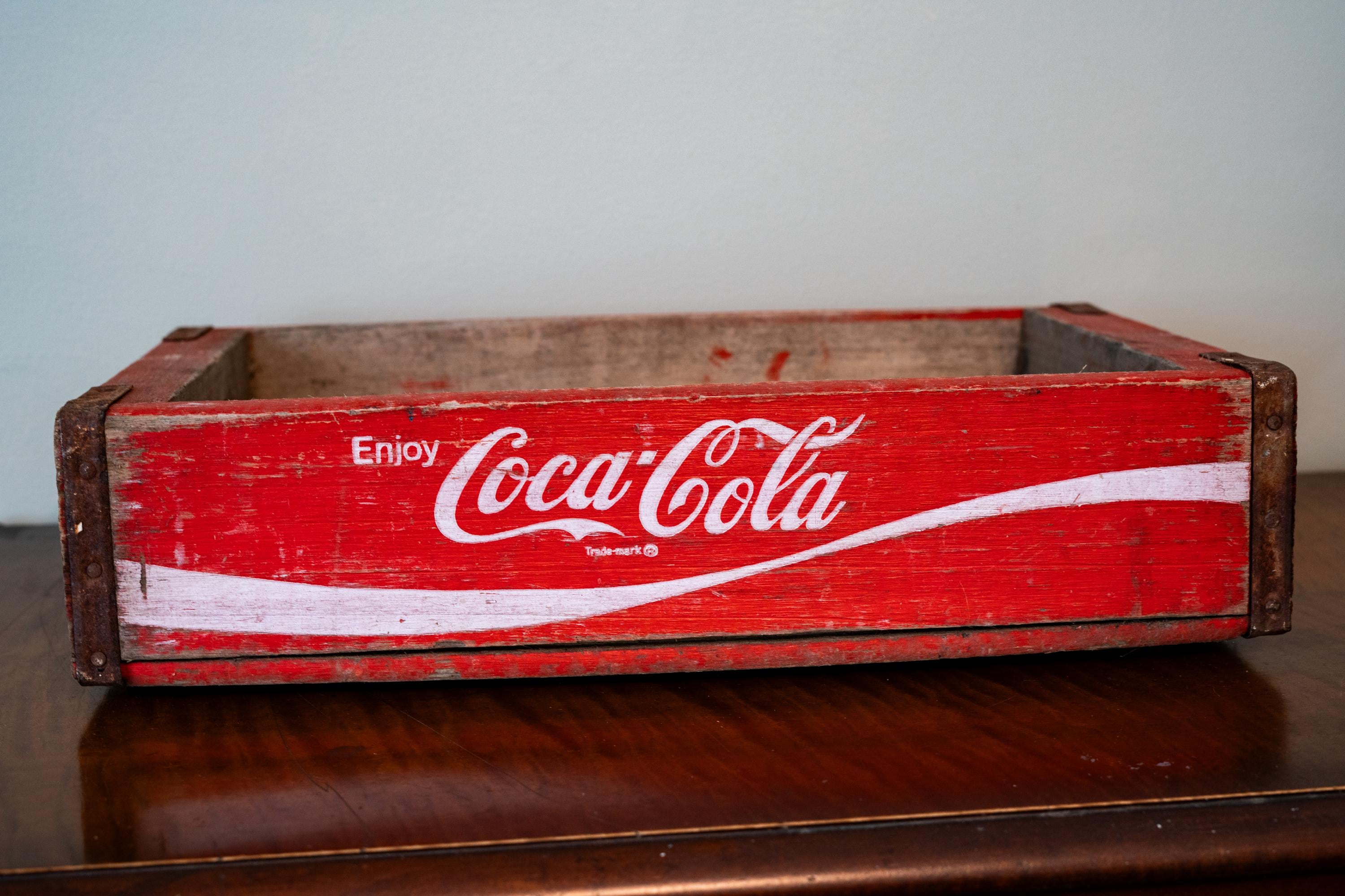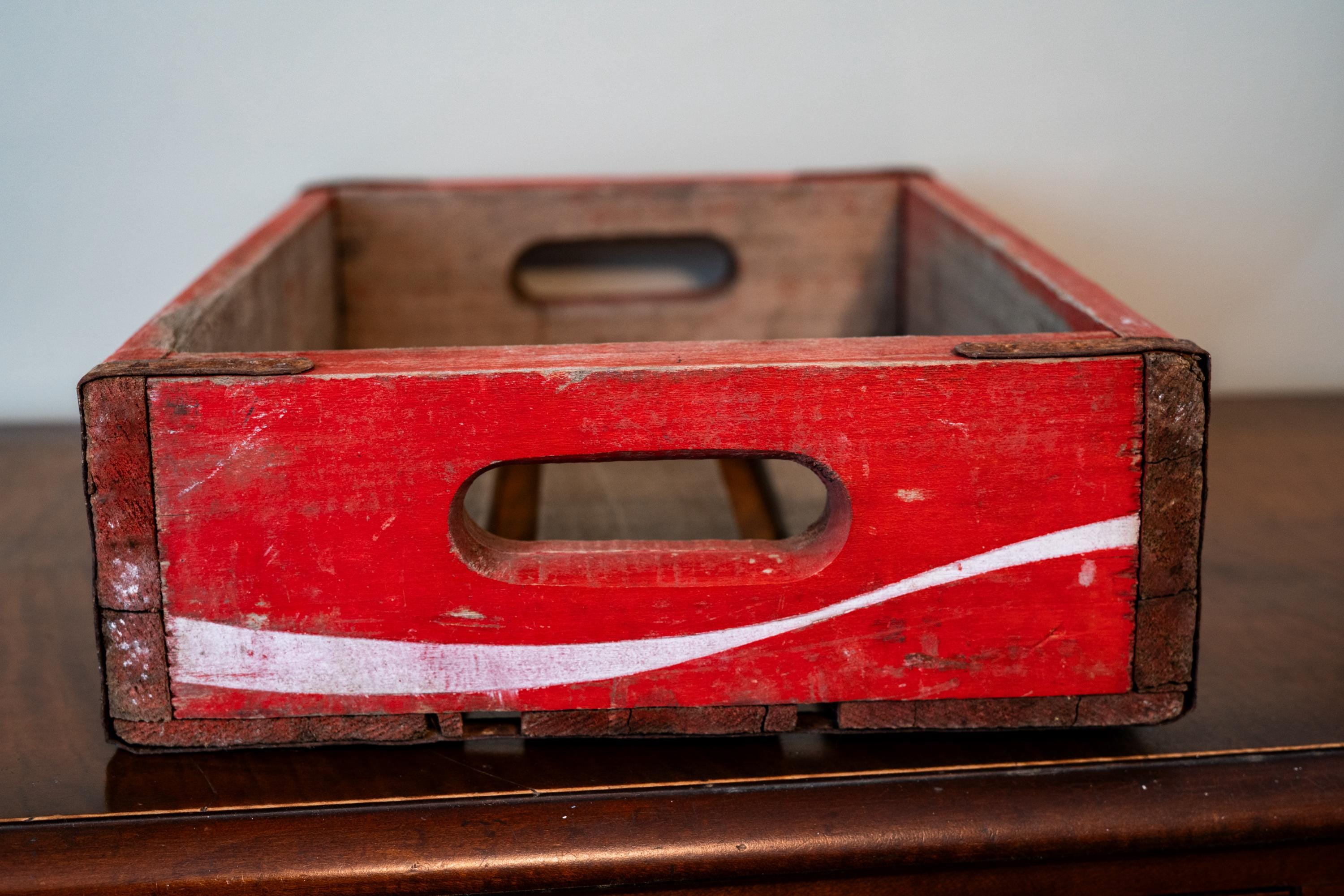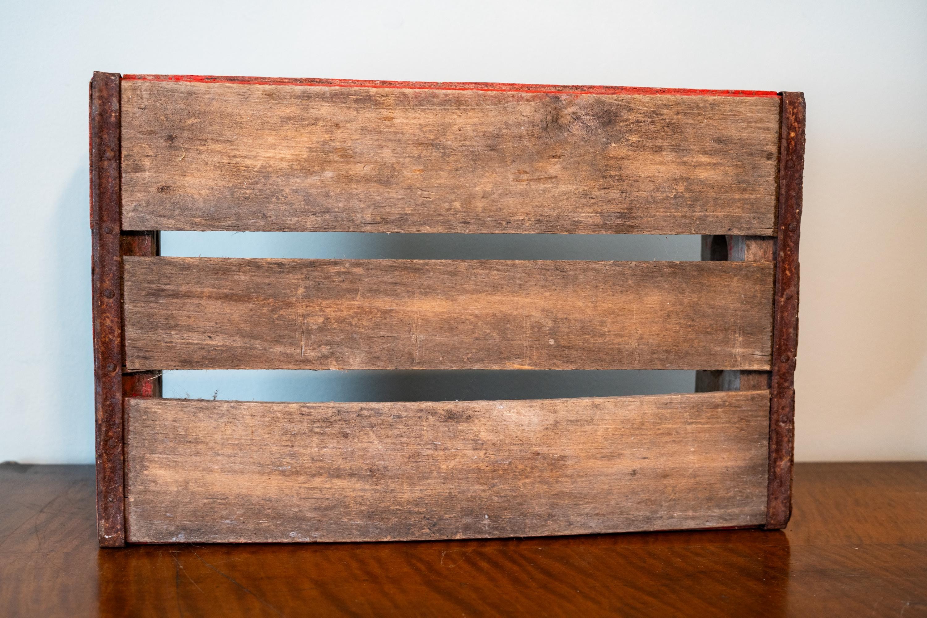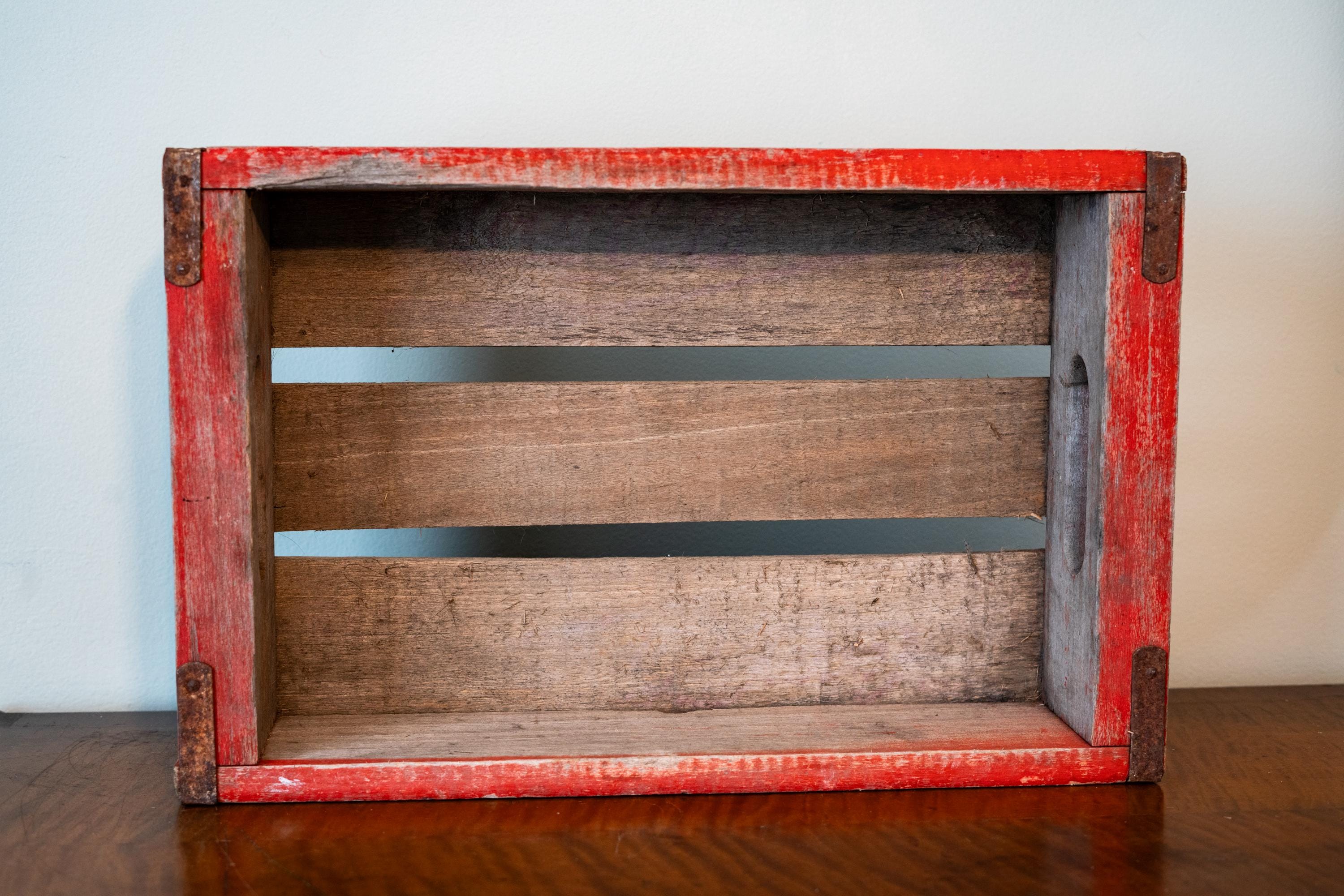 This is a Vintage Coca-Cola Soda Pop Wooden Crate. It is red with white writing. We picked up a ton crates lately so make sure to check out the others as well. The crate does have some wear and could use a nice wipe down. There are some scratches, rust and dings. It is approx. 18 x 11 1/2 x 4 1/4 inches. One of the bottom panels sticks out a tad so the box doesnt sit flush on a flat service but all in all a great display piece. Please check out the photos for a closer look and if you have any questions please let me know. Thanks!