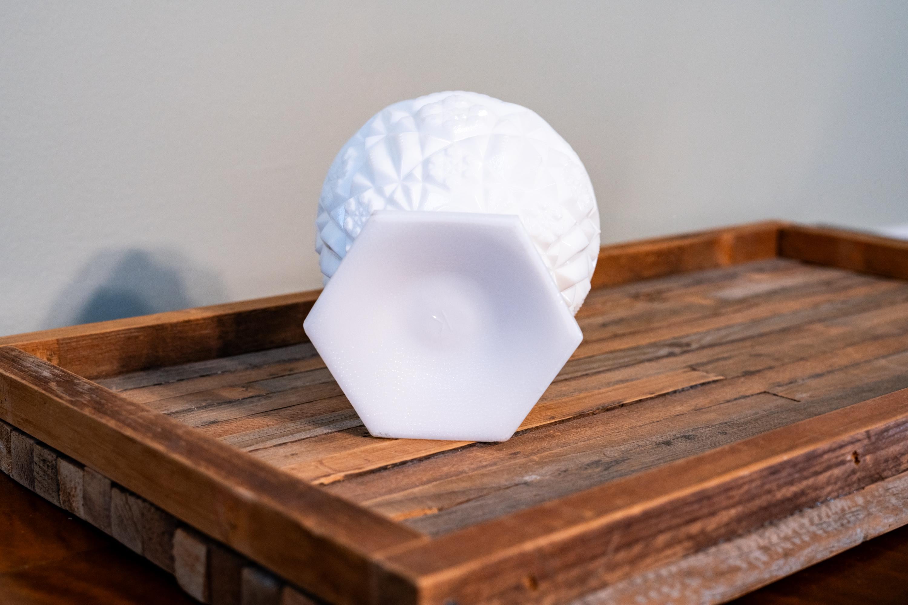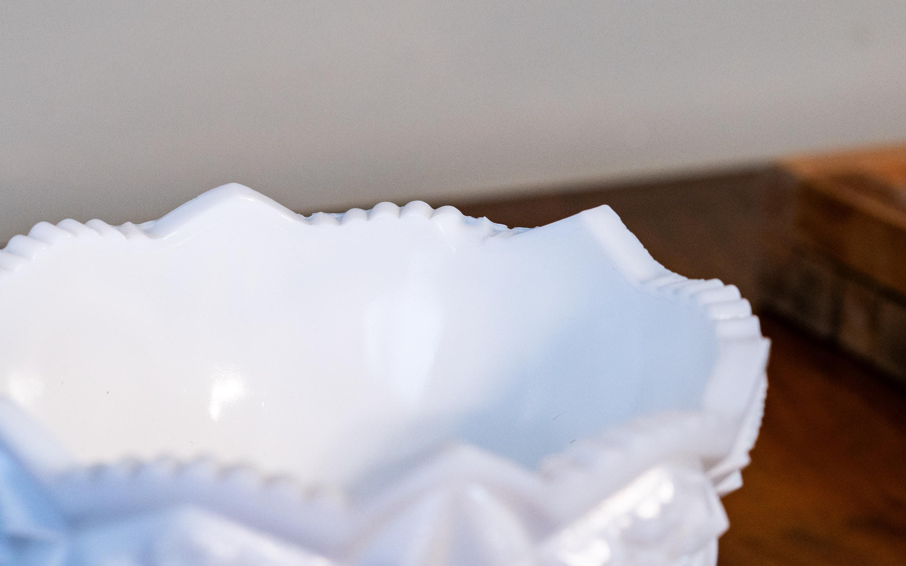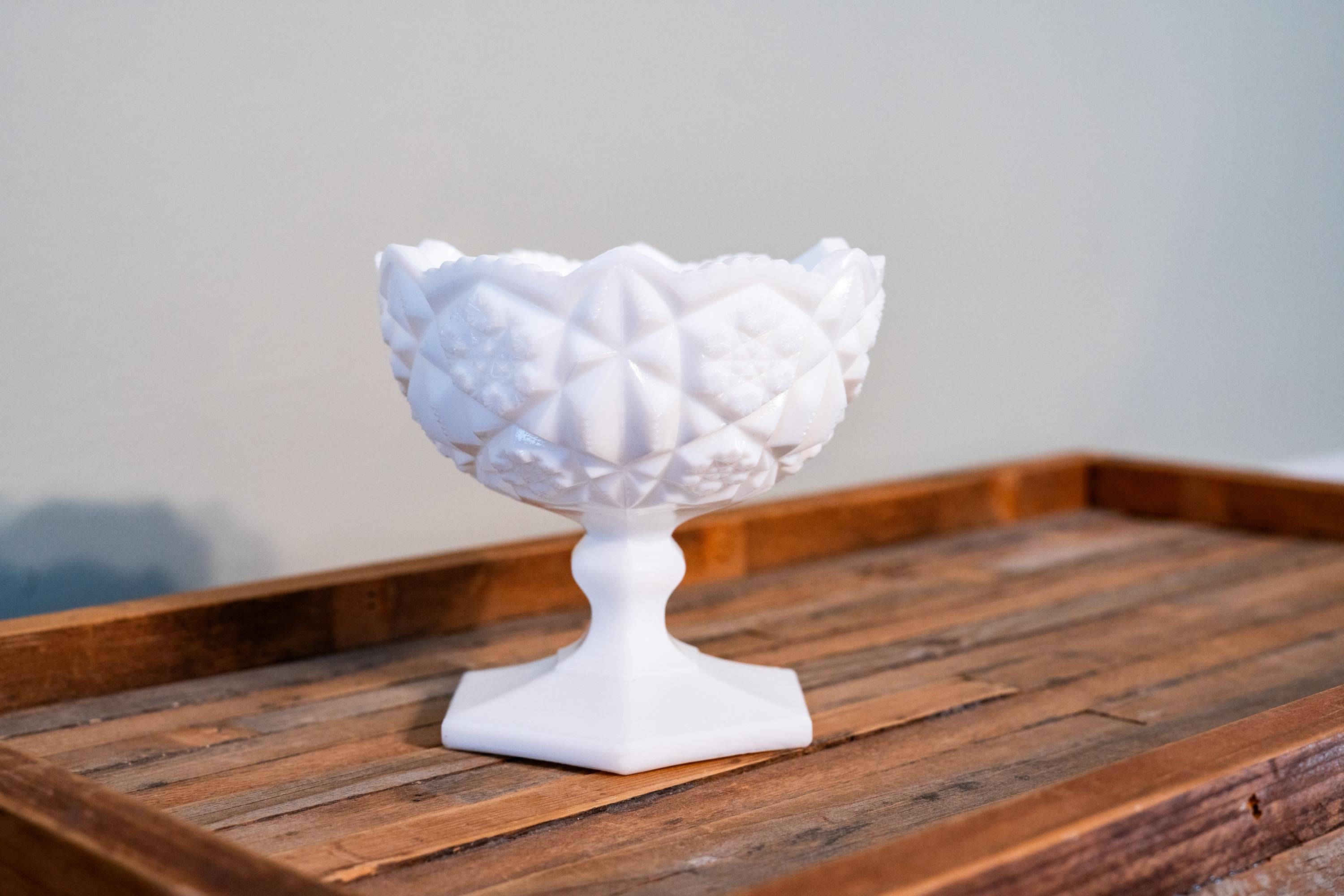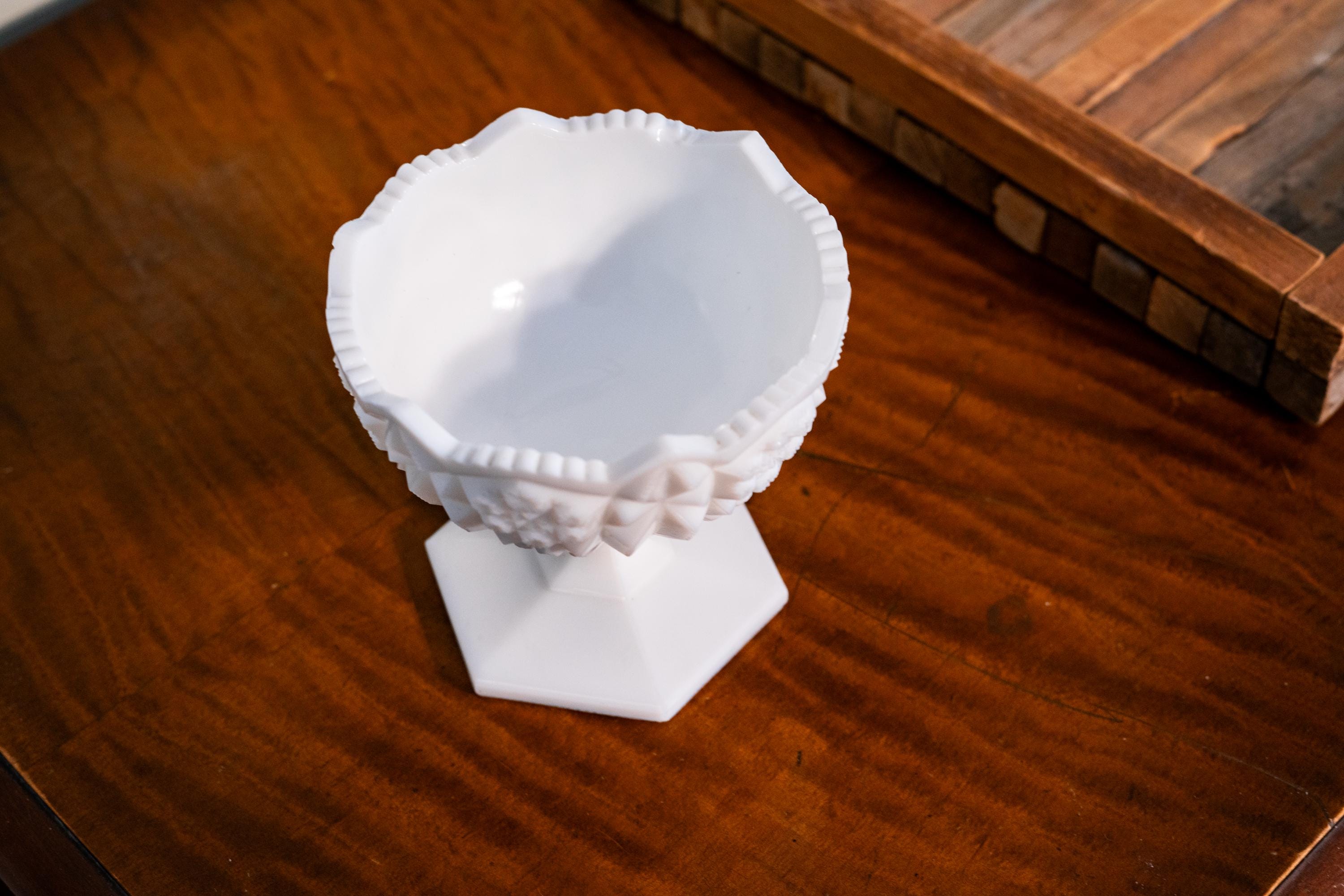 Add vintage charm to your home with this gorgeous Milk Glass Pedestal Cupped Compote. It is approx. 4 1/2 x 4 1/2 x 4 1/2 inches. The piece does have some wear, there are two chips on the inside lip as shown on the photo. These make great decor pieces.