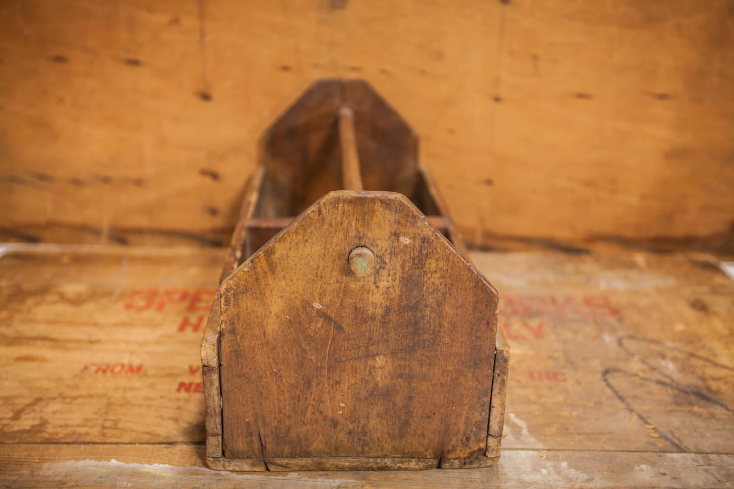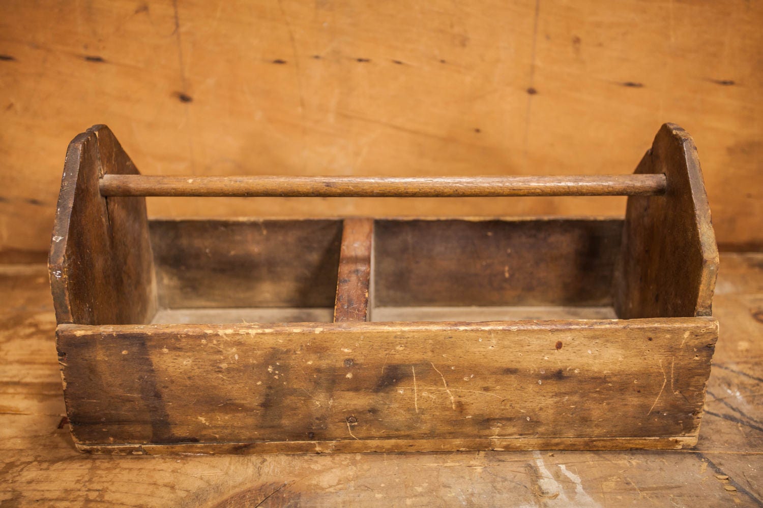 Take a look at this rustic wooden carrier. It is a great primitive piece to display in your home. It can also be used to carry tools around the house. It does have some wear and scratches on it as well as a crack on the one side but its still very sturdy. The carrier is approx. 13 1/2 x 6 1/2 x 6 1/2 inches. There are a few paint marks on it and two holes drilled into the bottom. Please check out the photos for a closer look and if you have any questions please let me know. Thanks!