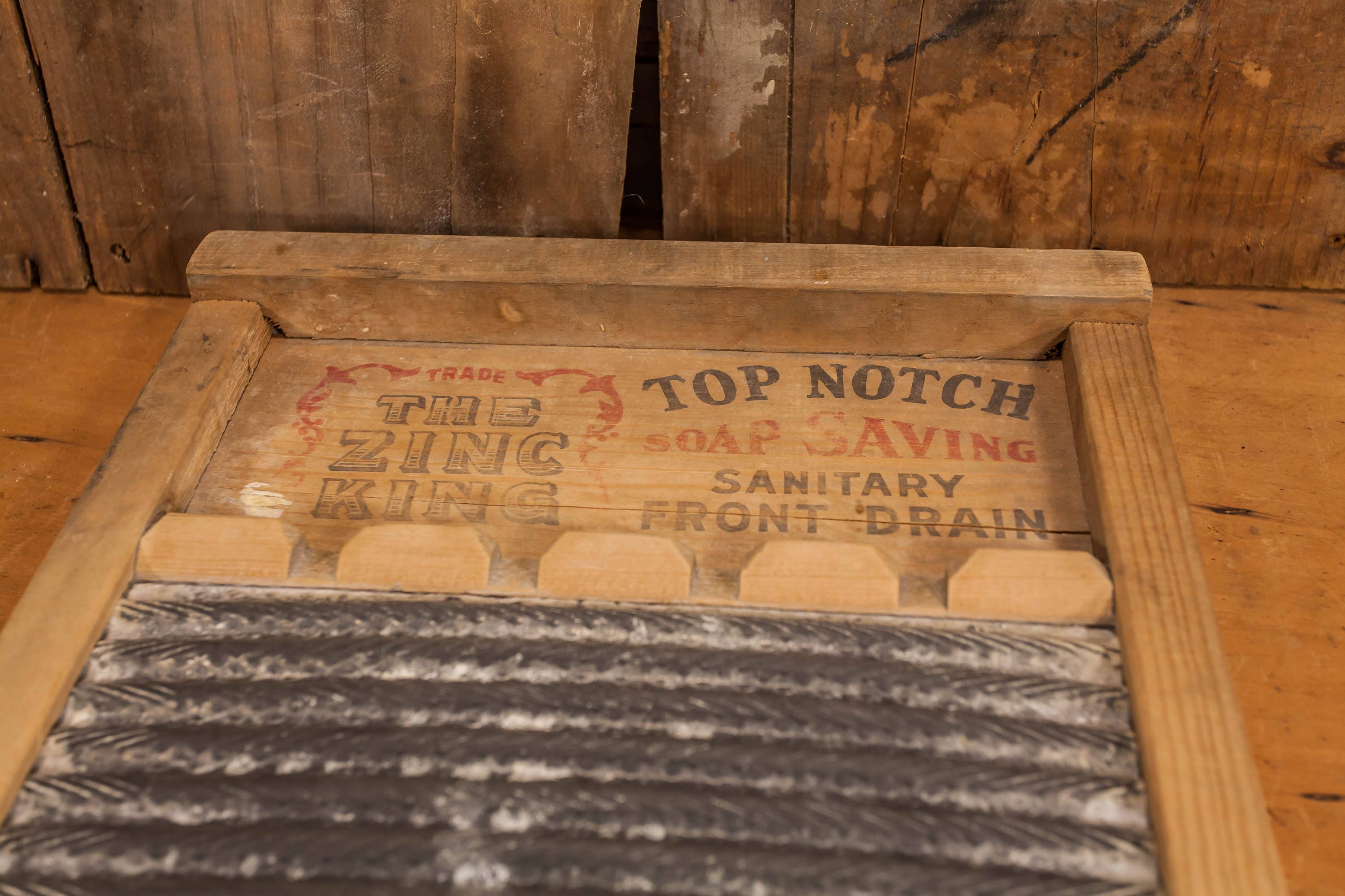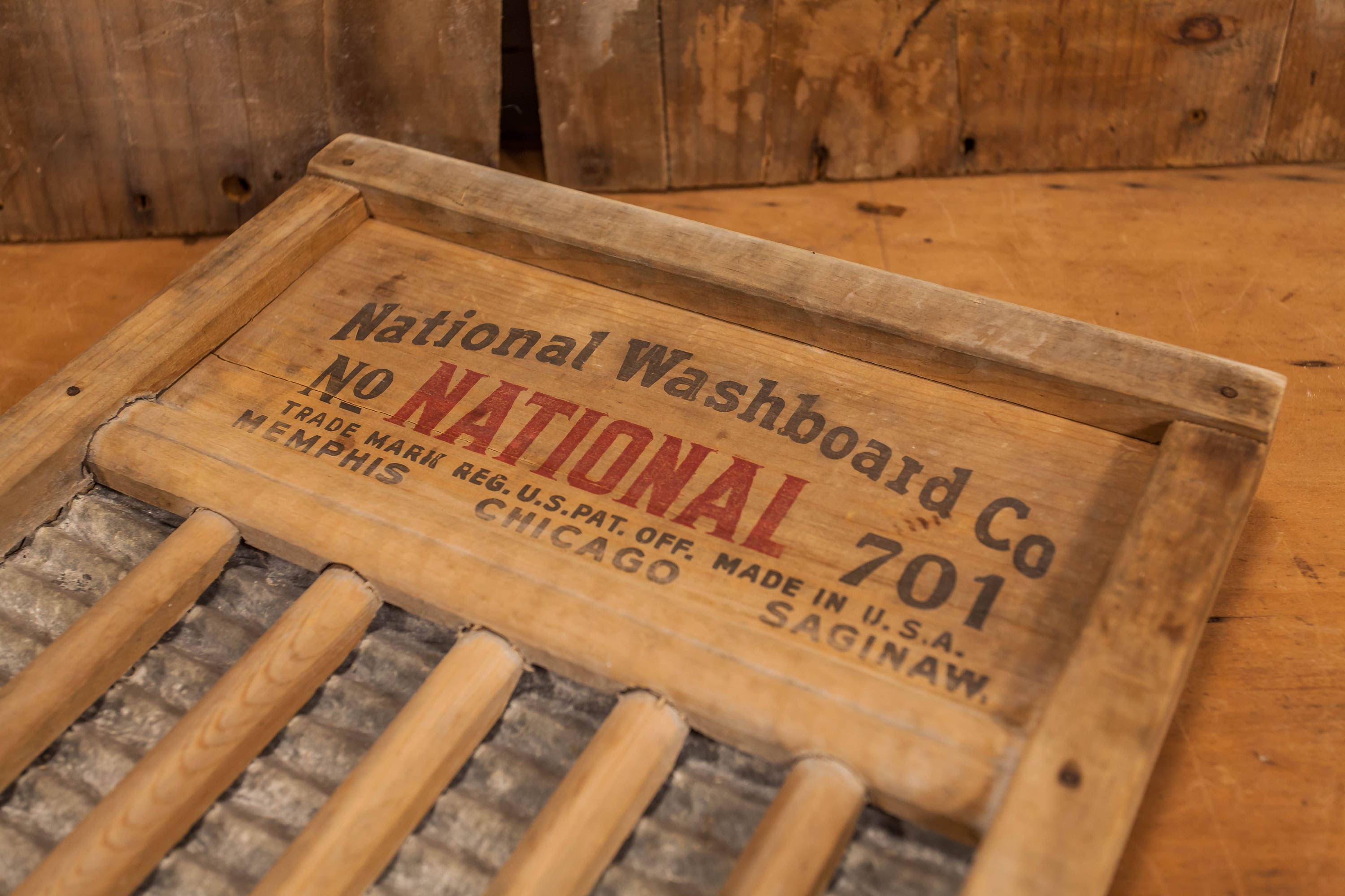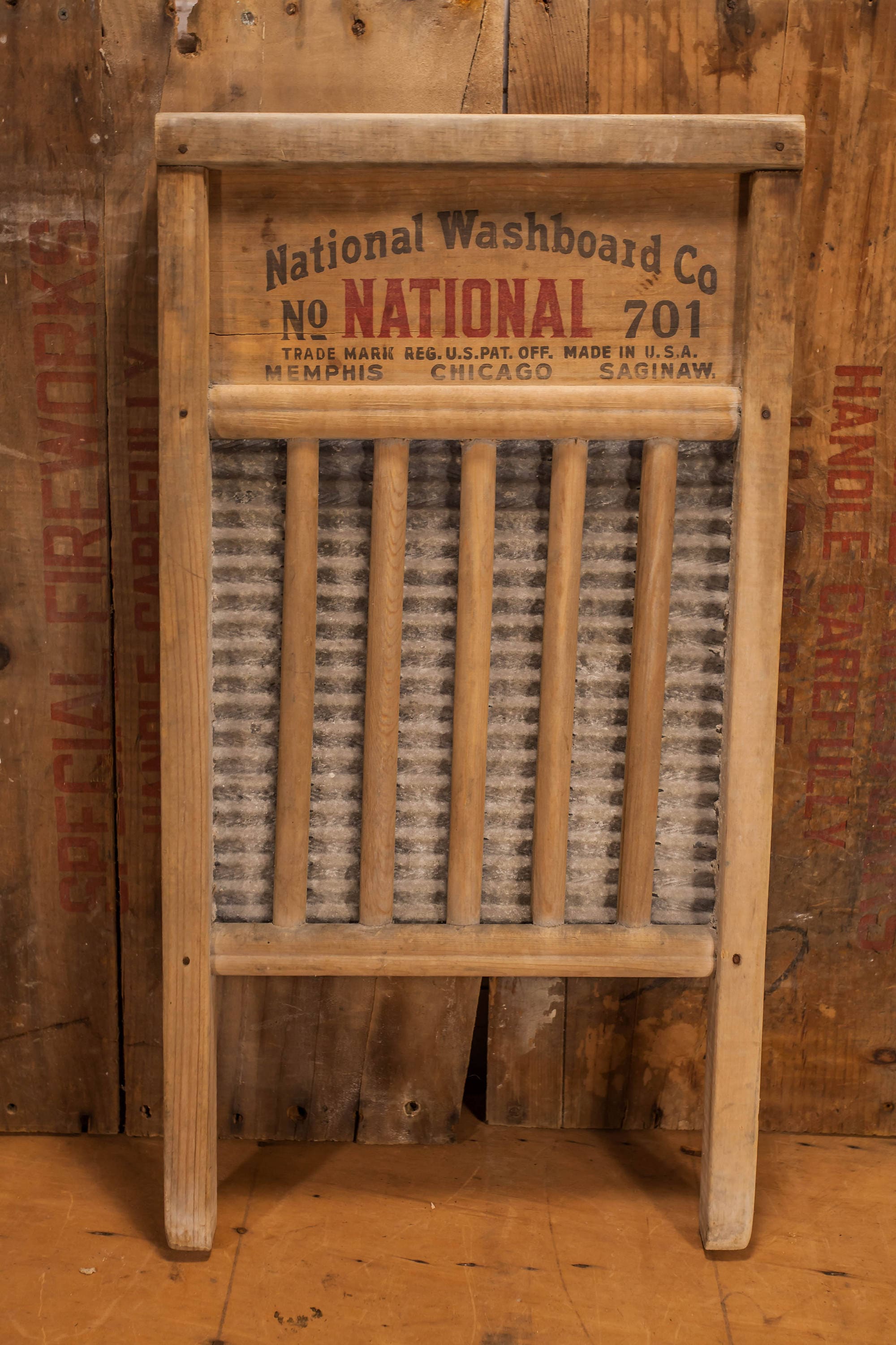 This is a vintage washboard from the 1920s. It is a National Washboard Co. No. 701 “The Zing King” washboard. As you can see the lettering is in Black and the word National is in red. It looks to have been used so it does have some wear. It does wobble a little and there a crack on the top plate where the graphic is. The galvanized metal does some wear and residue. It is approx. 24 x 13 x 1 1/2 inches. All in all a great looking piece to display. Please check out the photos for a closer look and if you have any questions please let me know. Thanks!