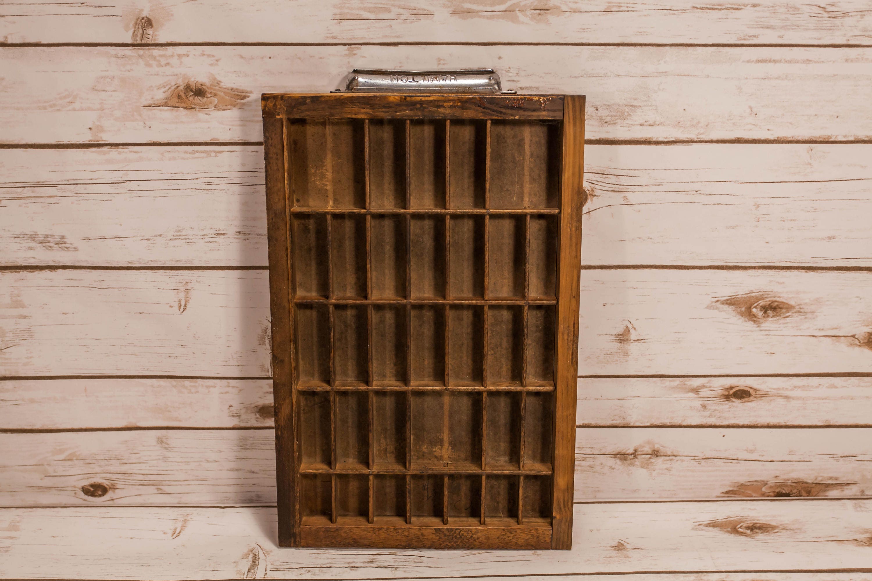 Take a look at this small Hamilton Printer Drawer. We picked up 5 other small drawers like this from an estate sale so make sure you take a look at all the others as well. This drawer features a silver hamilton handle and on the back there is a hanger attached to hang on your wall and display your miniature collectables. This tray is approx. 17 1/2 x 11 x 1 1/2 inches. It does have wear and there are some scratches but all in all an awesome display piece. Please check out the photos for a closer look and if you have any questions please let me know. Thanks!