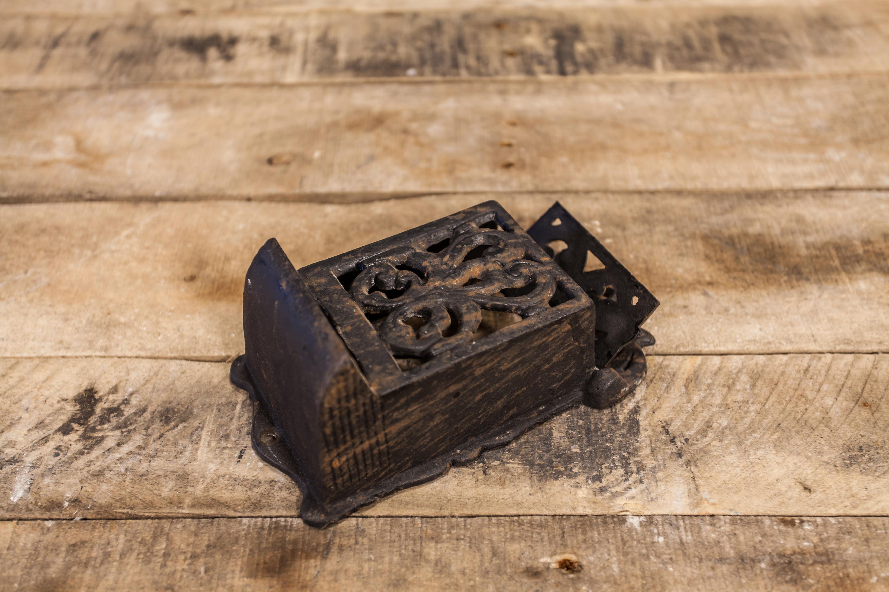 This is a cast iron match holder. It does have some wear as you can see and there is rust on it as well. It is approx. 7 1/4 x 4 1/4 x 3 inches. This is a two piece holder. The lid slides out until you put it up on the wall then it stays in place. All in all a great piece to display in the kitchen. Please check out the photos for a closer look and if you have any questions please let me know. Thanks!