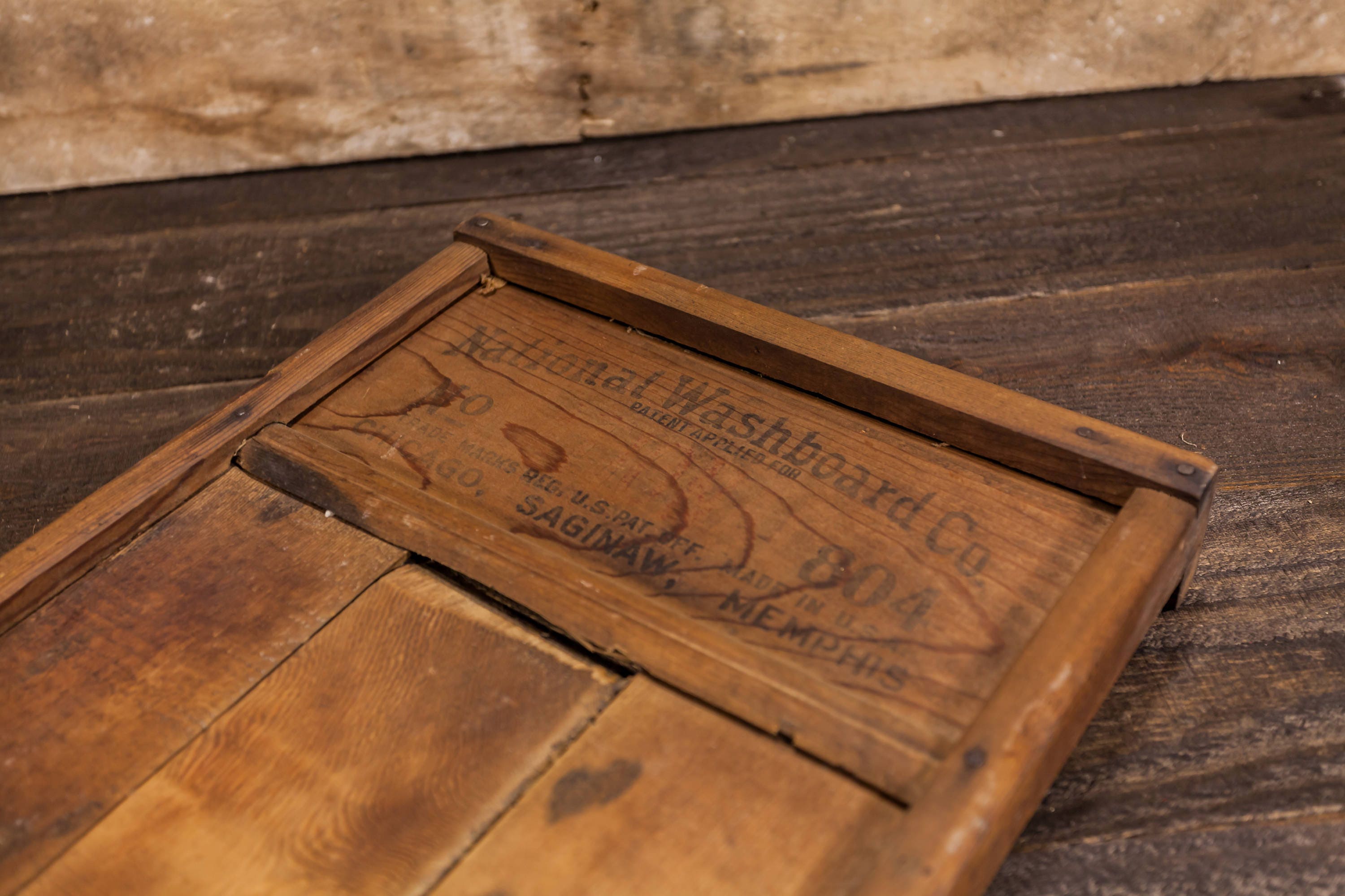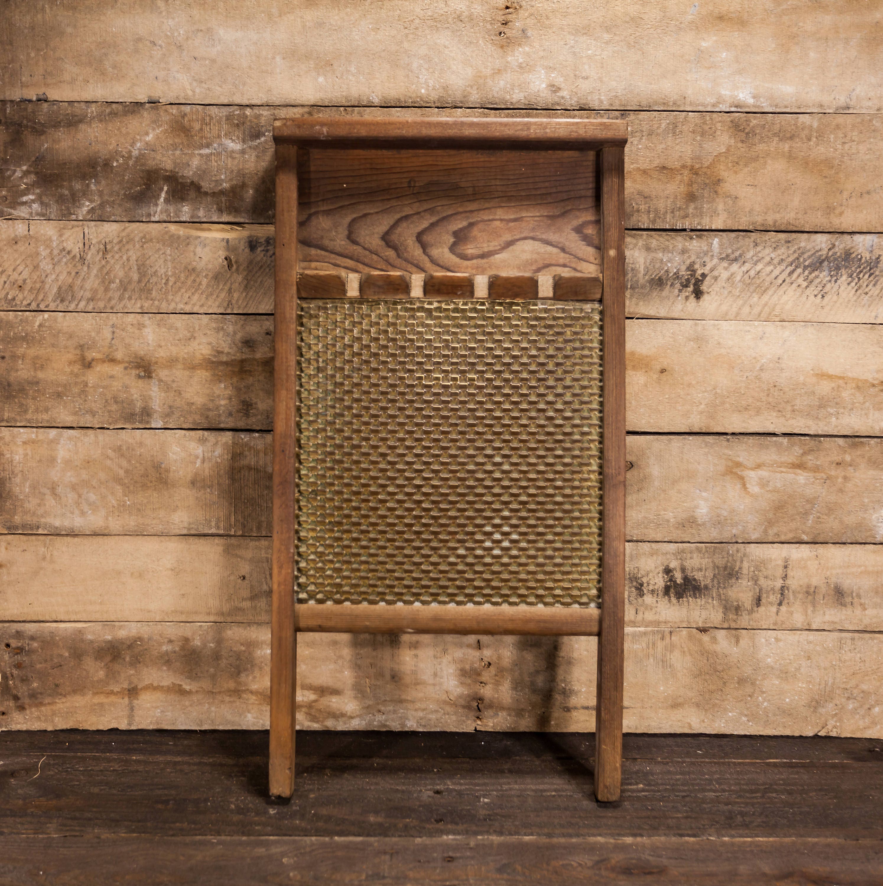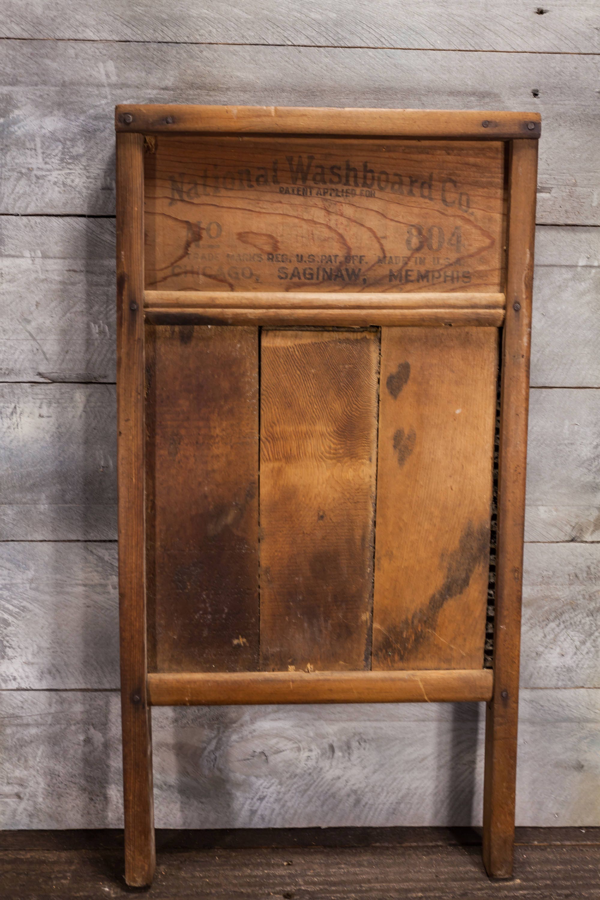 This is a National Washboard Co. No. 804. It has such an awesome look. The graphic is slightly faded on the front side and the back side its completely faded. It looks to have a brass backing which looks great. It is approx. 24 x 12 1/2 x 2 1/4 inches and does have some wear. All in all a great looking piece to display in your laundry room or mudroom. Please check out the photos for a closer look and if you have any questions please let me know. Thanks!