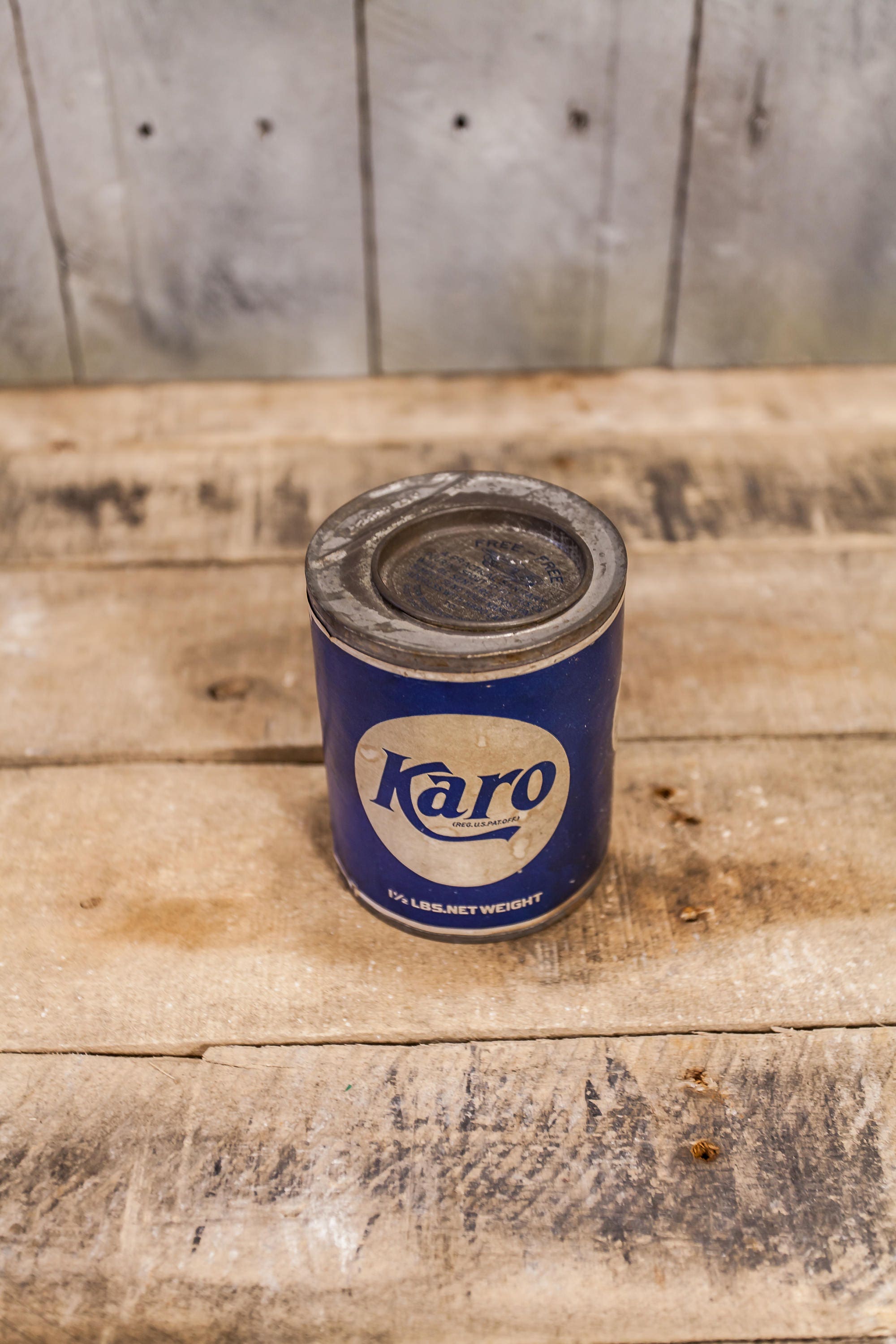 Have a look at this cool vintage tin. It has such a great graphic and the colors still pop! This is Karo tin can and still has its paper label. The tin is approx. 4 x 3 1/4 inches and it does have some wear. There are some scratches, rust, dark spots but it would still make a great collector piece. Please check out the photos for a closer look and if you have any questions please let me know. Thanks!