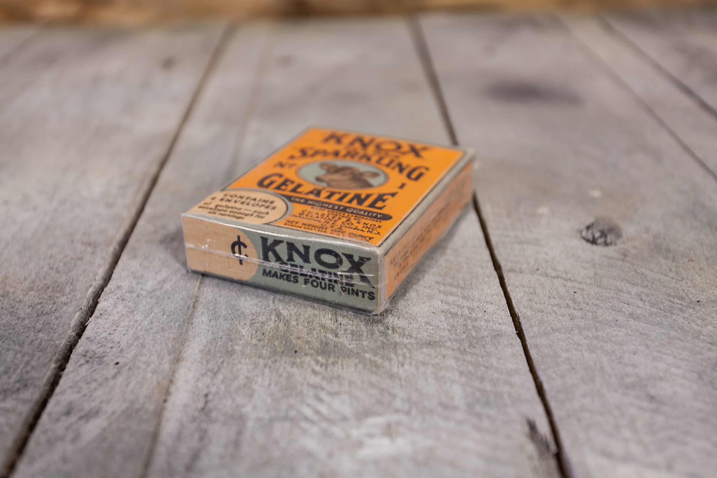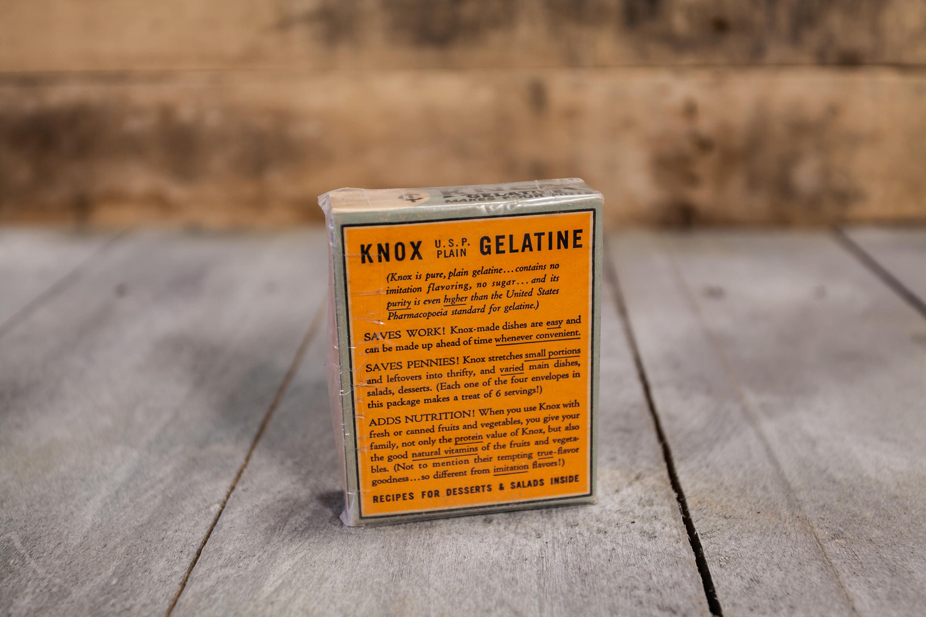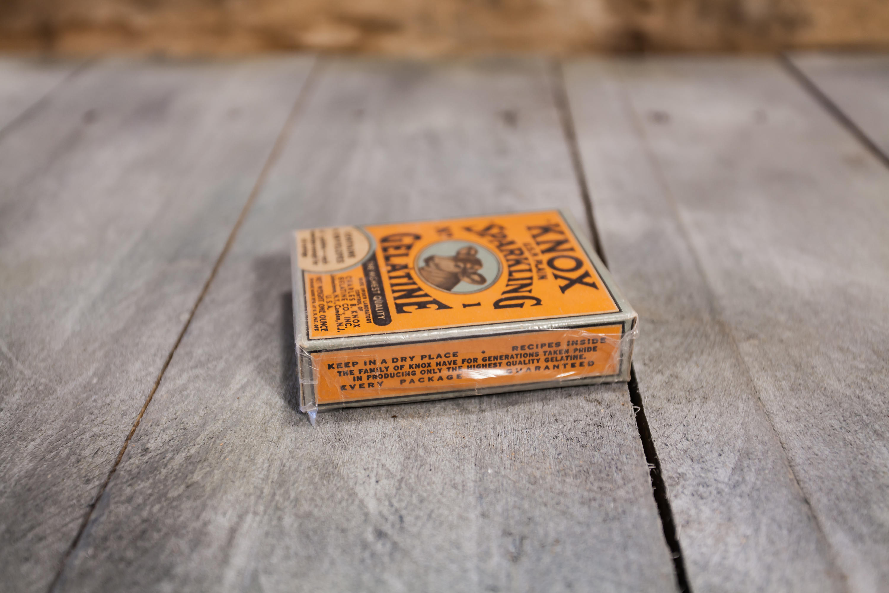 We love finding old advertising pieces. They make awesome display pieces and are great to collect. When we saw this one we had to have it. It has such a great vintage design. This box is from the 1930s and it is an unopened box of Knox Sparkling Gelatine. The box is in very nice shape considering its age and there is a protective sleeve around it. It has a small piece of tape on it so this might have been added by the previous owner. The sleeve has for sure protected the box because it looks great. The box doesn't appear to have any damage to it just some slight wear to the corners but all in all a great piece. It is approx. 3 1/2 x 3 x 3/4 inches. Please check out the photos for a closer look and if you have any questions please let me know. Thanks!
