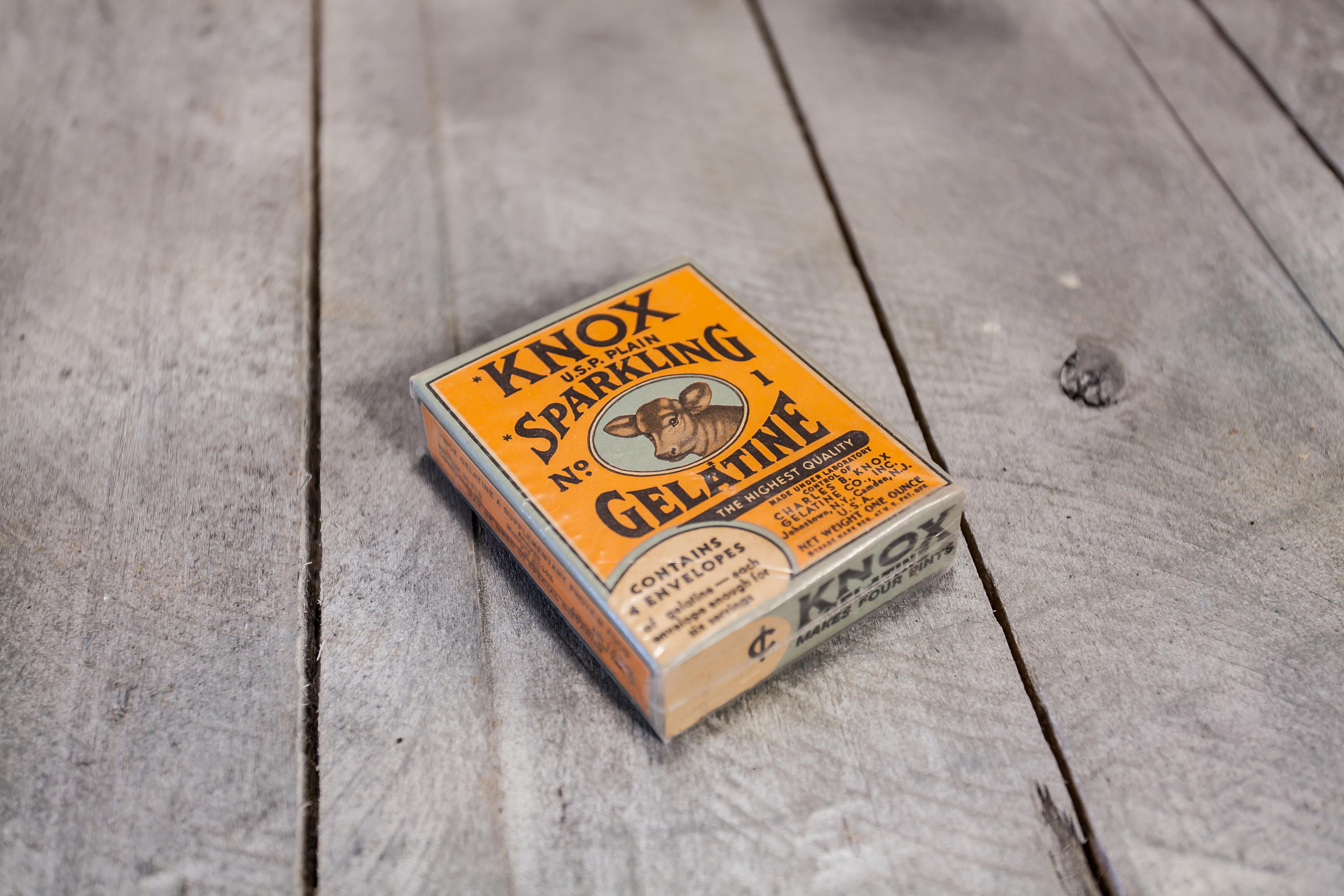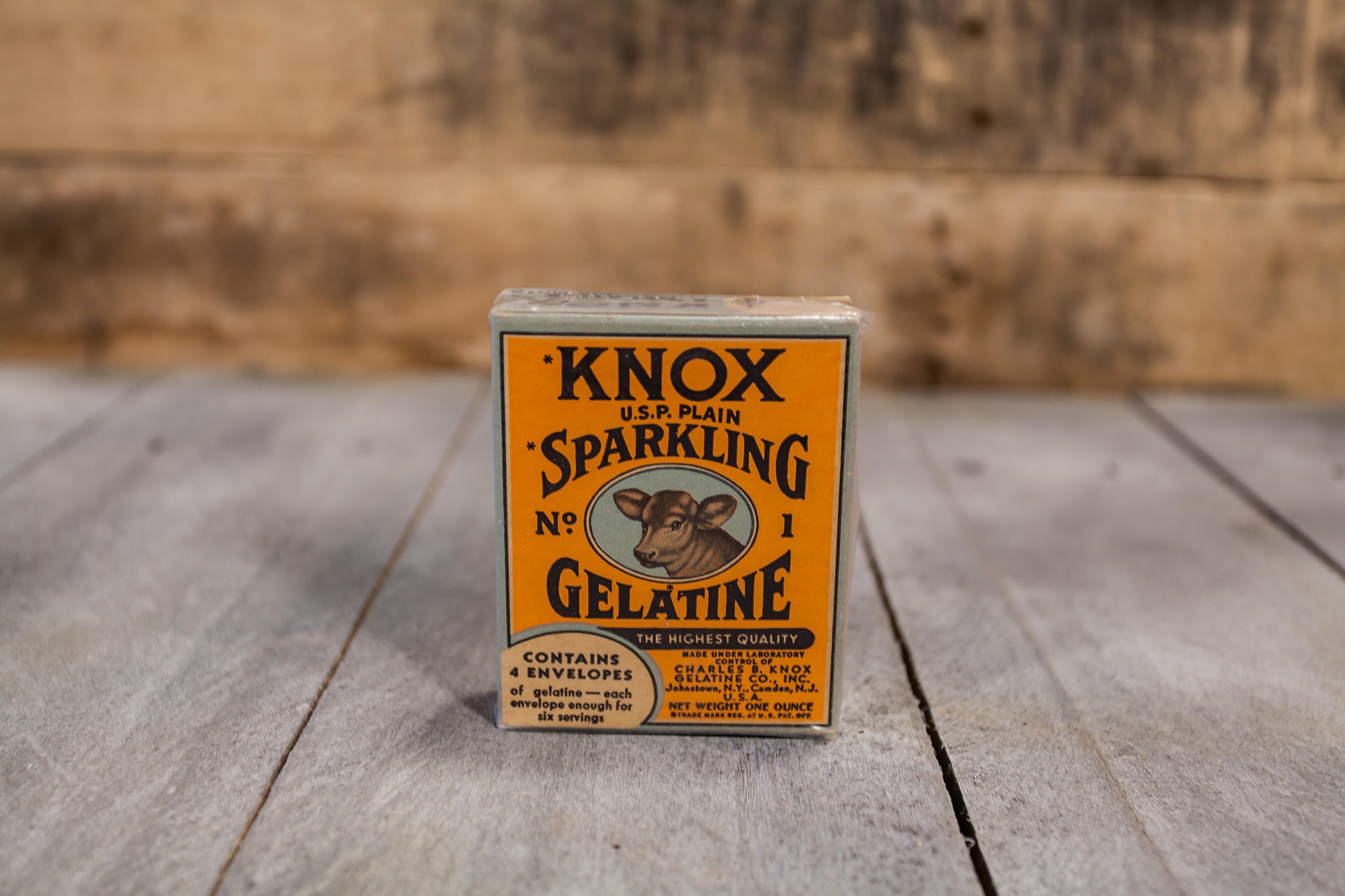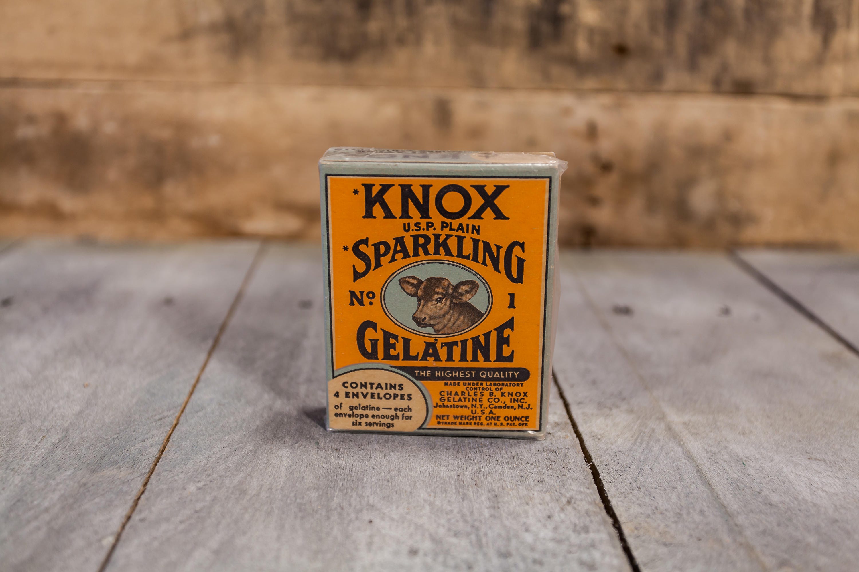 We love finding old advertising pieces. They make awesome display pieces and are great to collect. When we saw this one we had to have it. It has such a great vintage design. This box is from the 1930s and it is an unopened box of Knox Sparkling Gelatine. The box is in very nice shape considering its age and there is a protective sleeve around it. It has a small piece of tape on it so this might have been added by the previous owner. The sleeve has for sure protected the box because it looks great. The box doesn't appear to have any damage to it just some slight wear to the corners but all in all a great piece. It is approx. 3 1/2 x 3 x 3/4 inches. Please check out the photos for a closer look and if you have any questions please let me know. Thanks!