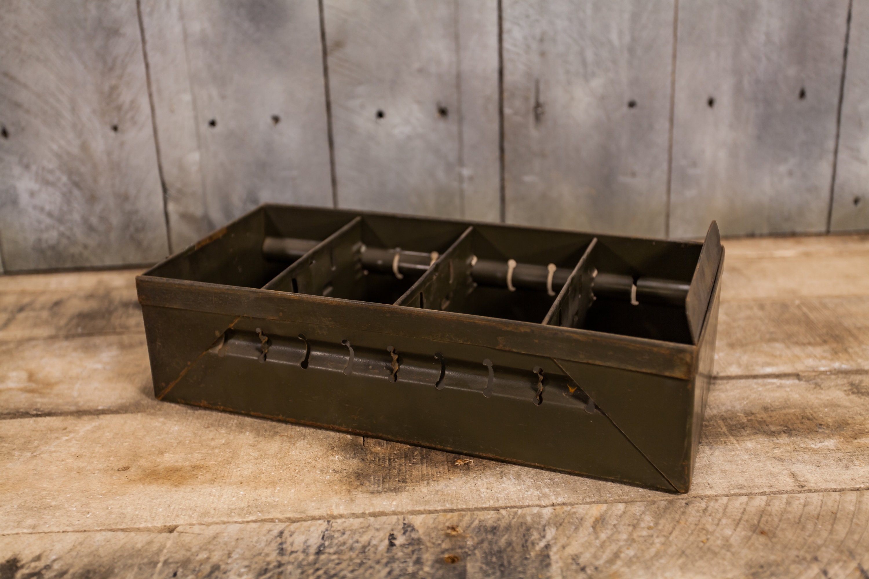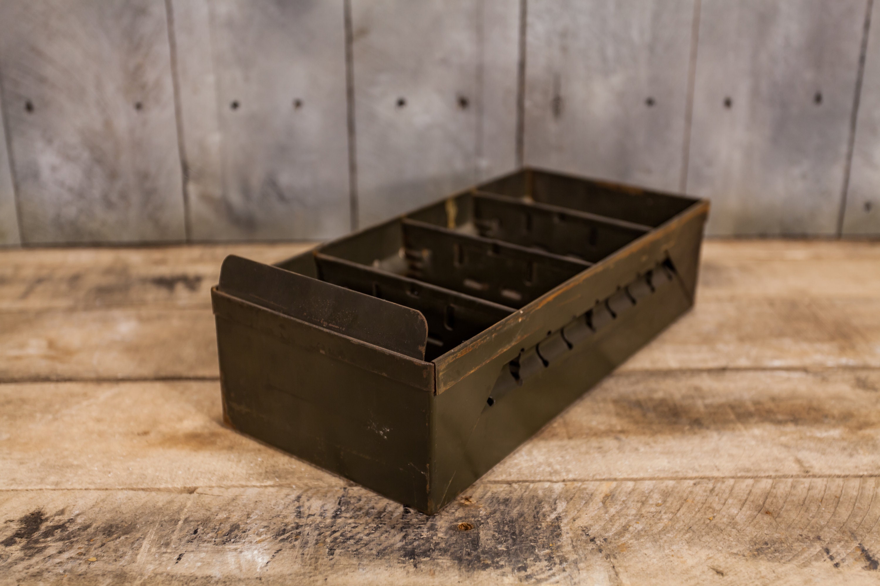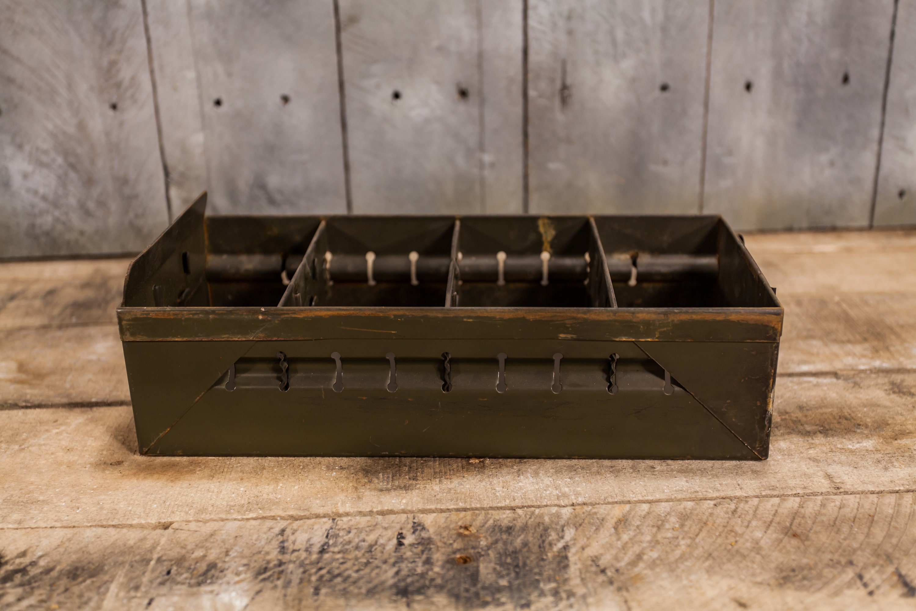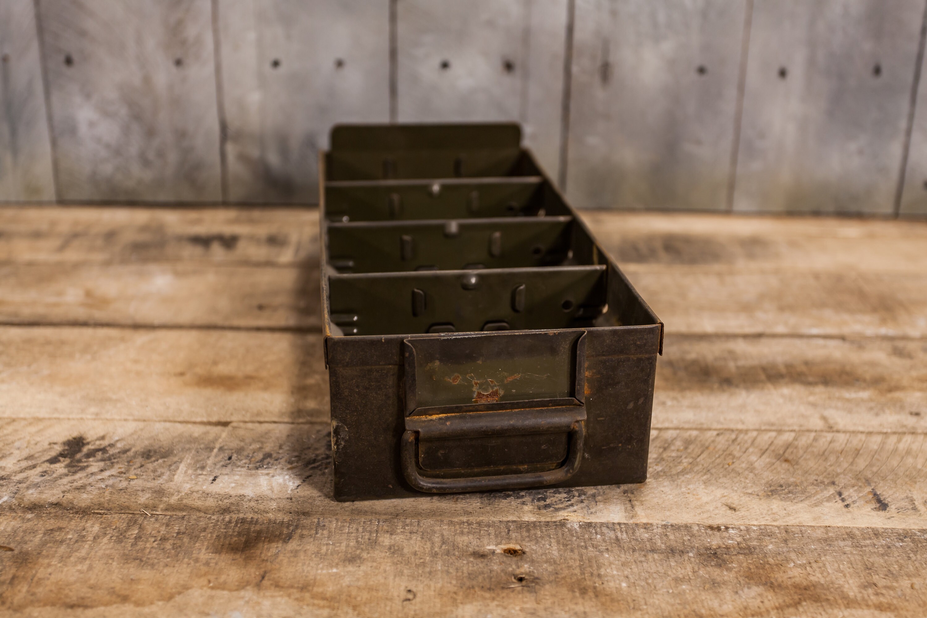Check out this rustic metal drawer. These make great planters and also great recipe holders in your kitchen. We recently picked up over 20 of these. They are approx. 12 x 5 1/2 x 3 3/4 inches. They all have some wear, dents, rust, scratches, sharpie marks and they could use a good cleaning. As always when we have multiples of the same items first buyer will get the best quality one and so on. The number of dividers vary in each drawer but you will receive at least 3 dividers. Please check out the photos for a closer look and if you have any questions please let me know. Thanks!