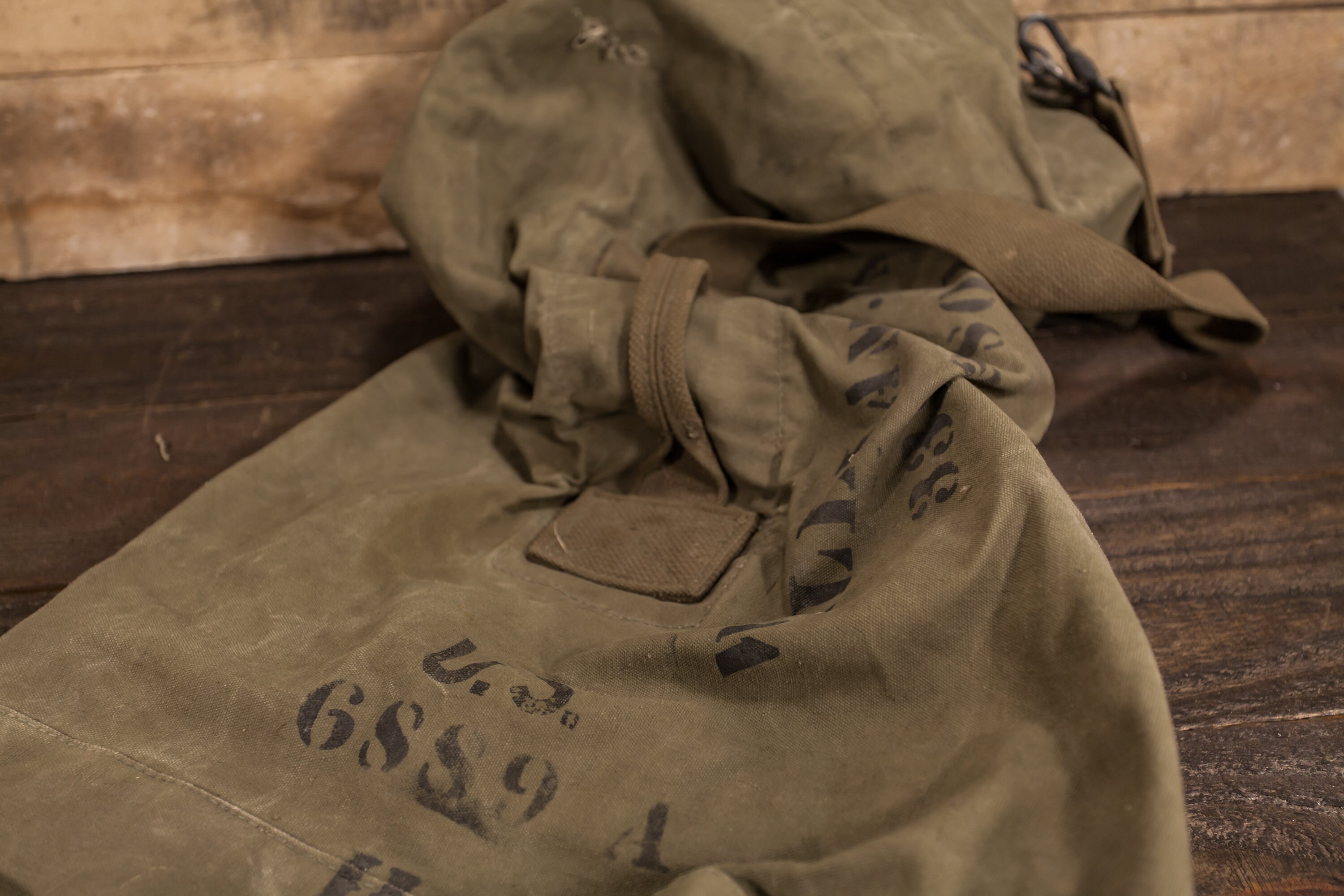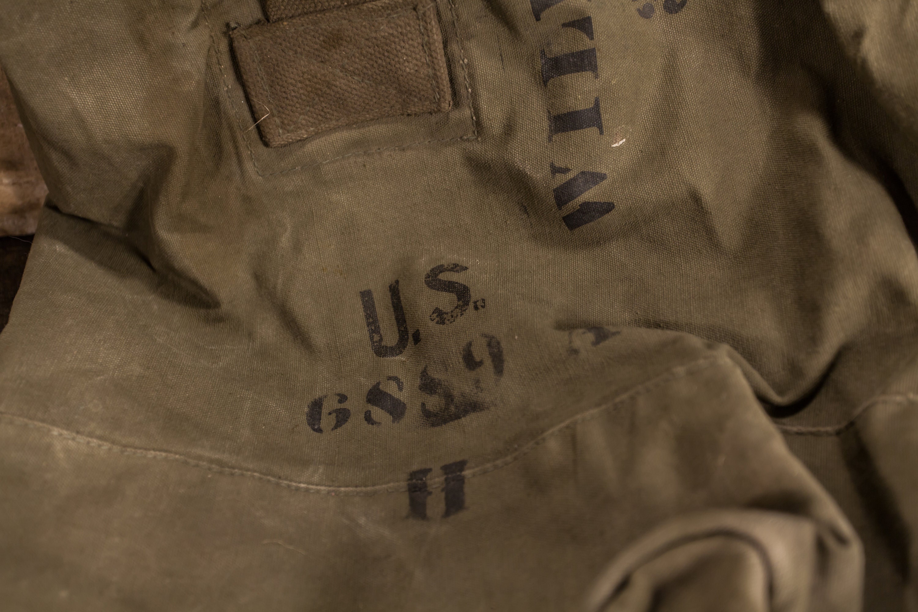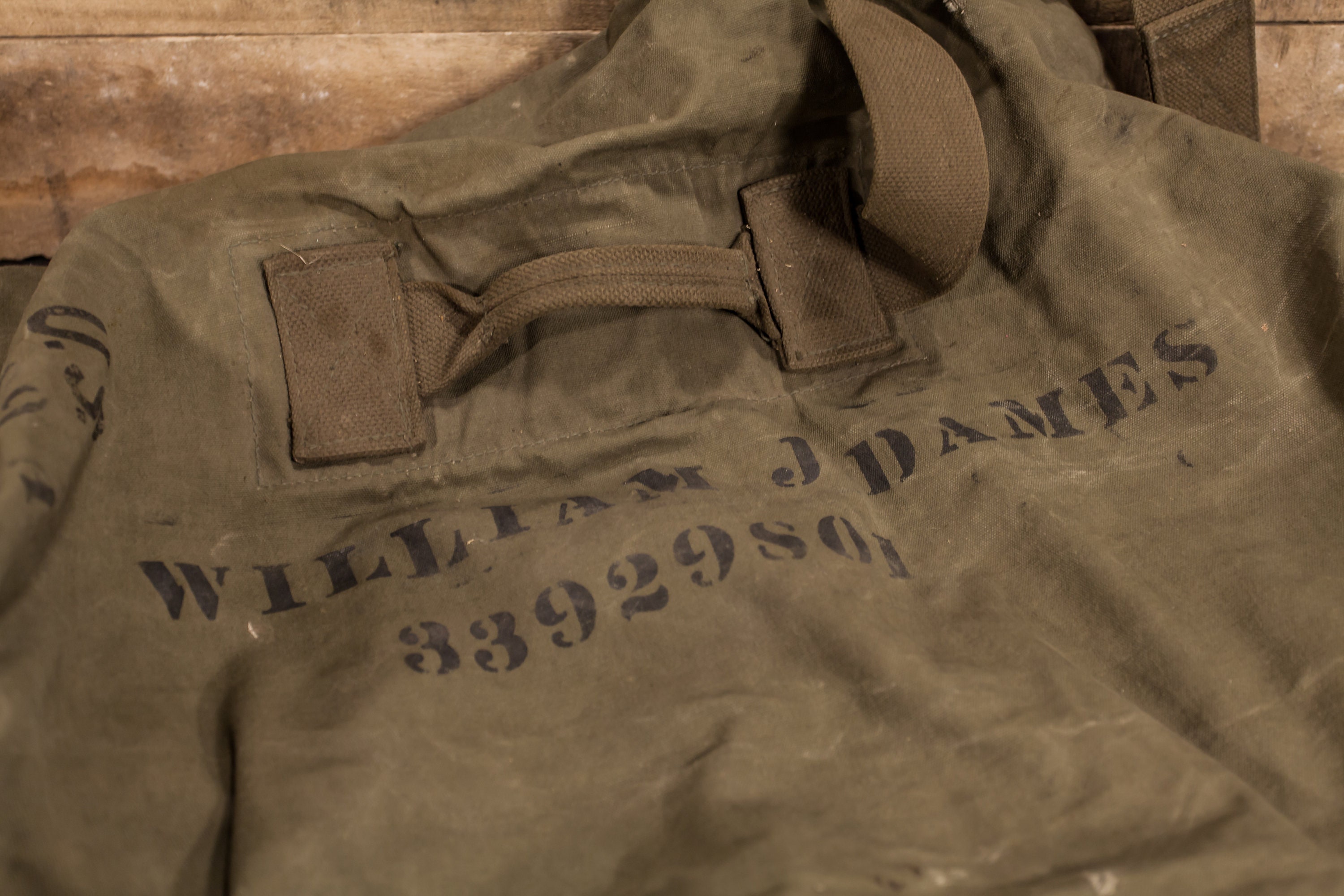 What a beautiful US Military duffle bag. It is army green and has faded black writing. It says "William J. Dames". It does have some wear and could use a good cleaning. There are some holes, stains and there is a small lock attached to it. There is a strap and handle on the bag so you can carry it easily. It is approx. 37 x 21 inches (it was measured laying flat). It has an awesome look to it and would make a nice display piece in a man cave or a great piece to turn into a pillow. We picked up two different duffle bags so check out the other option as well. Please check out the photos for a closer look and if you have any questions please let me know. Thanks!