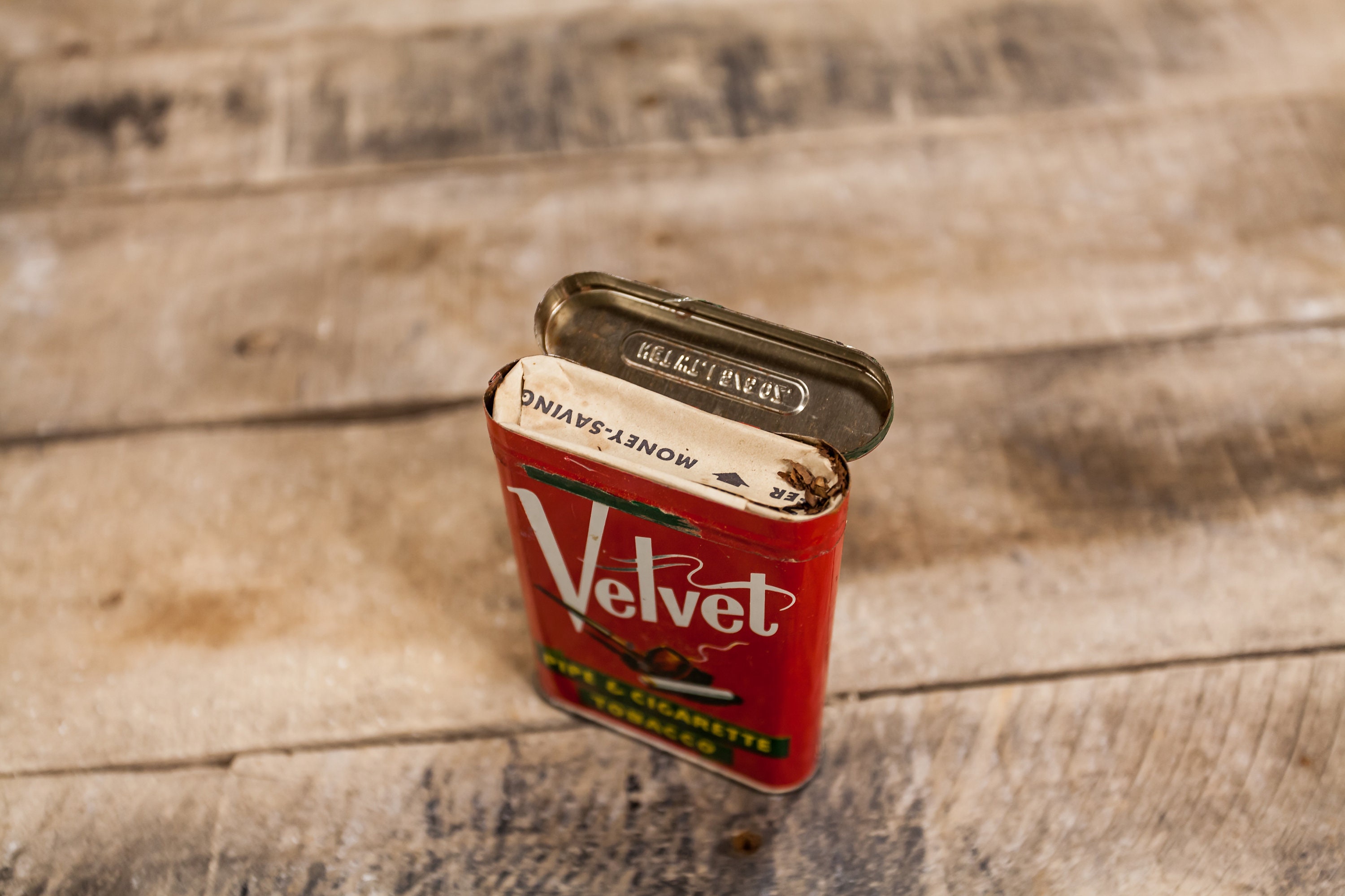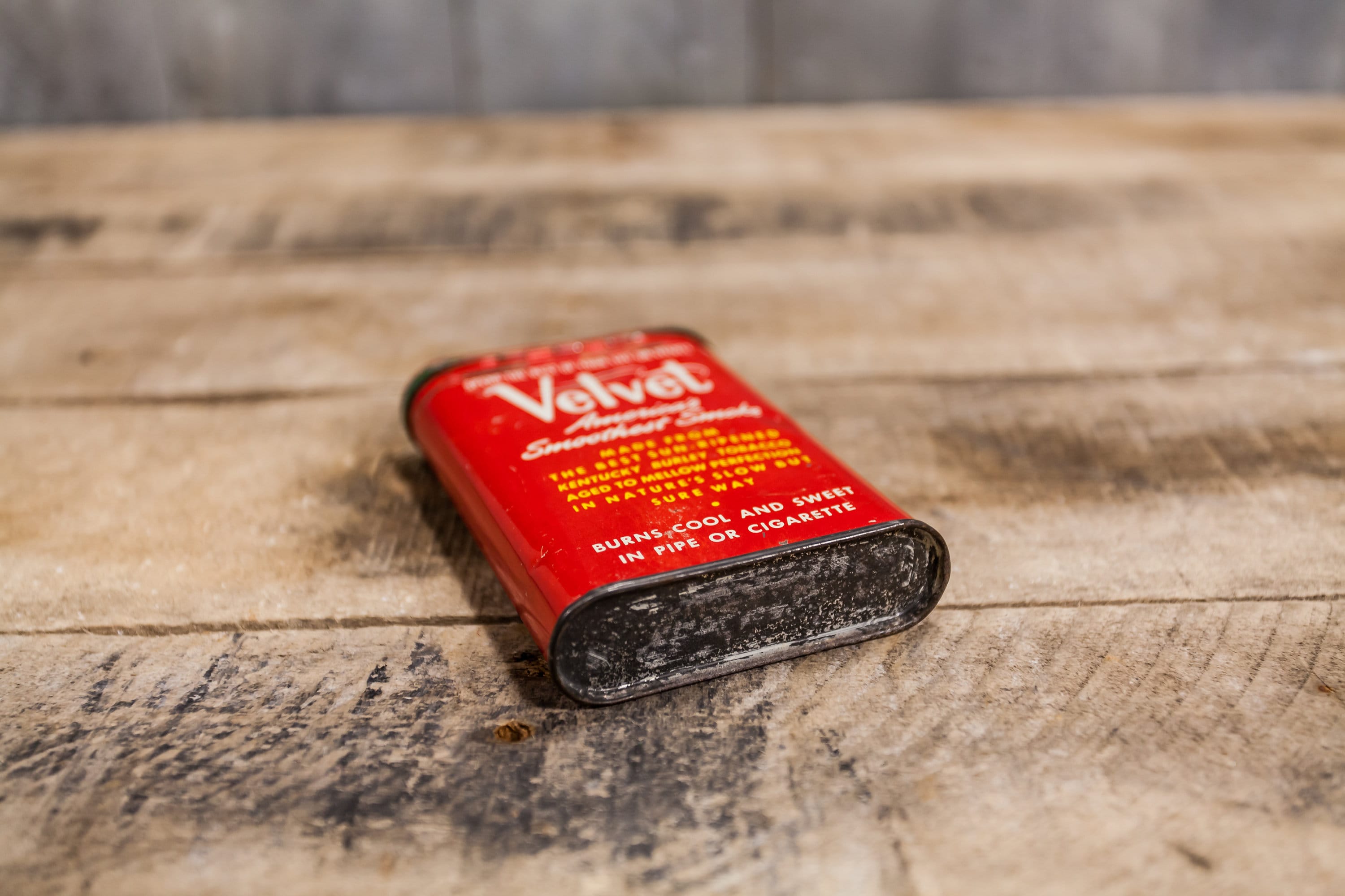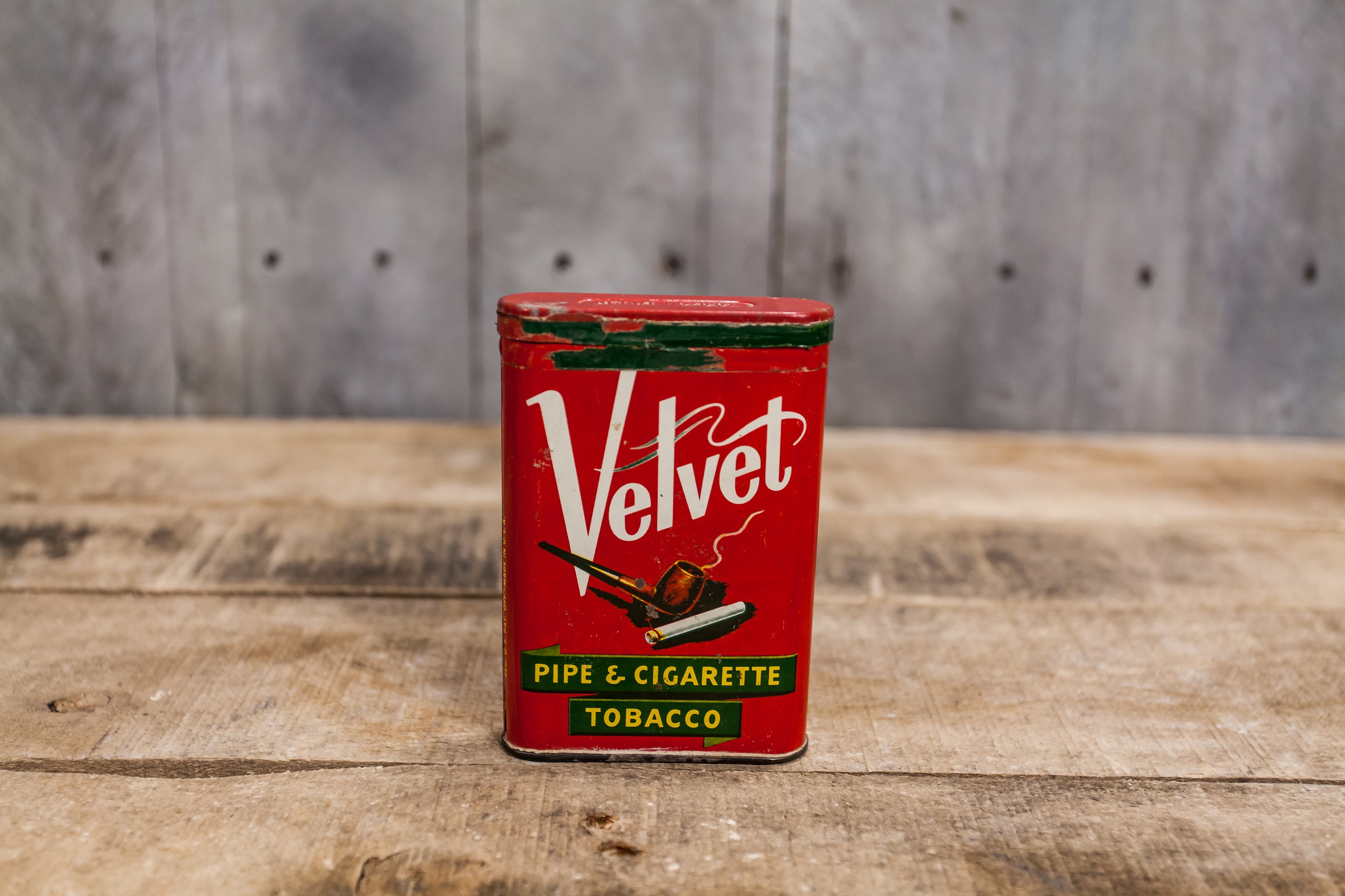 We love finding tobacco tins not only because they have great graphics but also because they make great display pieces. This is a Velvet tobacco tin that looks to have never been open. There is some green tape which is original that sealed the can but its been torn off. It is approx. 4 1/2 x 3 x 1inches. They is some wear, scratches, rust but please check out the photos for a better look. Please check out the photos for a closer look and if you have any questions please let me know. Thanks!