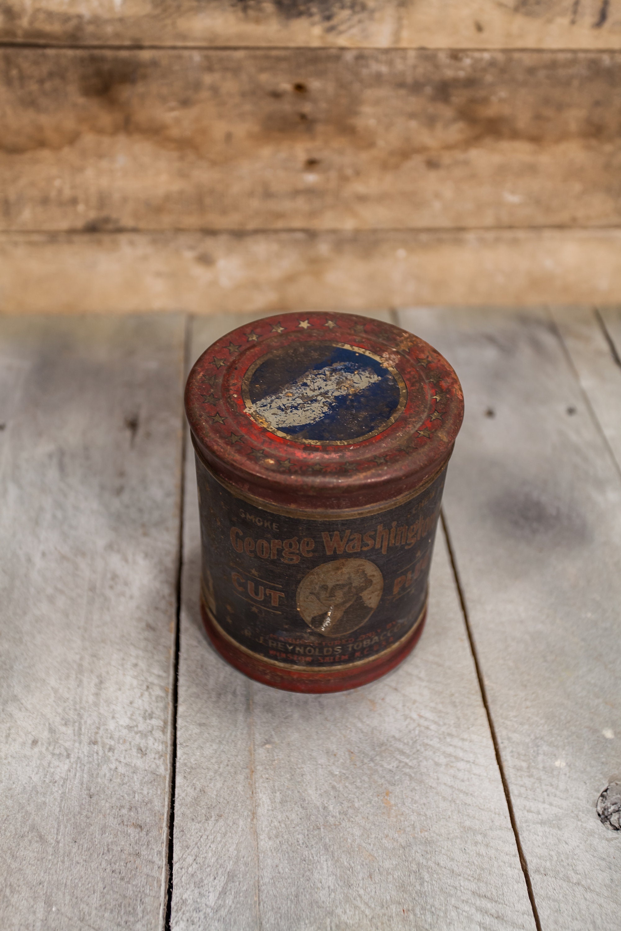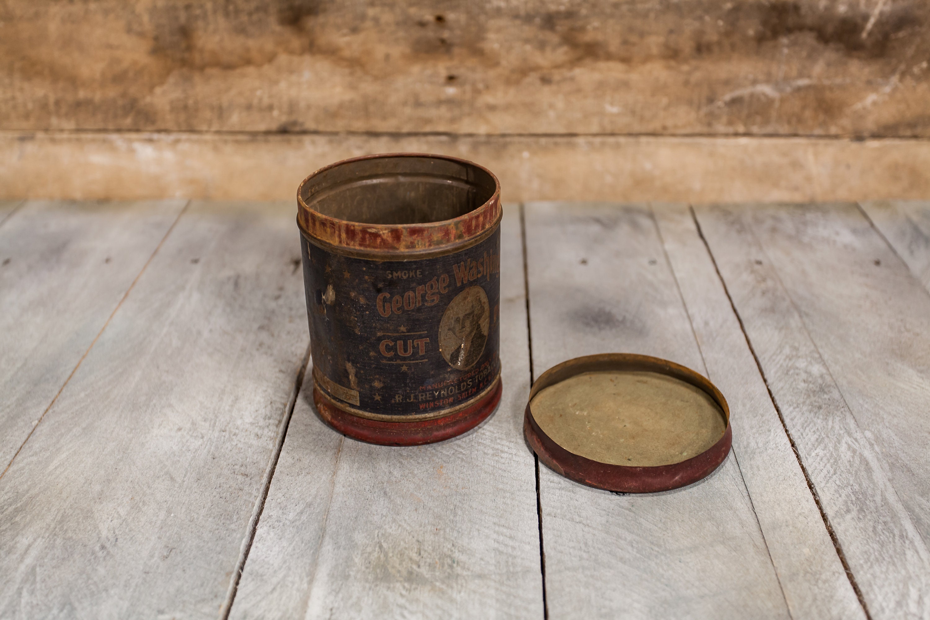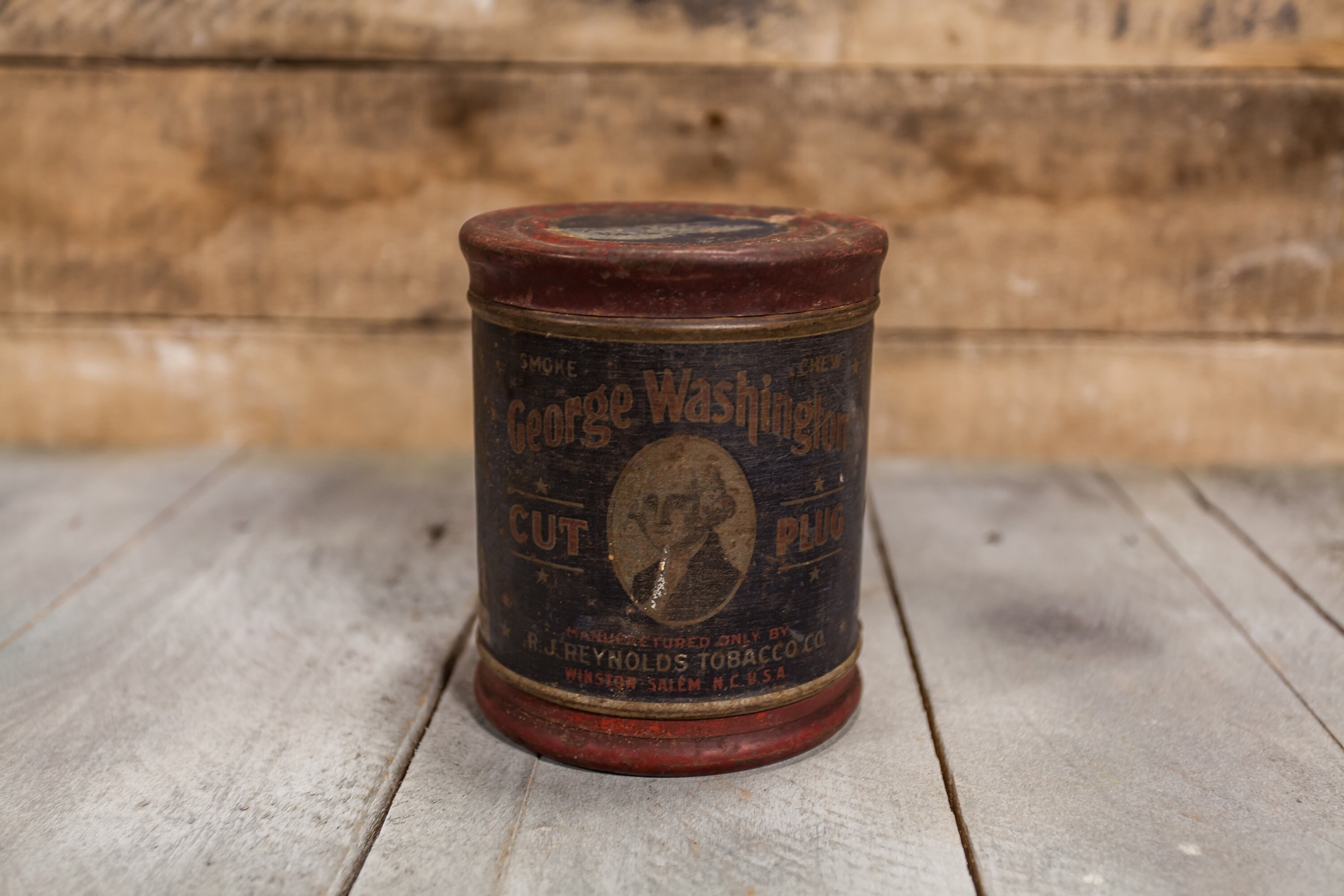 Take a look at this cool Tobacco Tin! This is a George Washington Cut Plug Tobacco Tin made by the RJ Reynolds Tobacco Co. in Winston-Salem, NC. There is some wear, dents, scratches, rust and there some paint on the back side. It is approx. 5 x 4 1/4 inches. These make great display pieces and even make great planters. Please check out the photos for a closer look and if you have any questions please let me know. Thanks!