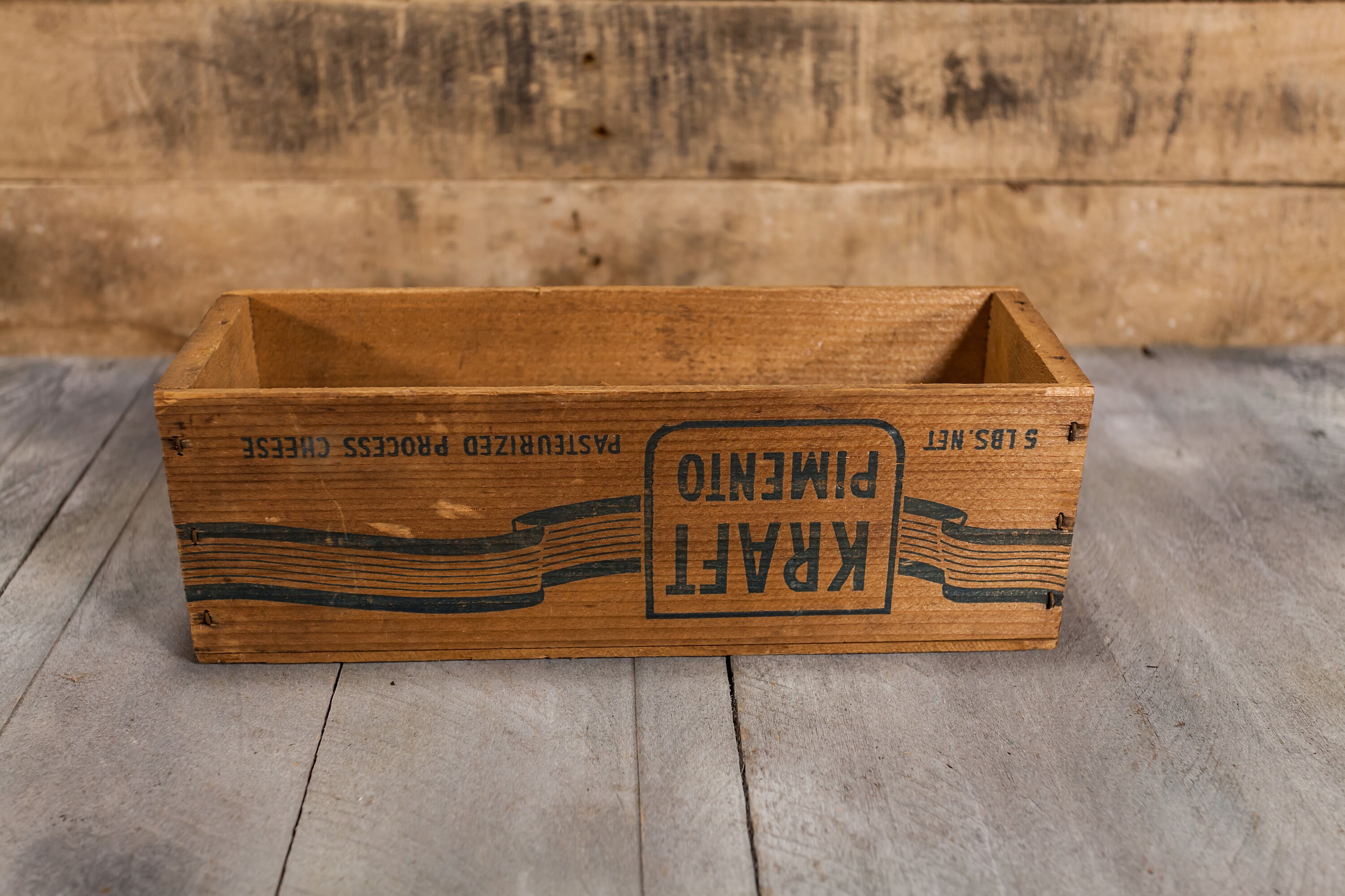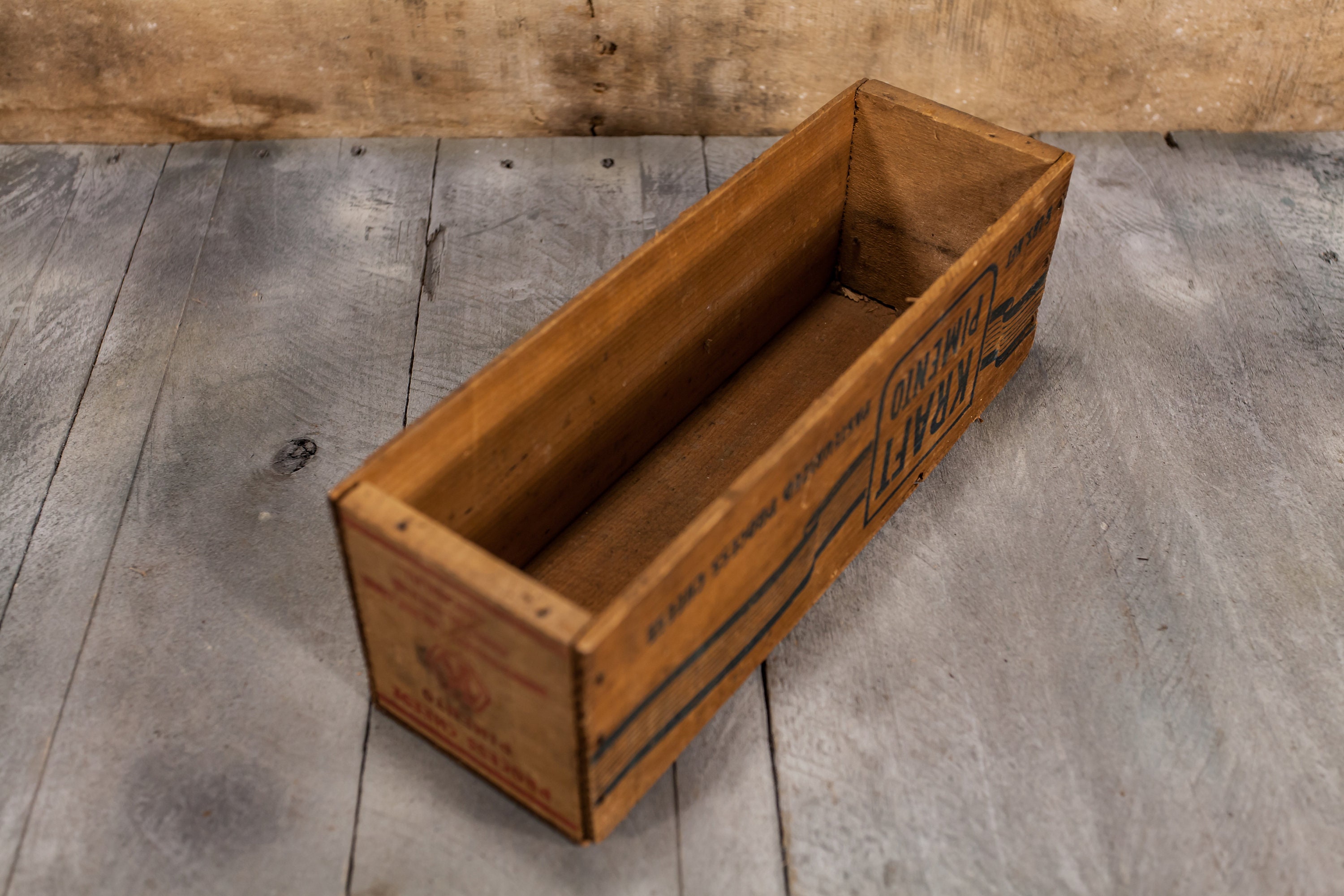 This is a great looking advertising wooden crate. It is from the 1930s and is for Kraft American Pasteurized Process Cheese. The box is from the Kraft Cheese Company out of Chicago, IL. It features a nice graphic on it. It is approx. 11 3/4 x 4 x 4 inches. It does have some wear, chips and also some sharpie on the bottom to it as you can see from the photos. These make very nice display pieces. Please check out the photos for a closer look and if you have any questions please let me know. Thanks!