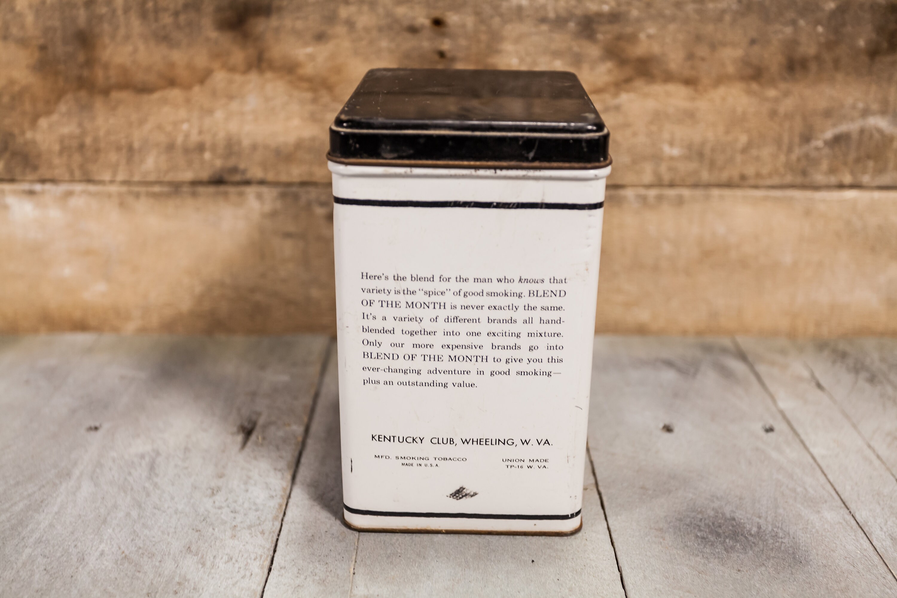 Take a look at this vintage tobacco tin. We love finding these tins they make such a cool display piece and are great to collect. This one is a Blend of the Month tobacco tin. It is made by the Kentucky Club in Wheeling, West Virginia. The tin does have some wear, scratches and some dents. It is approx. 6 1/2 x 5 x 4 inches. All in all a cool piece to add to your collection or to display. Please check out the photos for a closer look and if you have any questions please let me know. Thanks!