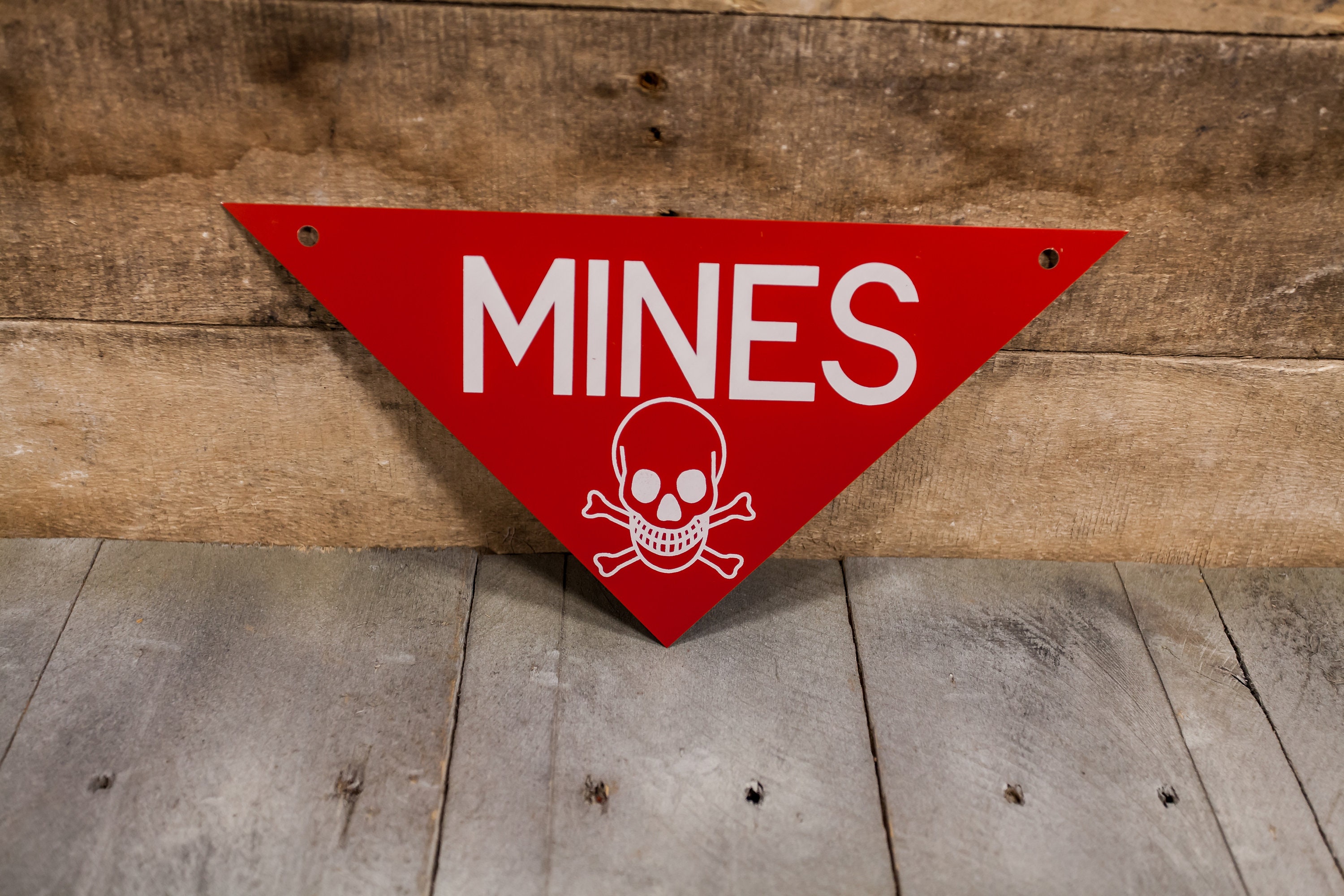Check out this great little sign to hang in the man cave! This is a Mines sign and it is 11 x 5 3/4 inches. We believe it is from the 60-70s and used for the US Military for land mines. It is a metal sign and has little to no wear on it. We believe it is new old stock. All in all a great piece to display. Please check out the photos for a closer look and if you have any questions please let me know. Thanks!