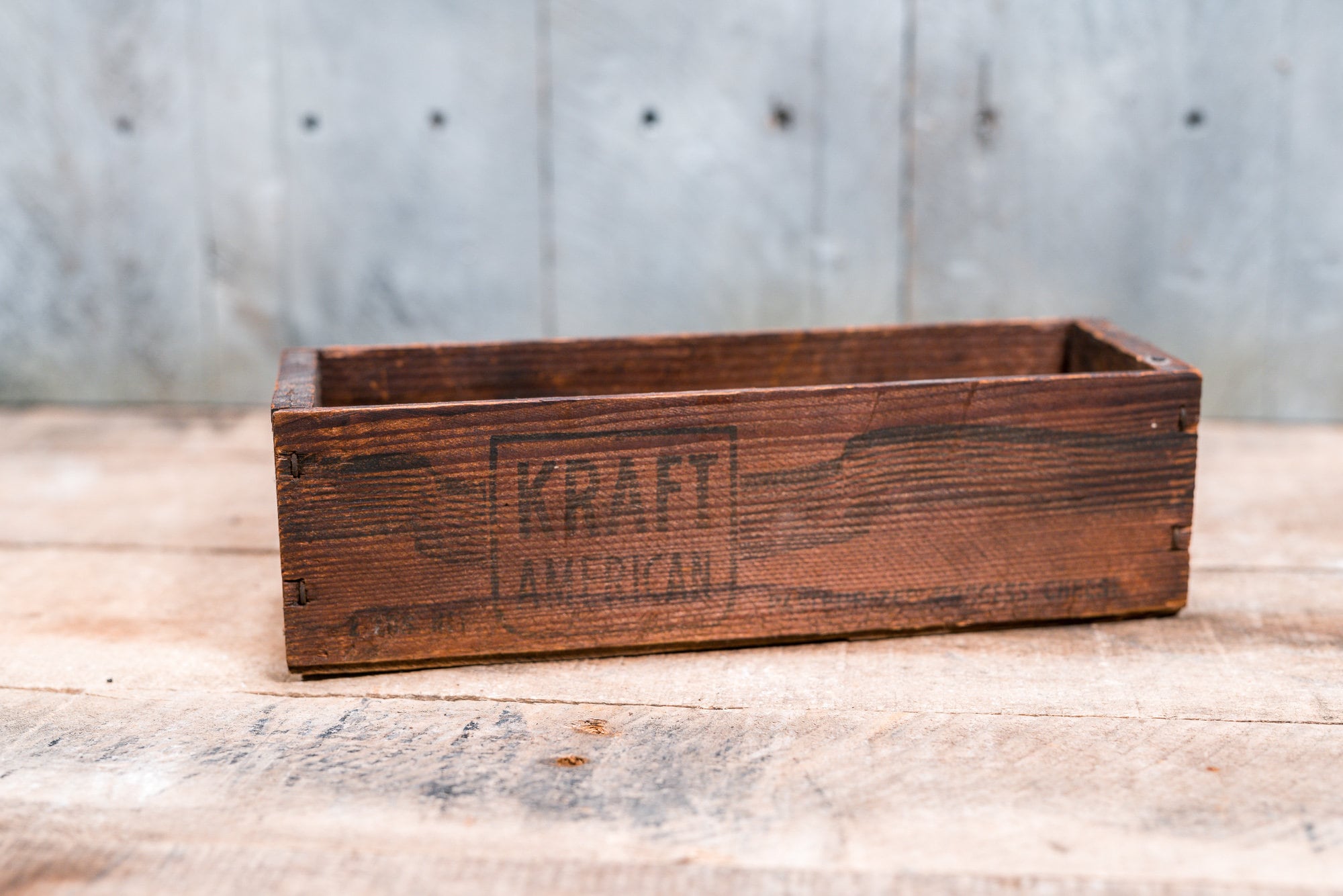 This is a great looking advertising wooden crate. It is from the 1930s and is for Kraft American Pasteurized Process Cheese. The box is from the Kraft Cheese Company. It features a nice graphic on it. It is approx. 9 1/4 x 3 x 2 3/4 inches. It does have some wear to it as you can see from the photos. The graphics do have some fading but this would still make a great display piece. Please check out the photos for a closer look and if you have any questions please let me know. Thanks!