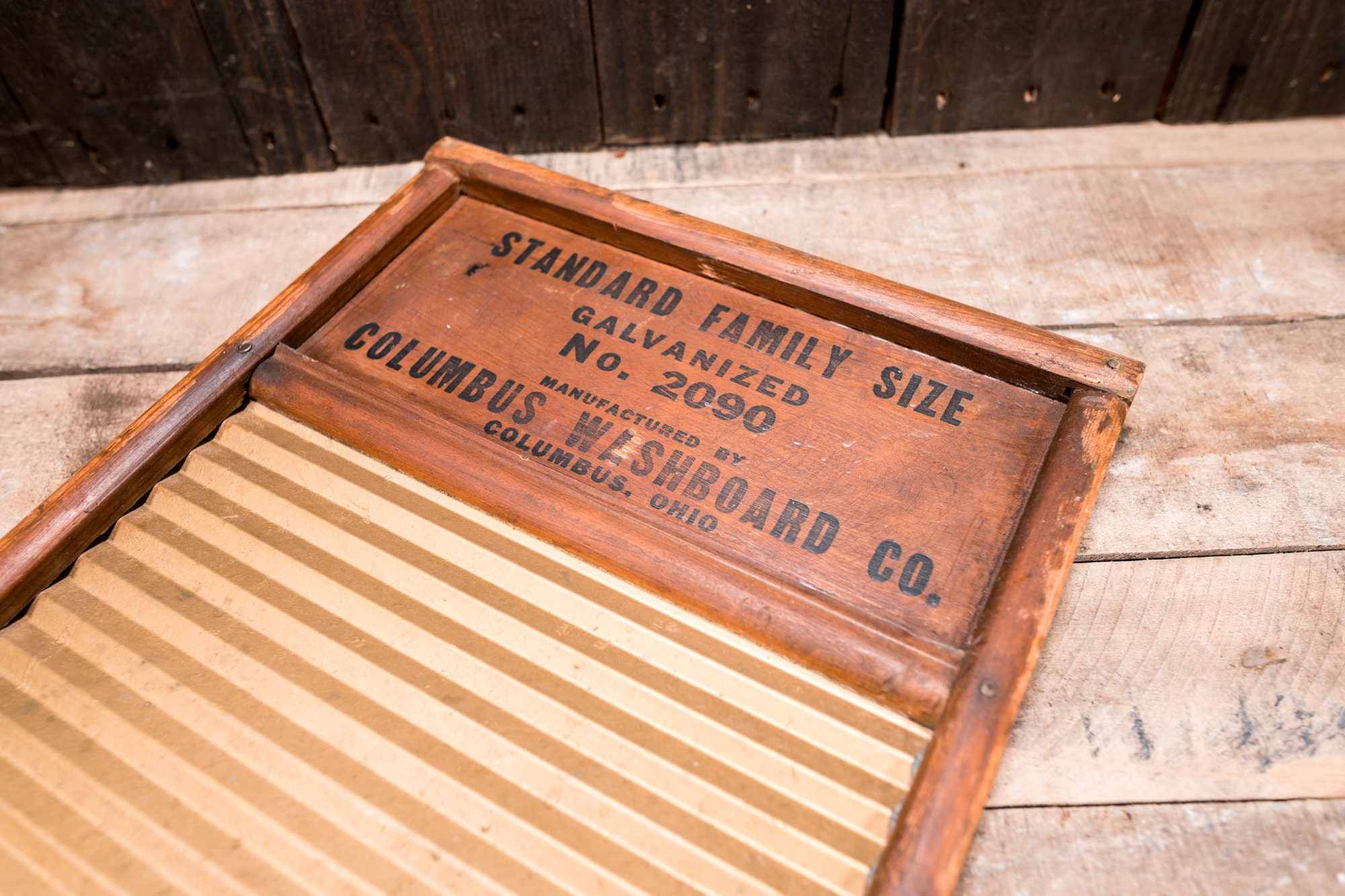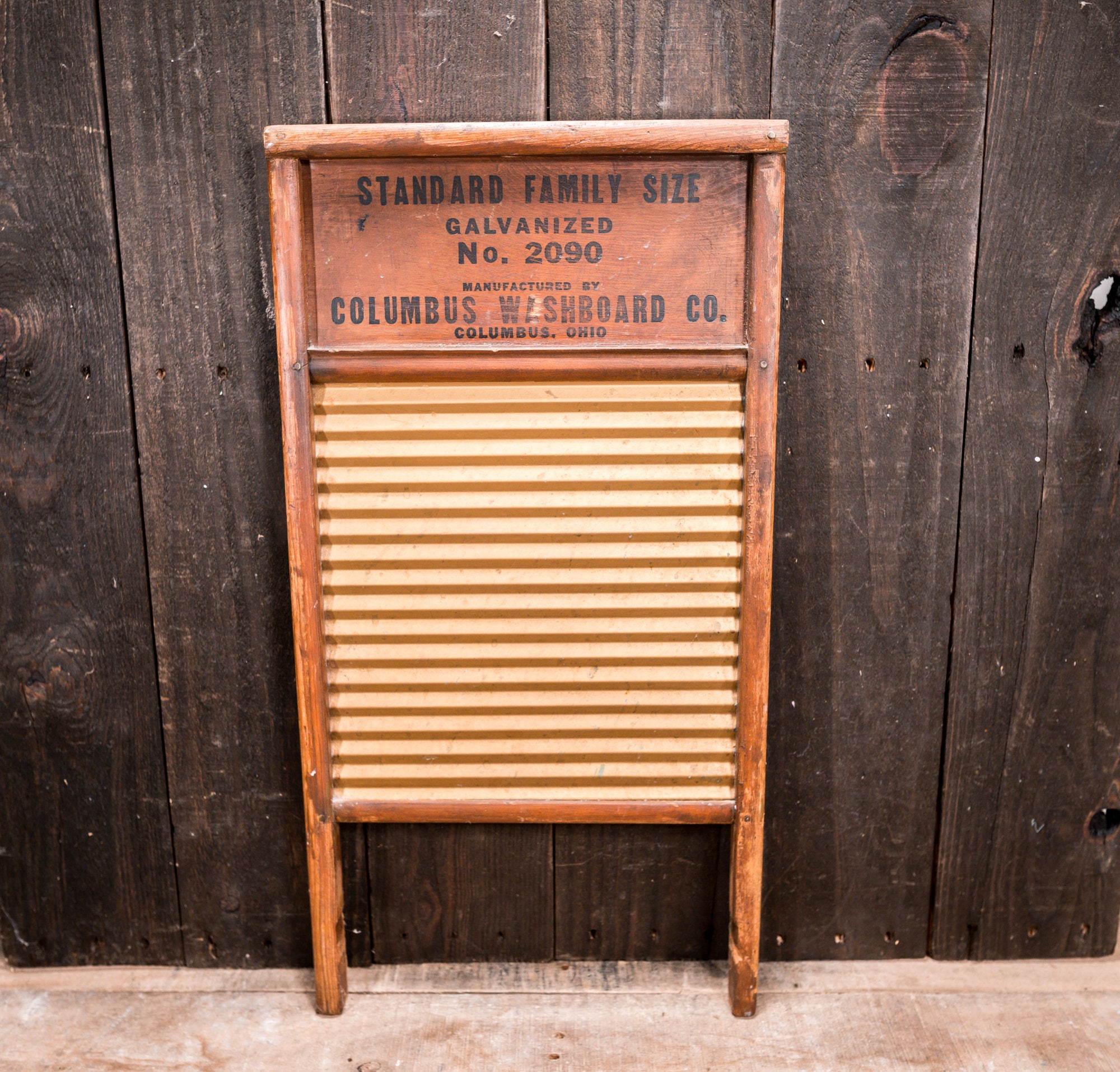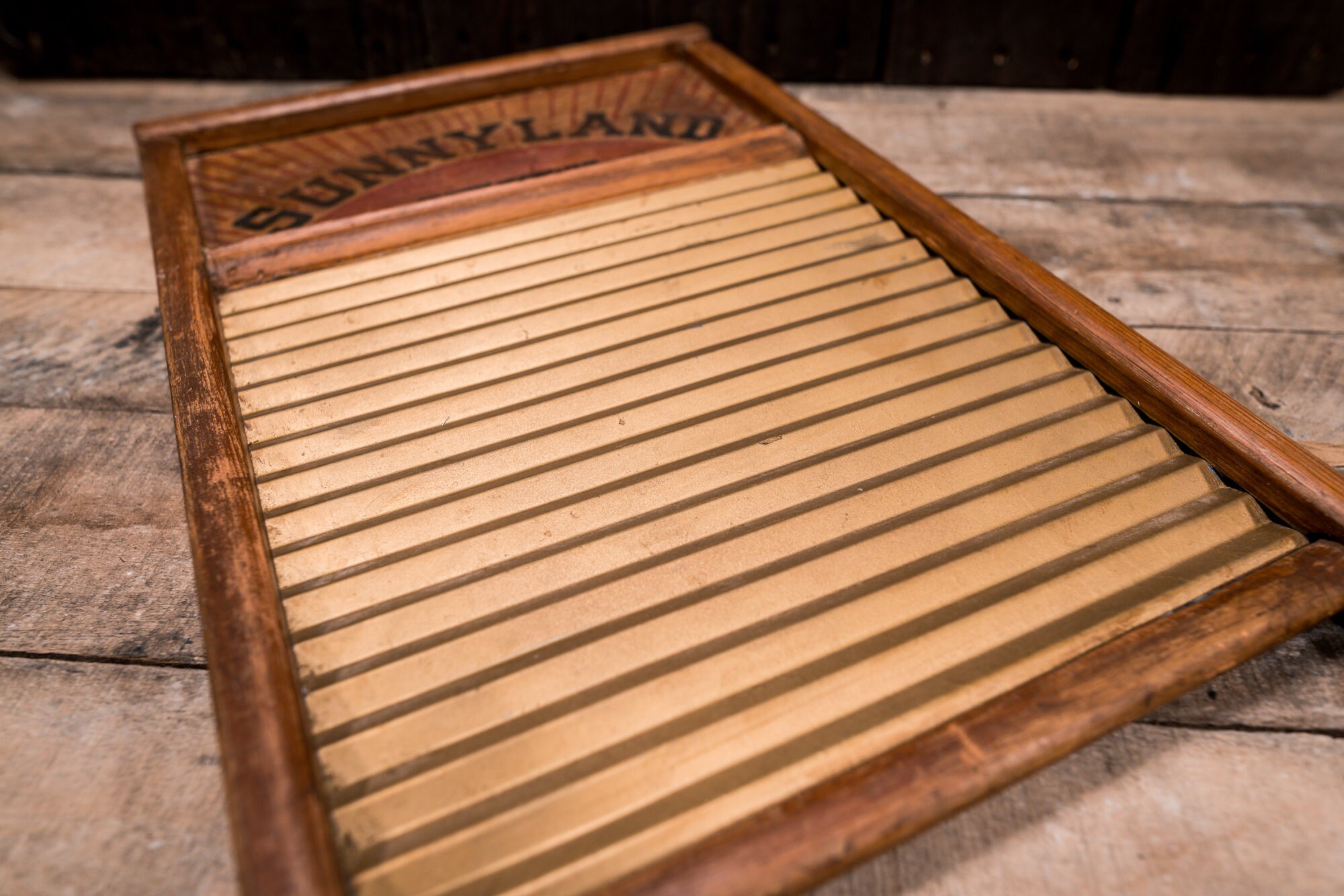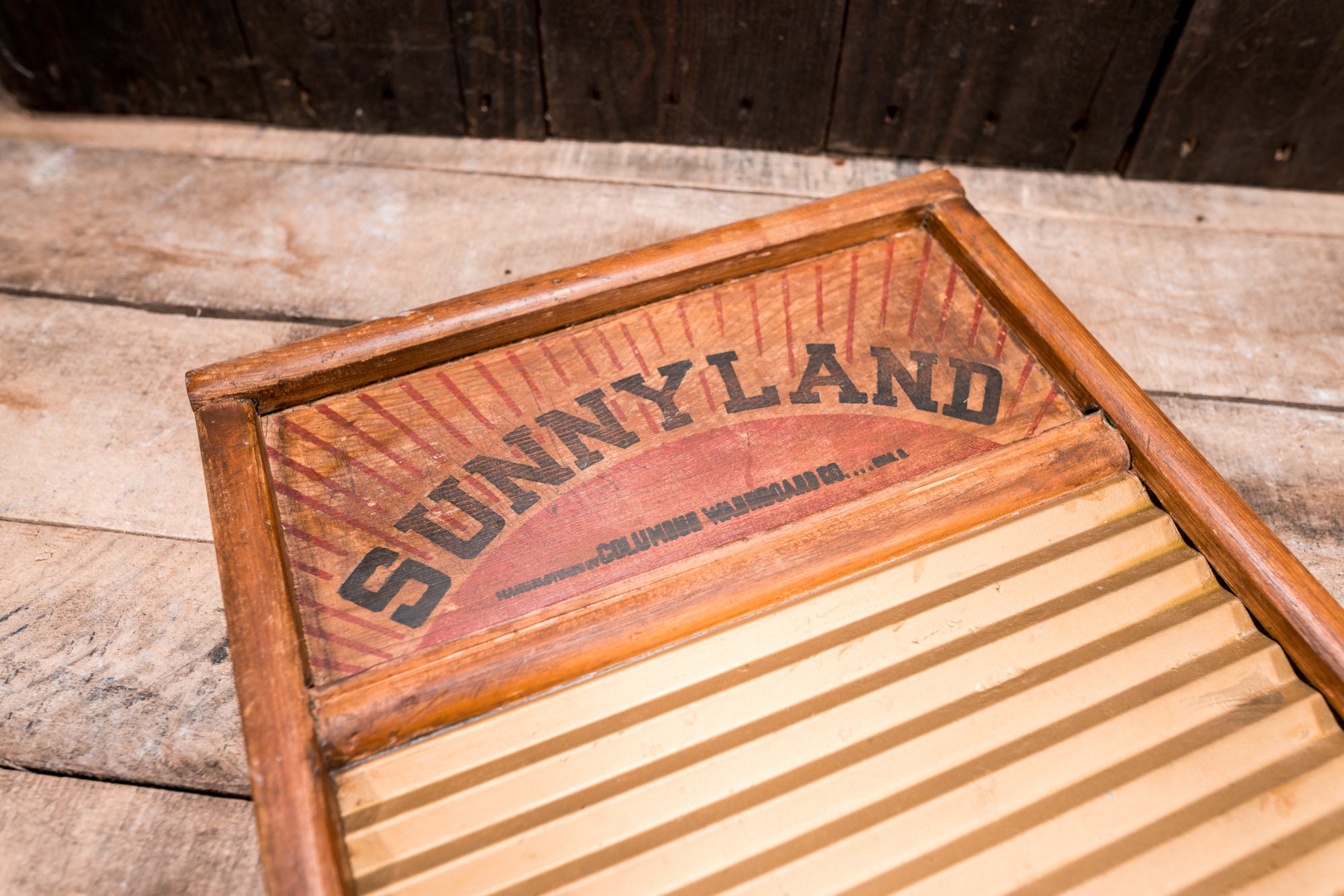 Take a look at this Sunnyland No. 2090 Washboard made by the Columbus Washboard Co. The font is in black but the rays of the sun are in red on the main side. The washboard does have some wear from being used but still in very nice shape. The galvanized metal is a gold color which you normally do not see many of. It is in pretty clean condition as you can see from the photos. It is approx. 24 x 12 1/2 x 1 1/2 inches. All in all a great looking piece to display. Please check out the photos for a closer look and if you have any questions please let me know. Thanks!