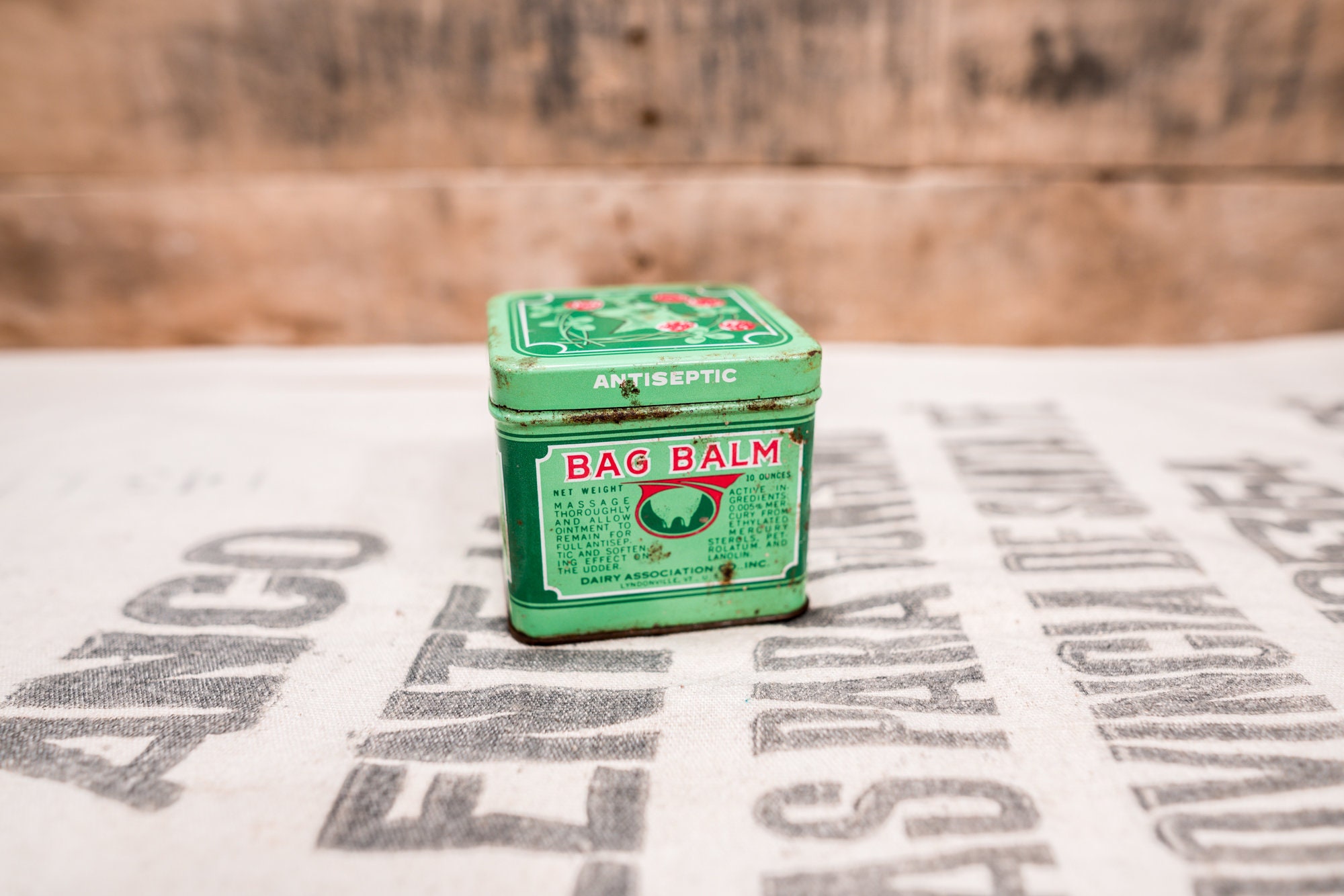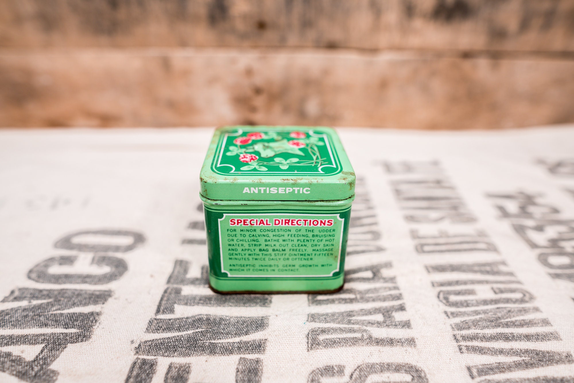 Check out this wonderful tin to display in your home. This tin is a Bag Balm Antiseptic Tin. The tin does have some wear, dents and scratches. It could also use a good cleaning. There is some rust as well and its approx. 3 1/4 x 3 1/4 x 2 3/4 inches. Please check out the photos for a closer look and if you have any questions please let me know. Thanks!