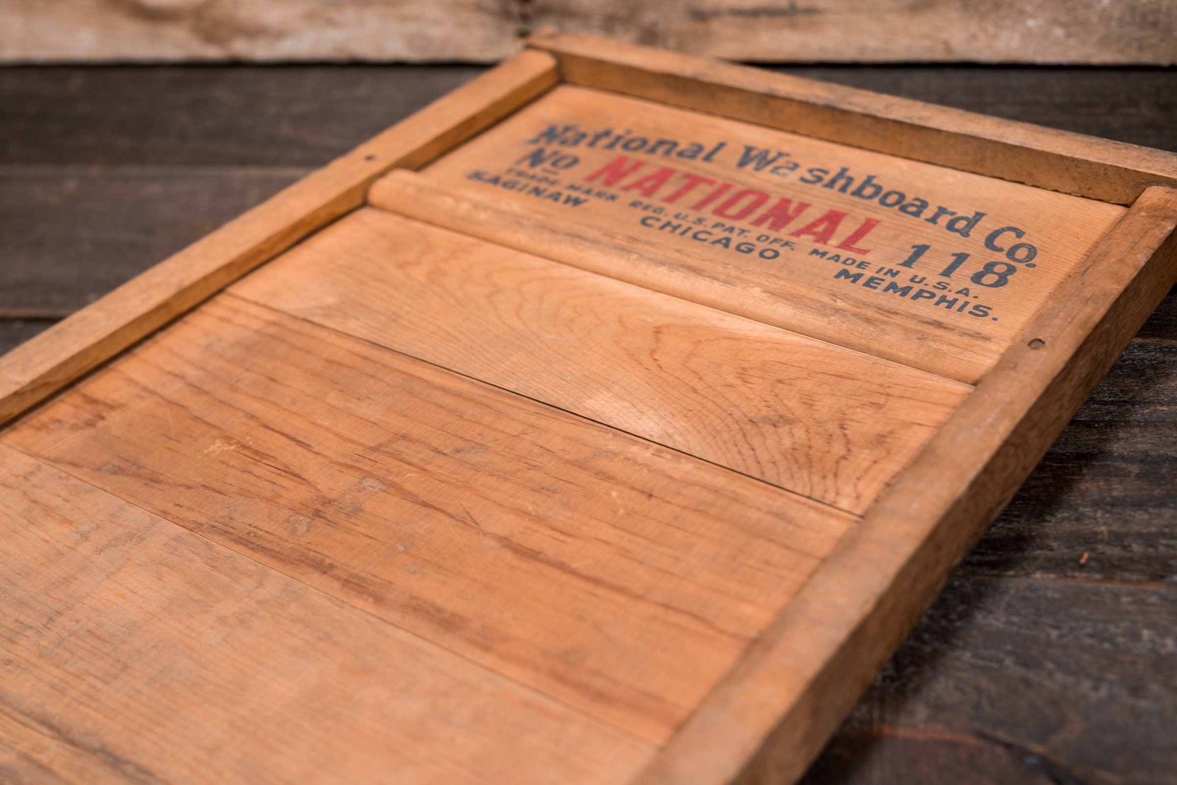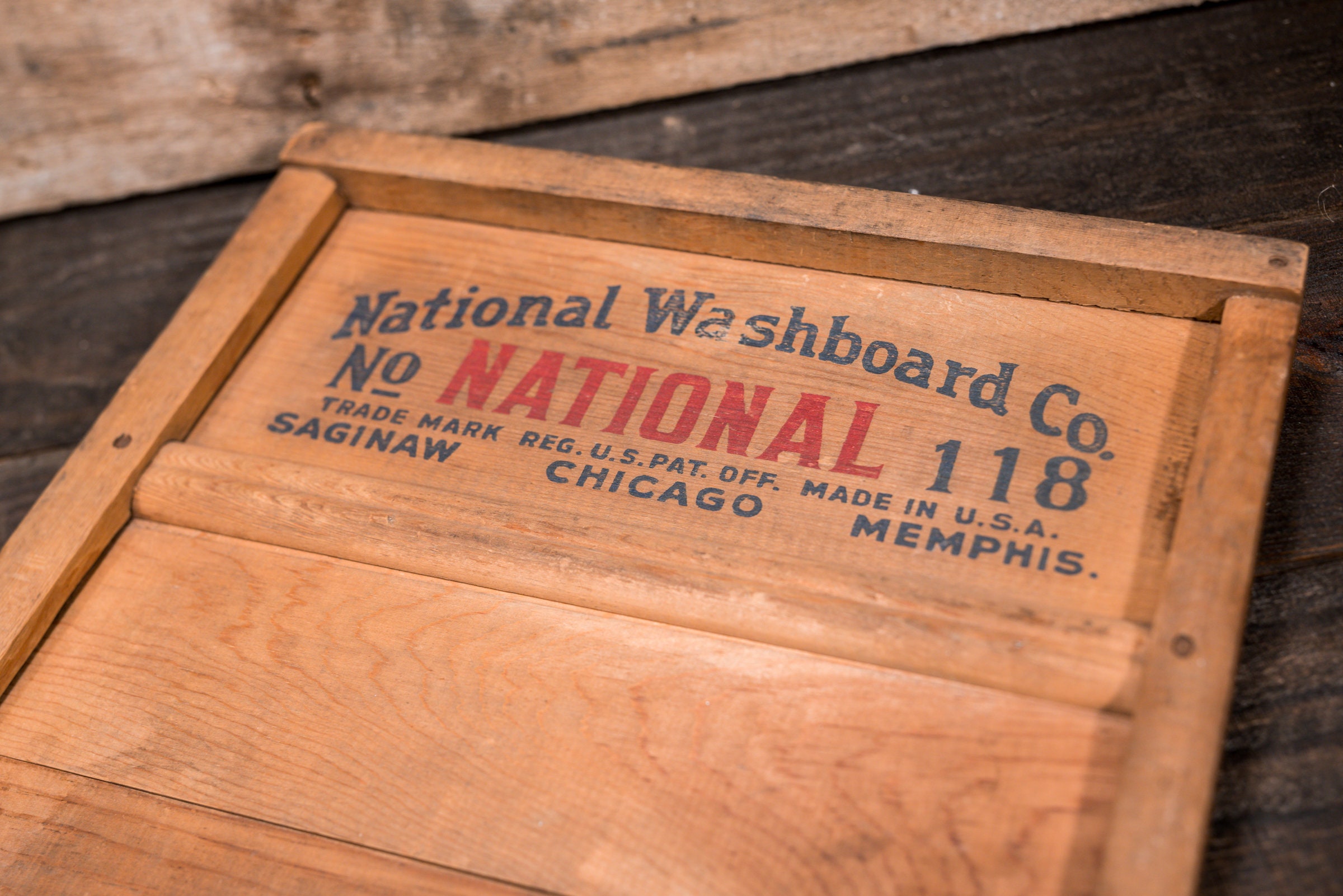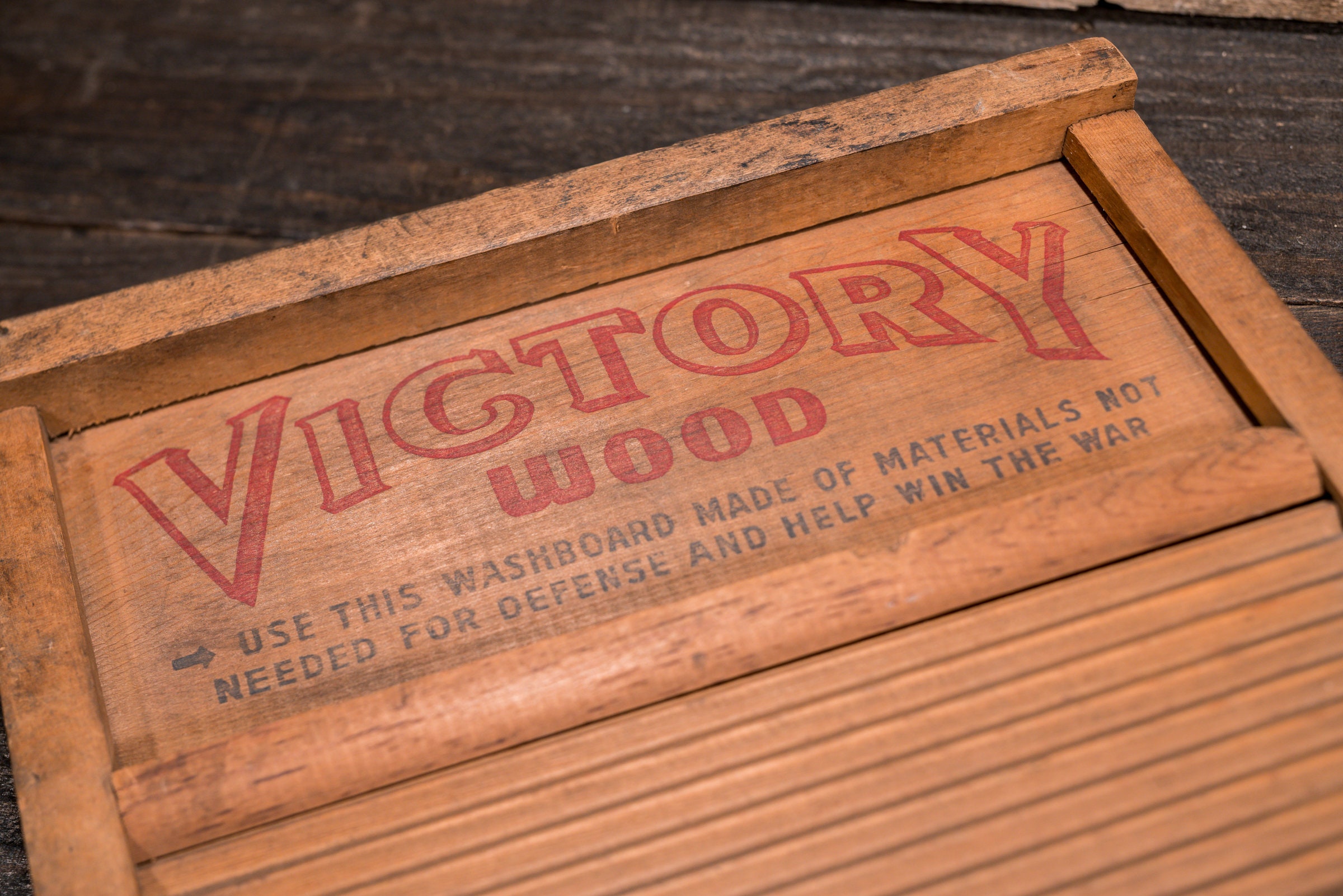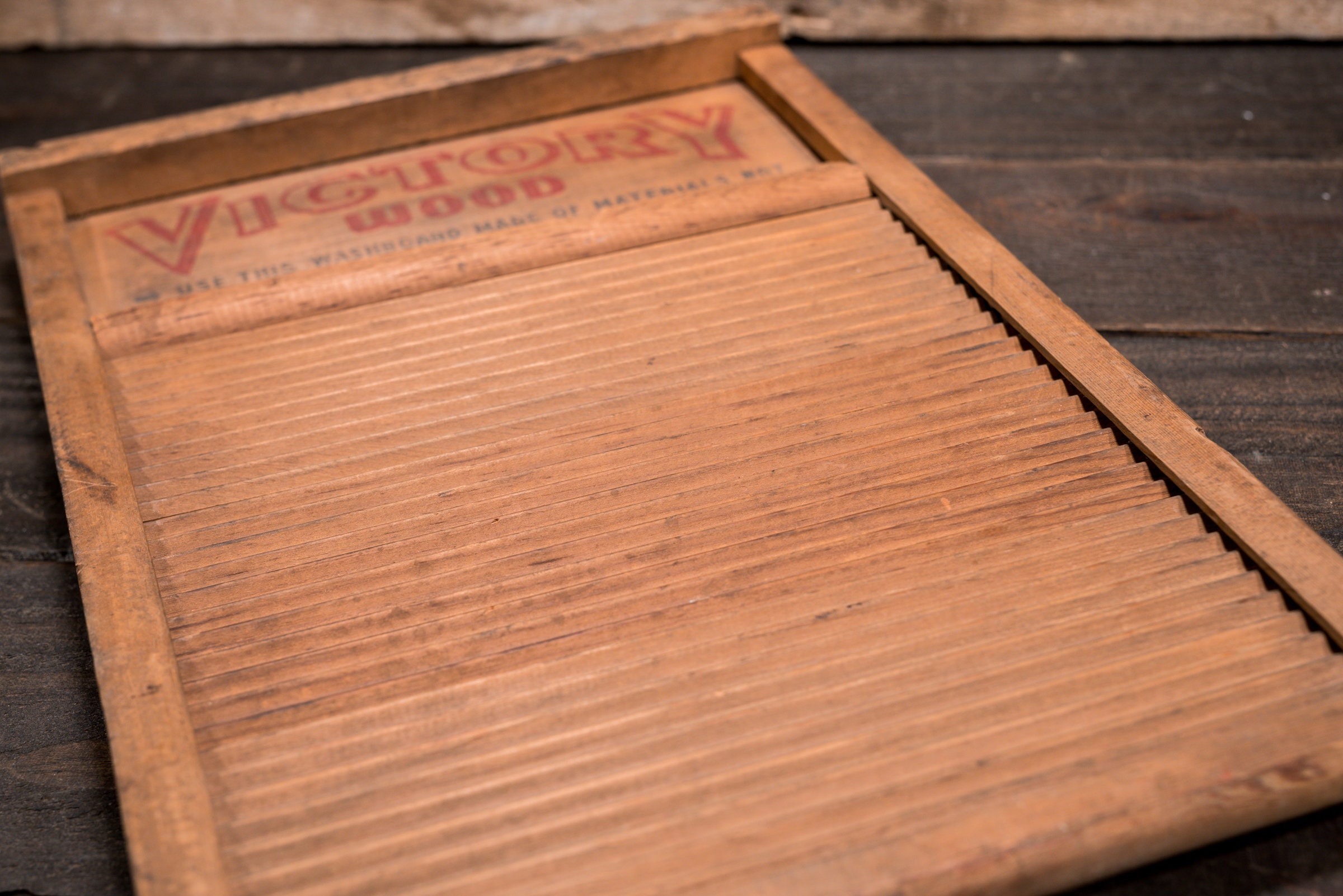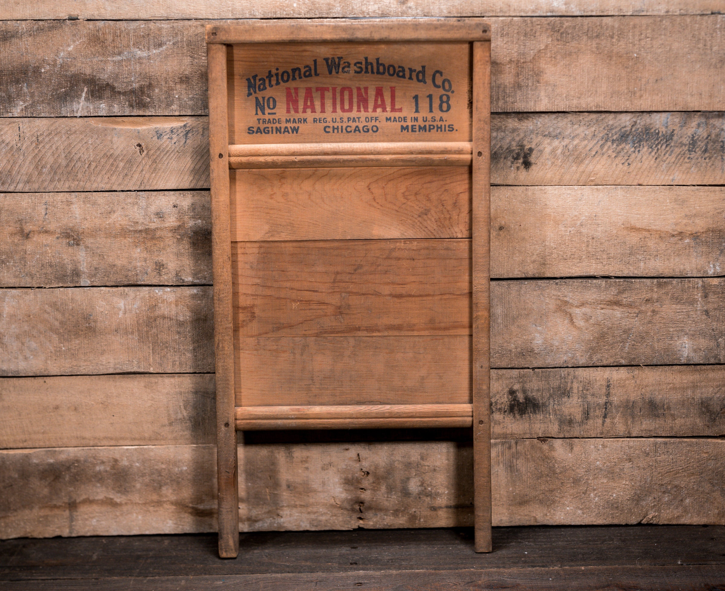 One of my favorite washboards we have found. This one is a National Washboard No 118 and what makes this one rare is that its from WWII which as you can see its all wood to save on metal. The back says "Victory Wood". It is approx. 24 x 12 1/2 x 2 inches. It does have some wear, scratches and some slight fading on the graphic but nothing major. These are awesome to display in a laundry room or mudroom. Please check out the photos for a closer look and if you have any questions please let me know. Thanks!